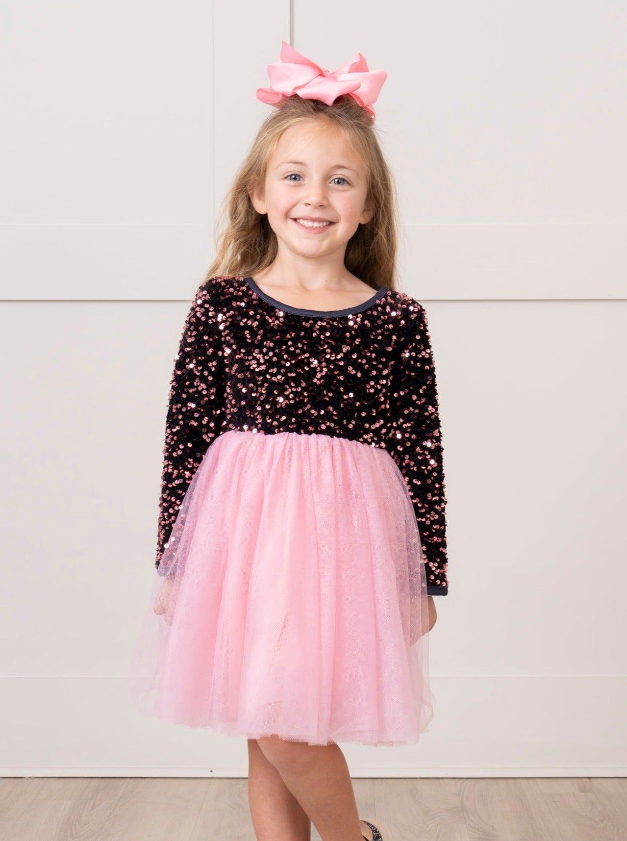 Perfect for every event on your holiday social calendar, this dress features a sparkly iridescent sequins and a fully lined soft pink tulle skirt! Party, party, party!