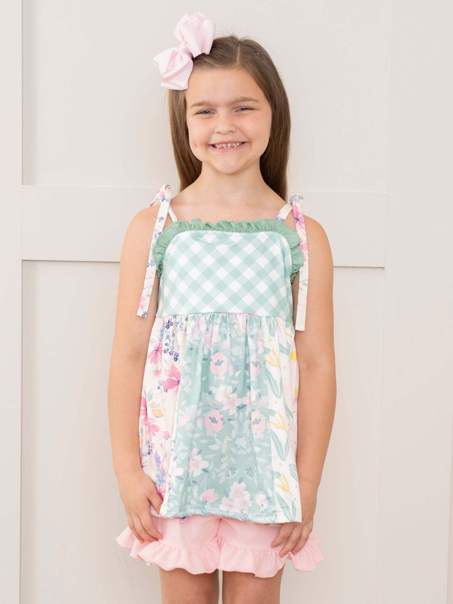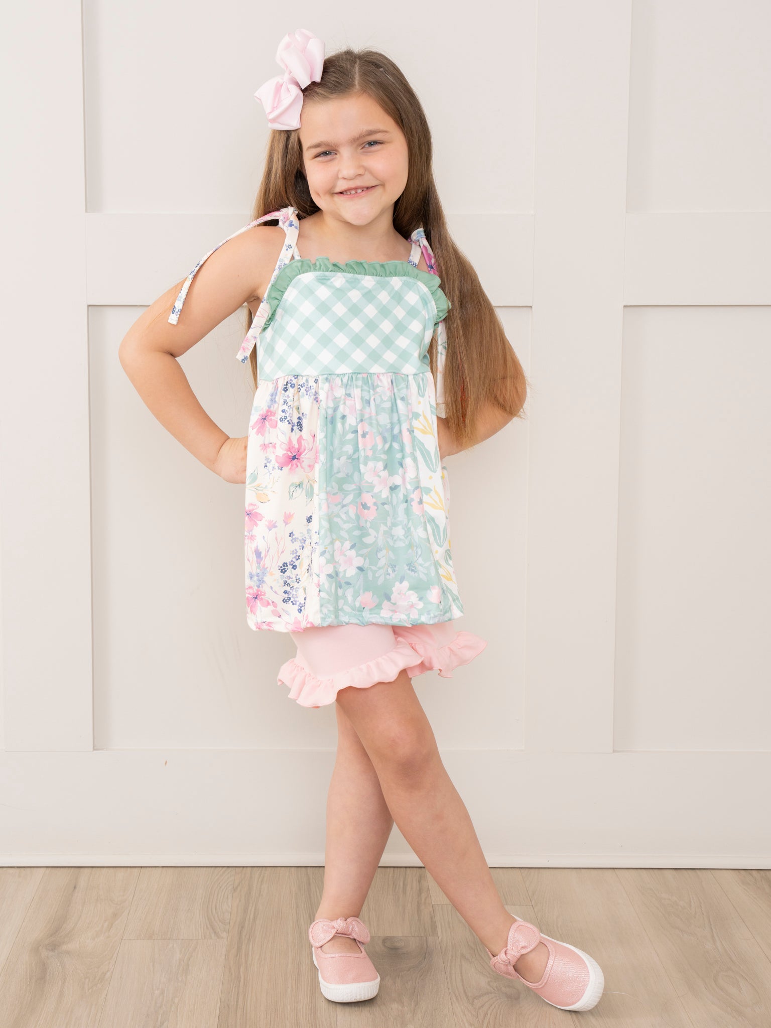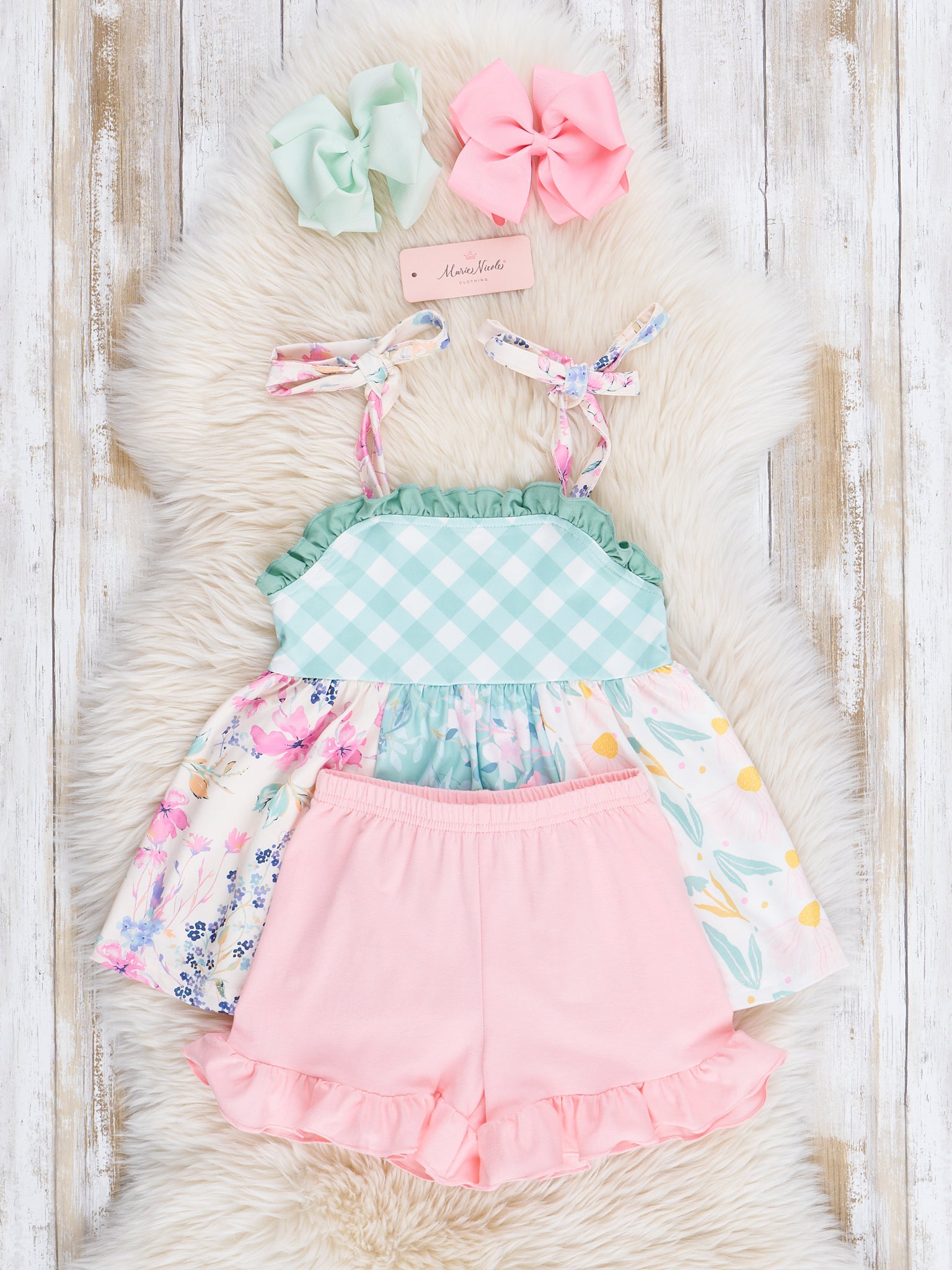 Join the garden party with our Pink & Green Gingham Garden Sister Set! This ruffle outfit features a vibrant green ruffle trim  top with a charming gingham bodice & floral print bottom. With the pink ruffle hem shorts, this outfit is perfect for any occasion. Your little will feel effortlessly stylish in this unique and fun piece!