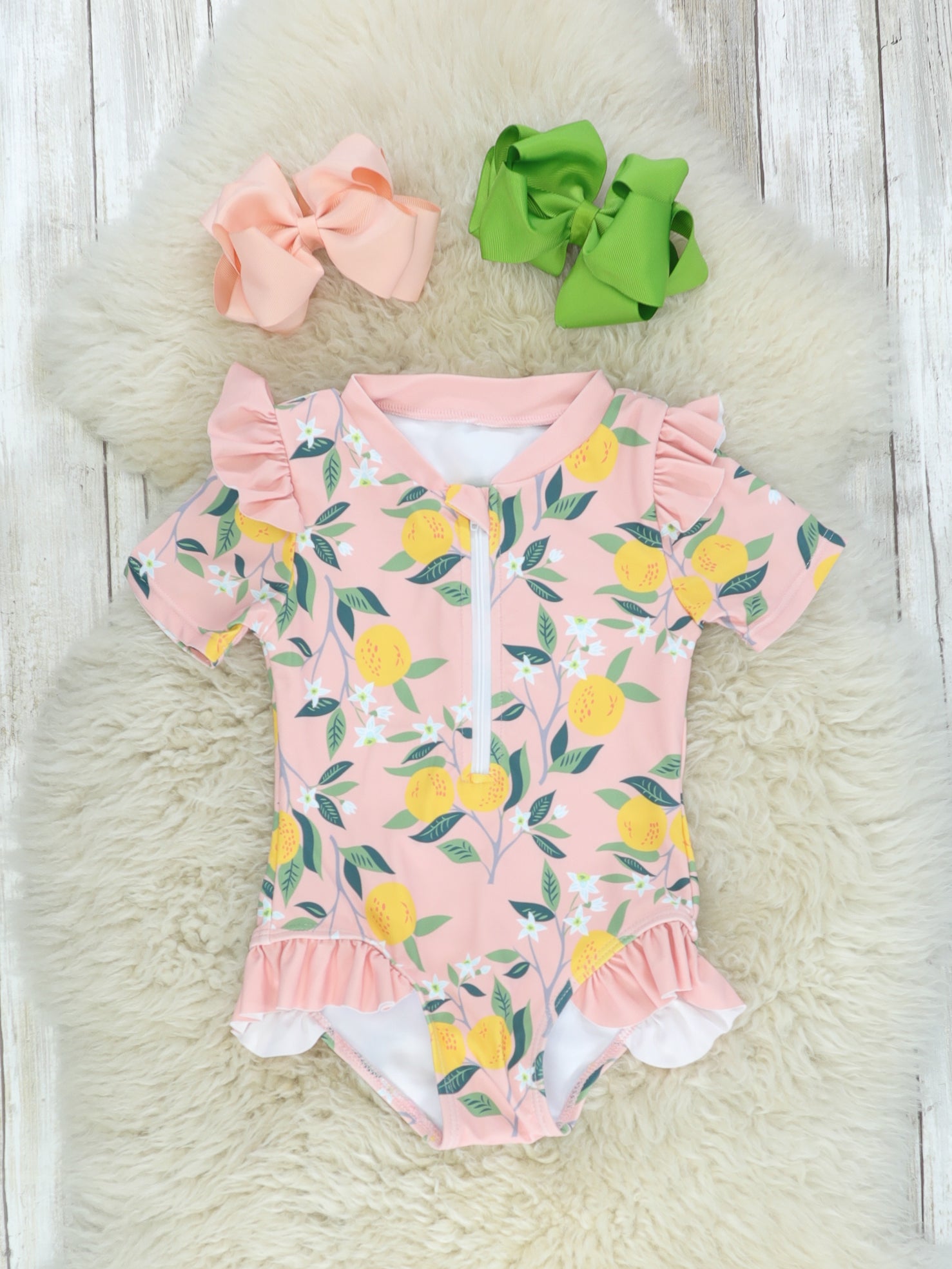 This little swimsuit is perfect for drinking lemonade by the pool during summertime! This peach-colored one-piece features a pretty lemon pattern, ruffle trim, and a zipper.