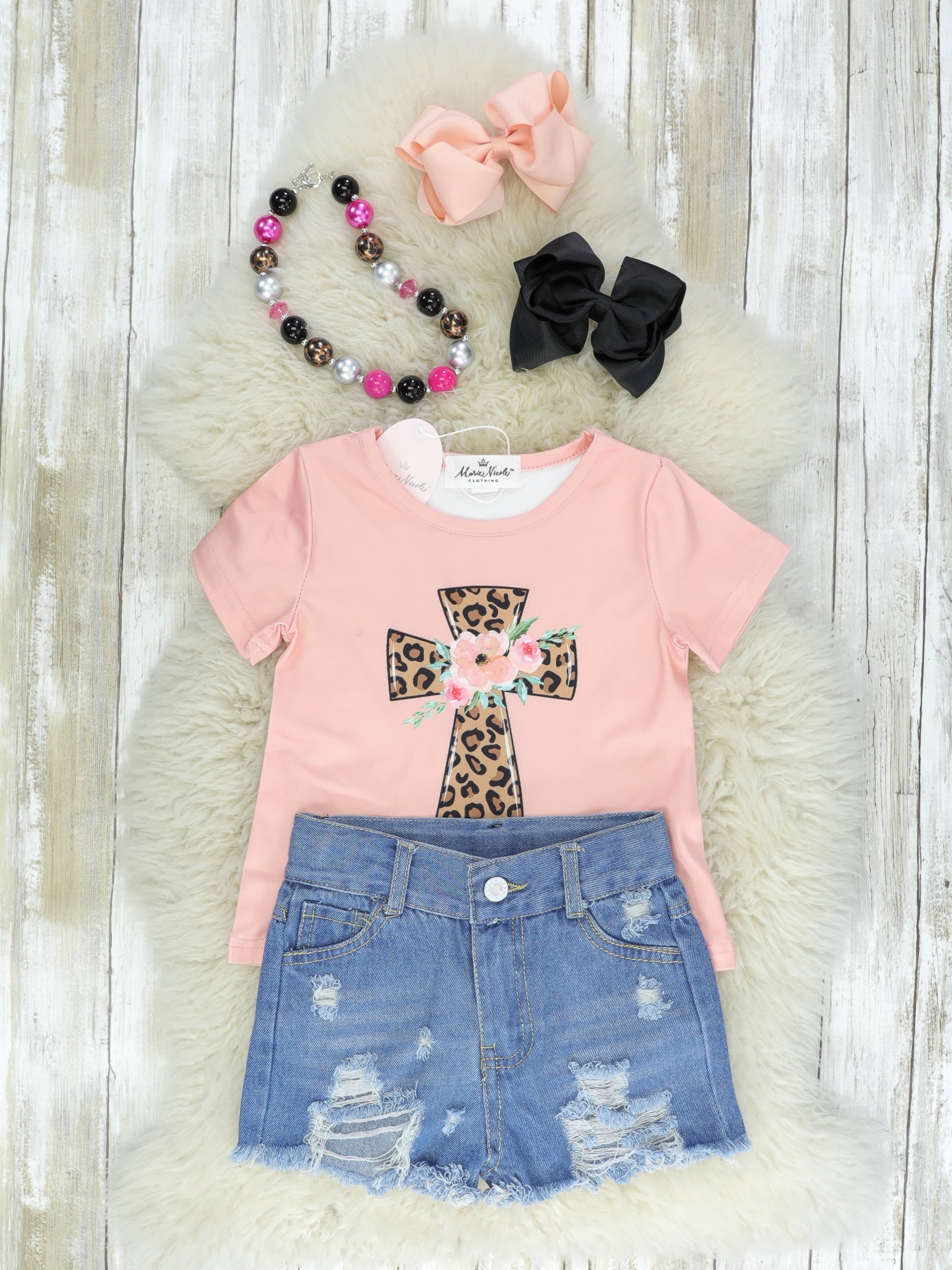 The most adorable cute & comfy outfit! This pink shirt features a leopard floral cross detail & is paired with light wash denim shorts.