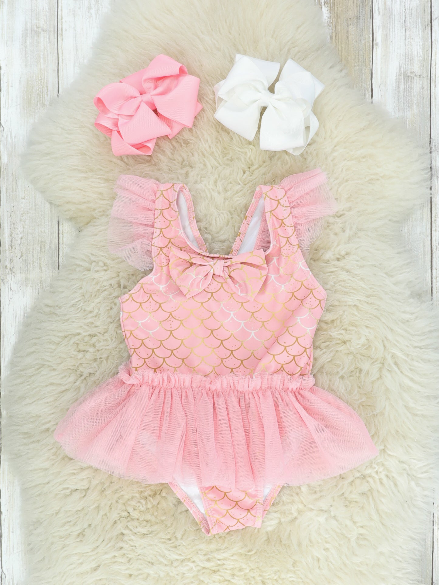 Perfect for your little who loves to think of herself as a mermaid every time she swims! This one-piece features tulle details, gold accents, and a bow.