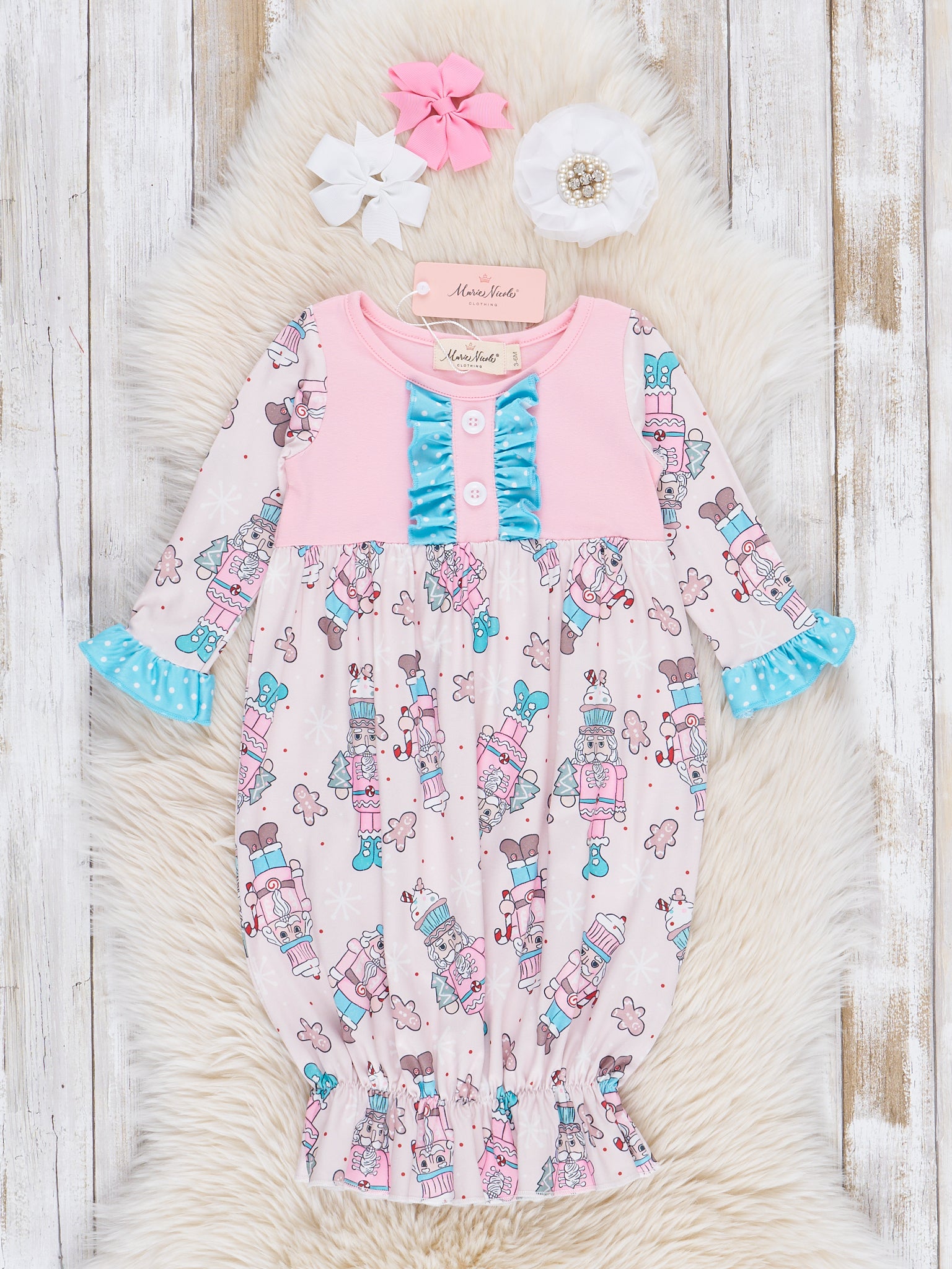 Get ready to dance with the Sugar Plum Fairy in our Pink Nutcracker Ruffle Gow! The playful pink bodice and nutcracker print open bottom will delight your little one, while the ruffle trim adds a touch of whimsy. This dress also comes in a sister set for even more fun!
