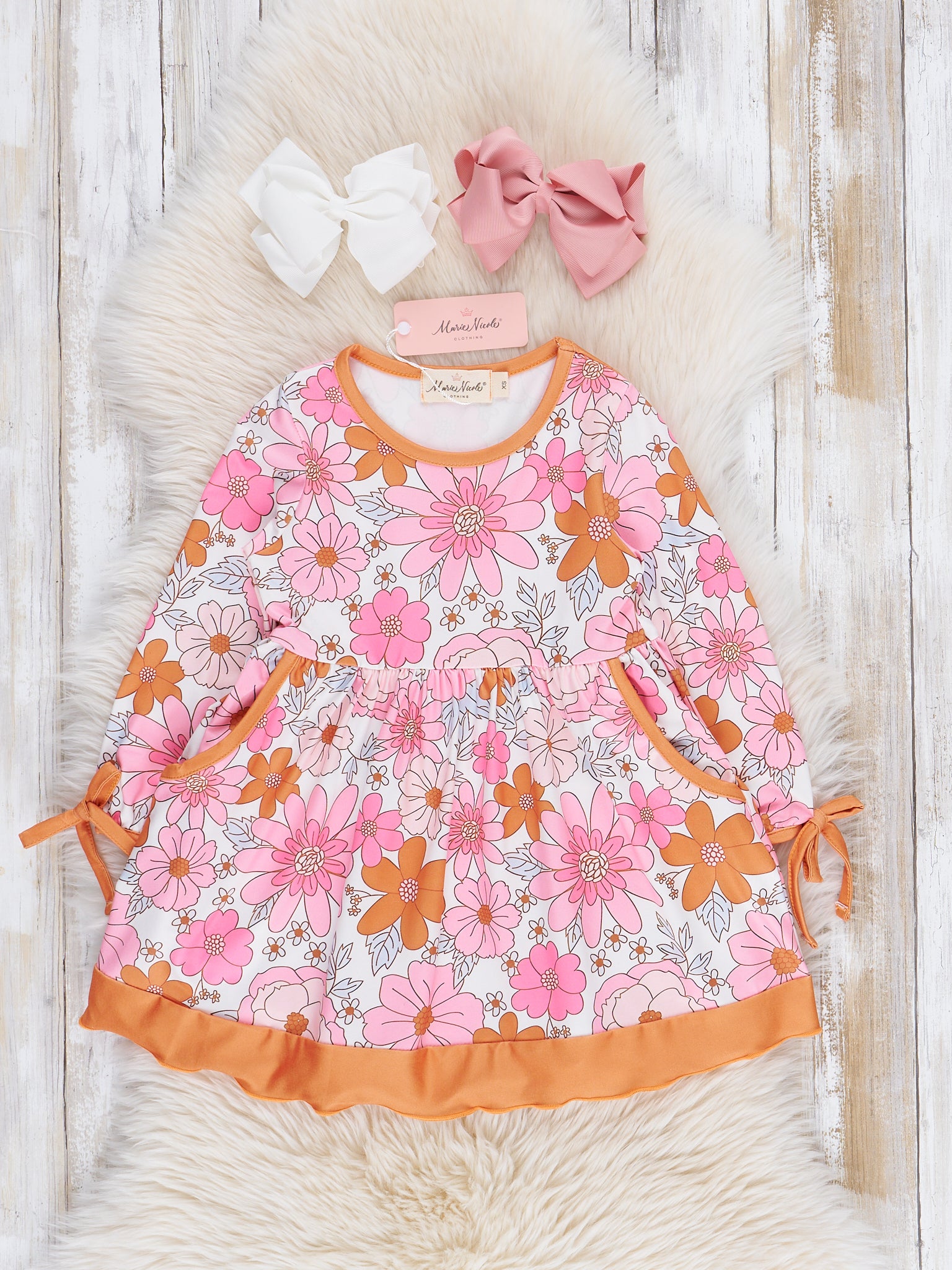 Add a pop of color to your little girl's wardrobe with this Pink & Orange Marigolds Dress. Perfect for autumn, this playful dress features vibrant pink & orange marigolds and an orange trim. She'll be the talk of the playground!