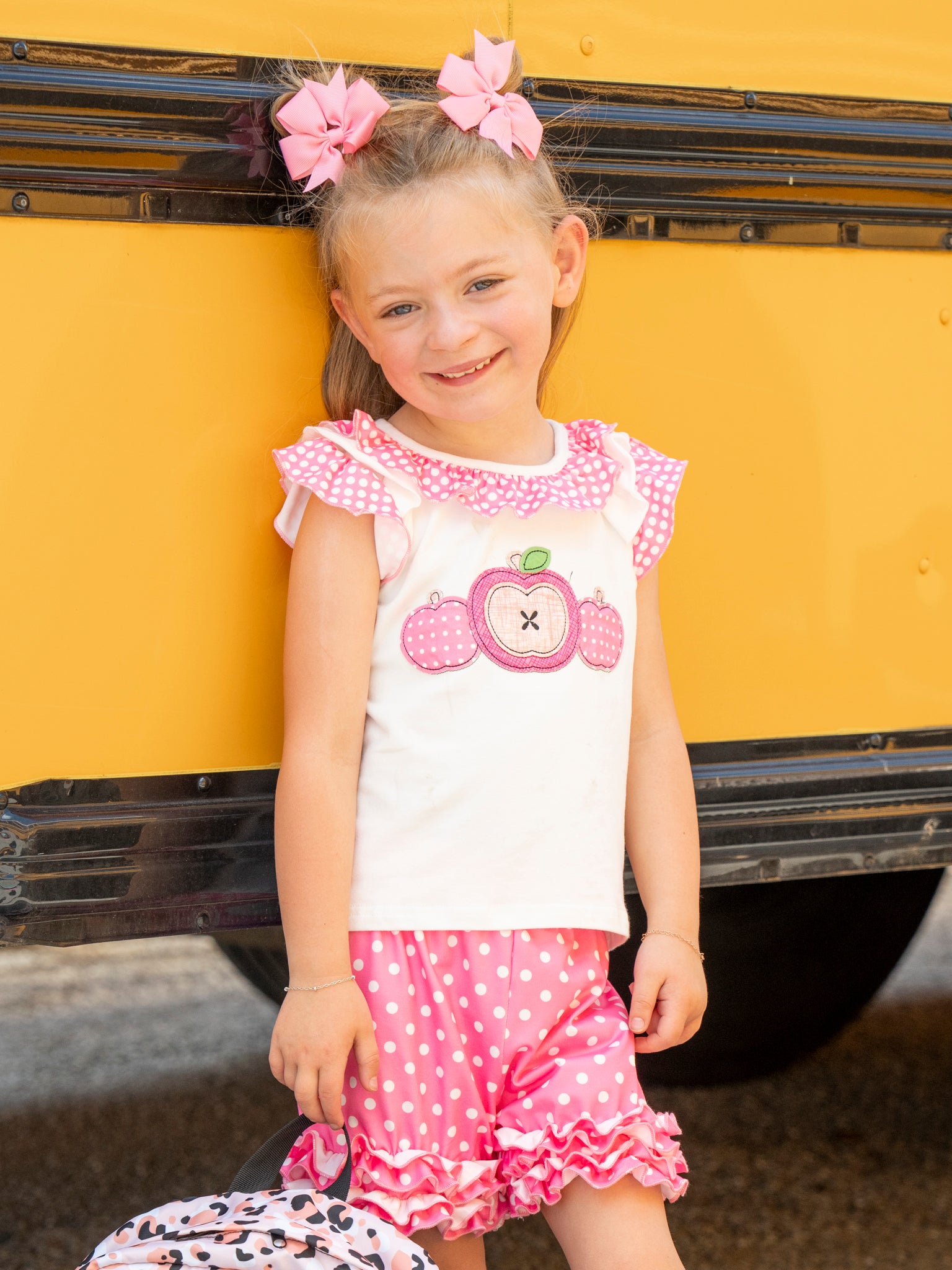 This Pink Polka Dot Apple Ruffle Outfit is perfect for your little one's wardrobe. They'll look cute and feel comfy in the white ruffle top, pink polka dot shorts, and elastic waistband with a subtle apple appliqué. Ruffle up your kiddo's style!