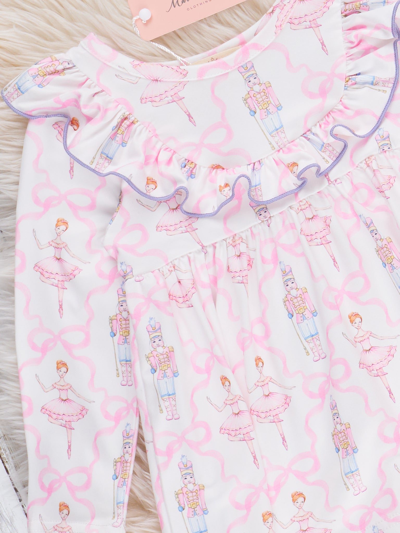 Add some festive flair to your little one's wardrobe with our Nutcracker Bows Ruffle Outfit. Perfect for Christmas celebrations, this girls' outfit features a charming print of nutcrackers and fairy princesses adorned with bows. Plus, it comes in a sister set for coordinating siblings. Sleigh all day with this adorable outfit!