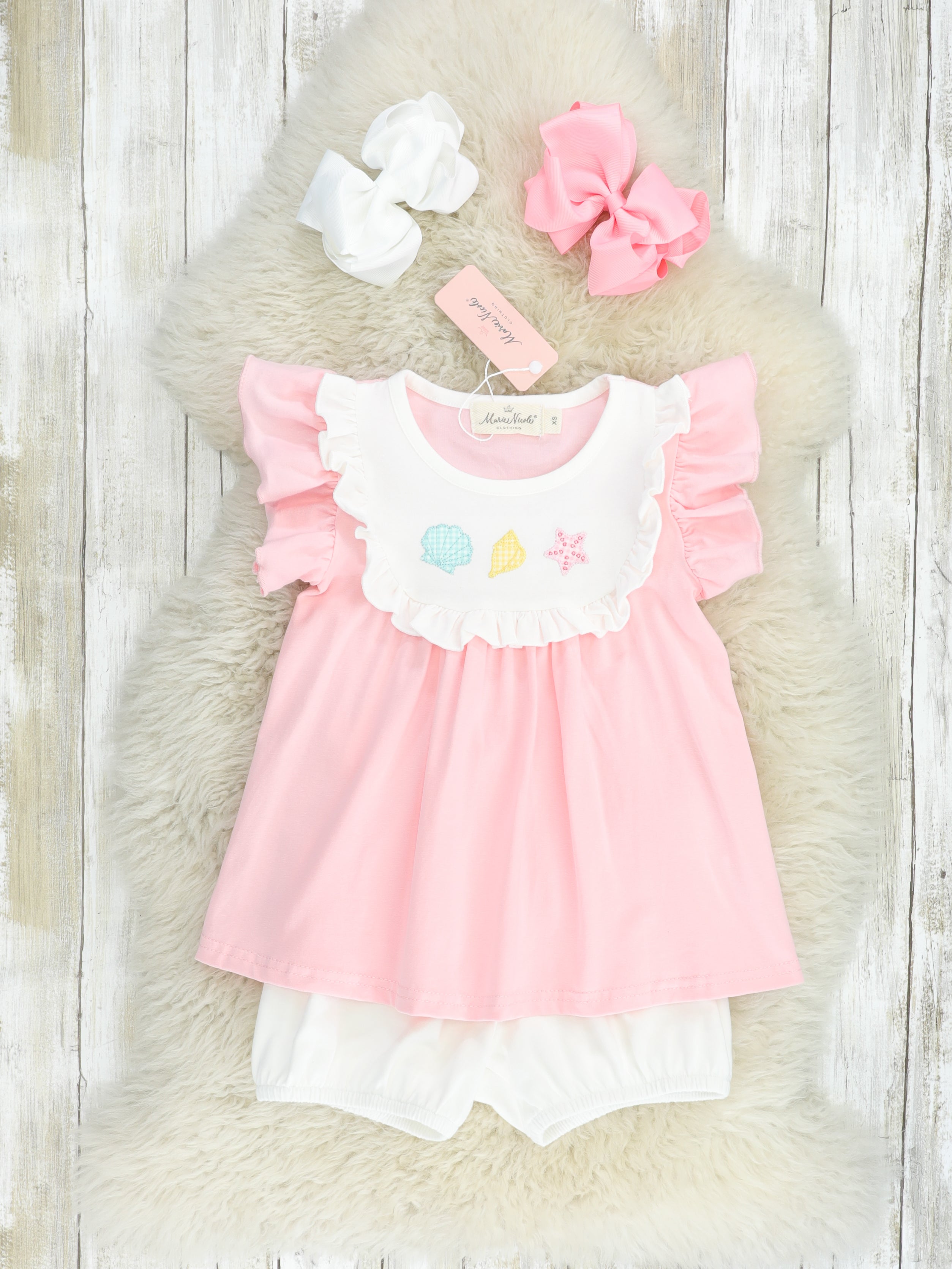 A special sister set for your FINtastic girls! This outfit features pink tunic with ruffle trim, a bib collar, embroidered sea shells, & white ruffle shorts with an elastic waistband.