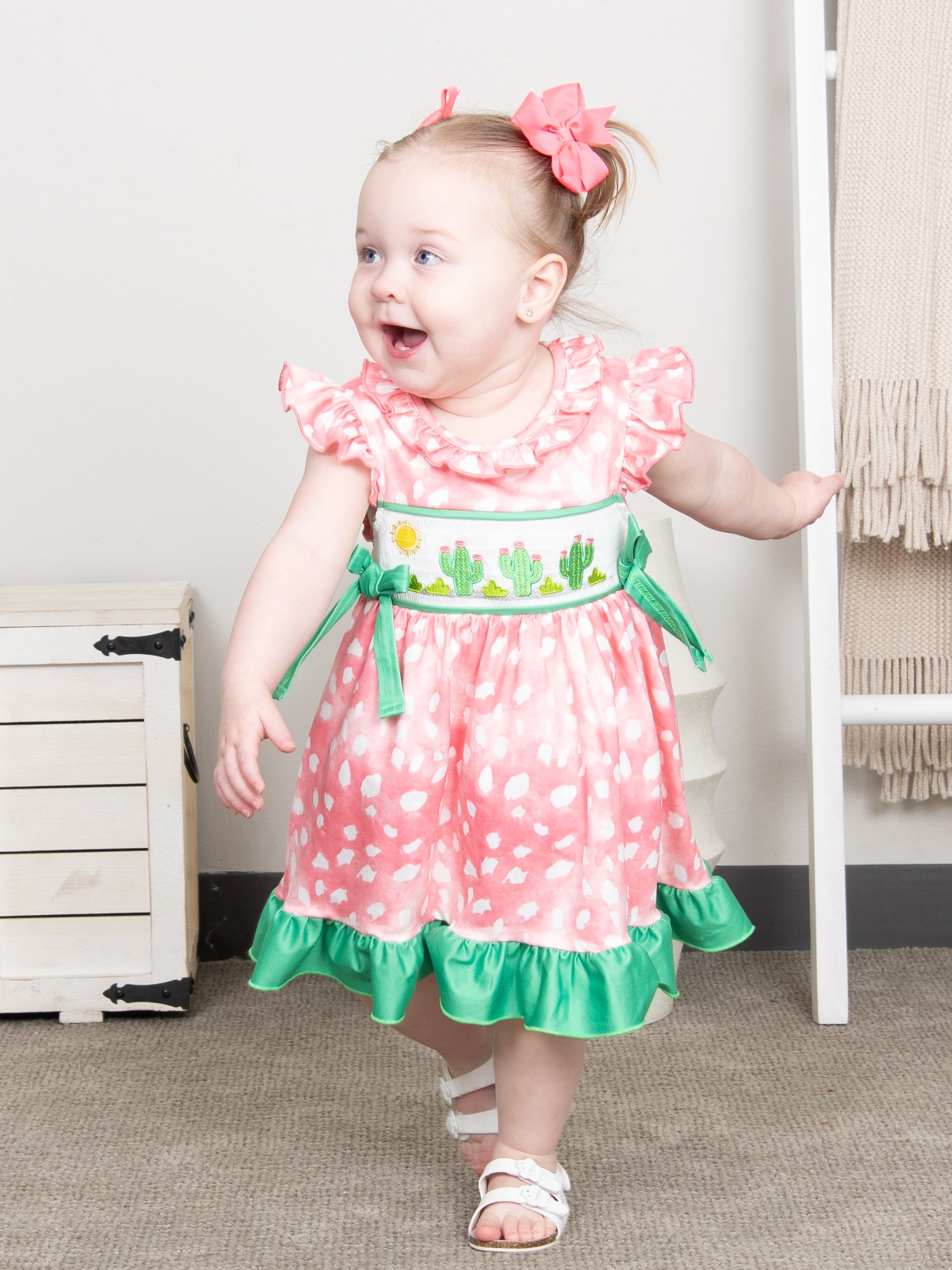 Your girls will be looking sharp in this darling sister set! This pink dress features smocking, embroidered cacti, a round ruffle neckline, flutter sleeves, bow details, & green ruffle trim.