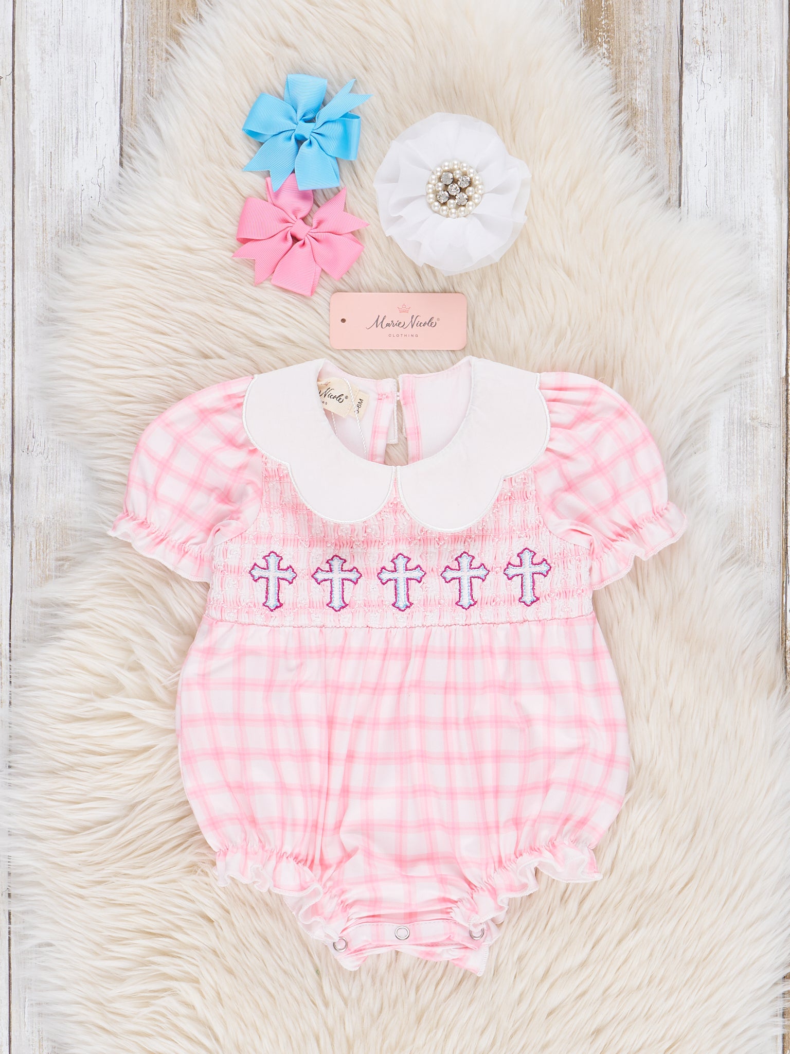 Your little one will be simply precious in this Pink Smocked Crosses Ruffle Bubble by Marie Nicole Clothing! With delicate embroidered crosses over smocking and a scalloped collar, this girls bubble is perfect for Easter. The puff sleeves and pink gingham add an extra touch of charm. Don't forget the matching sister set!