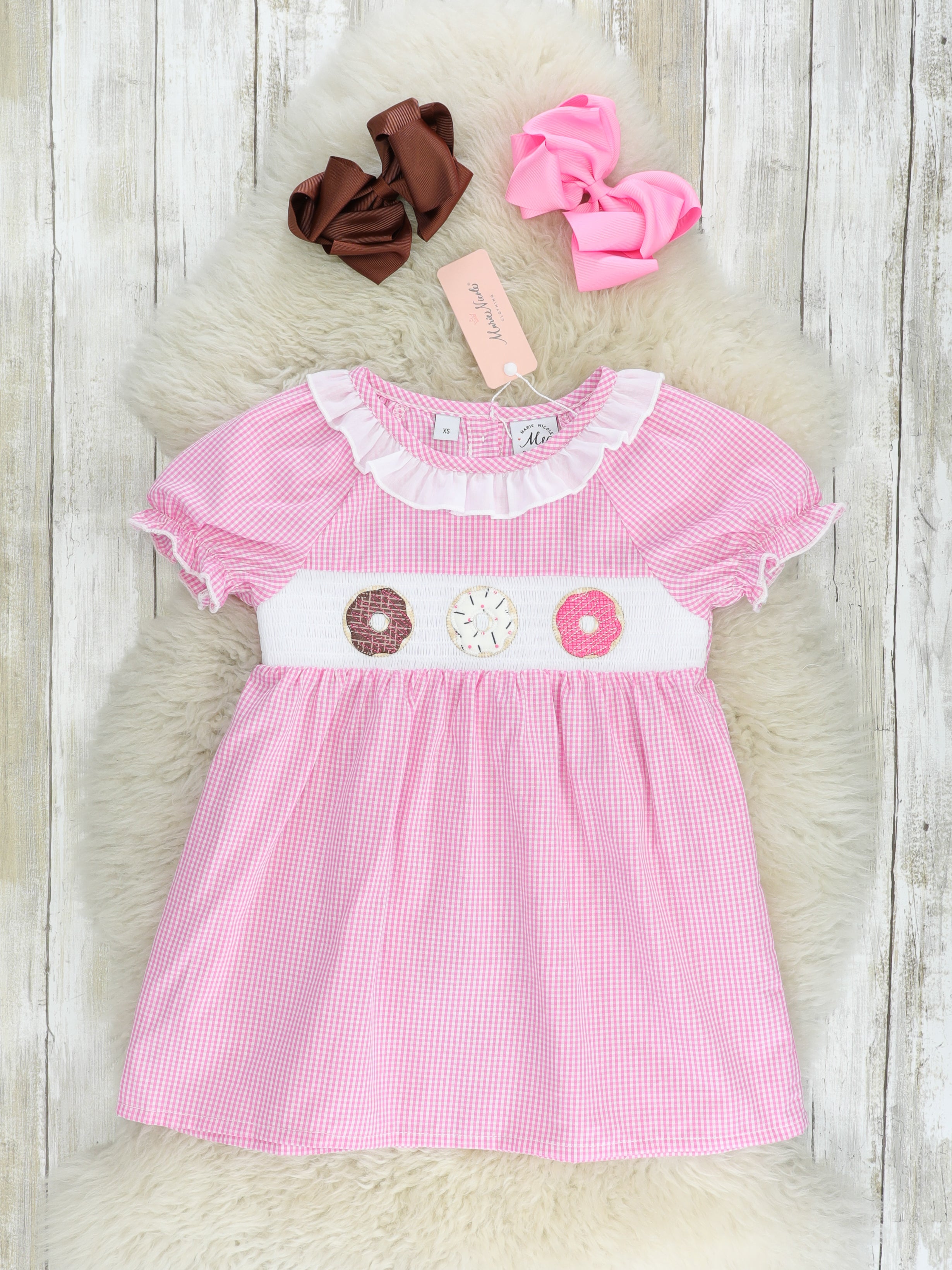 DONUT fear- This aDOUGHrable sister set is here! This pink dress features smocking, a round ruffle neckline, & embroidered donuts.