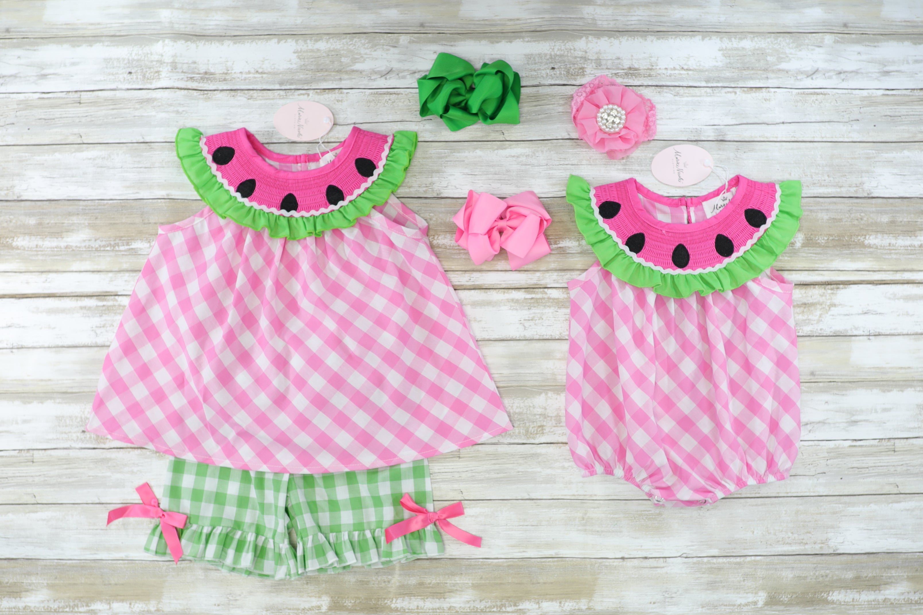 Take a bite out of life in this sweet sister set! This bubble features a smocked neckline with little embroidered seeds. We love the plaid print too!
