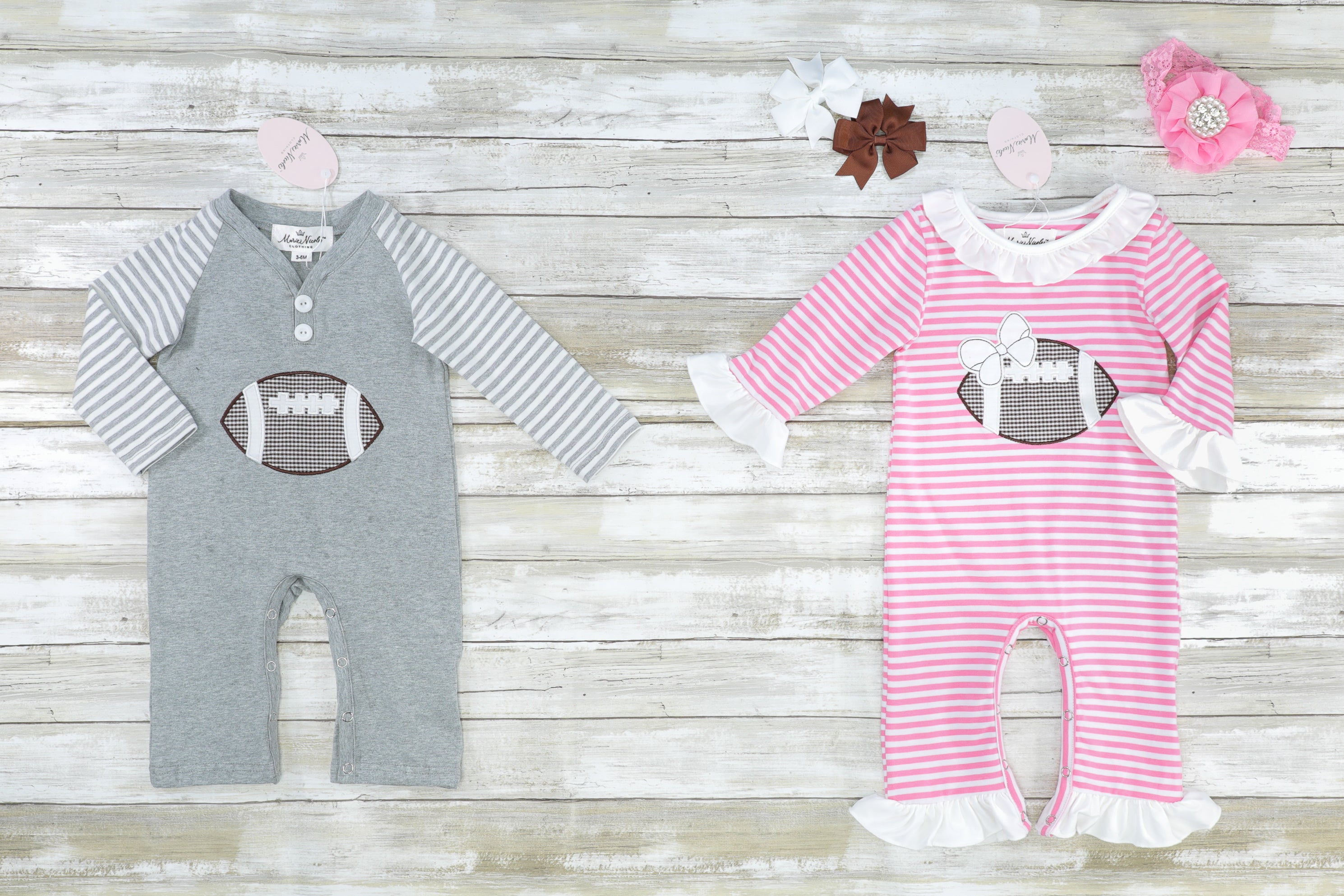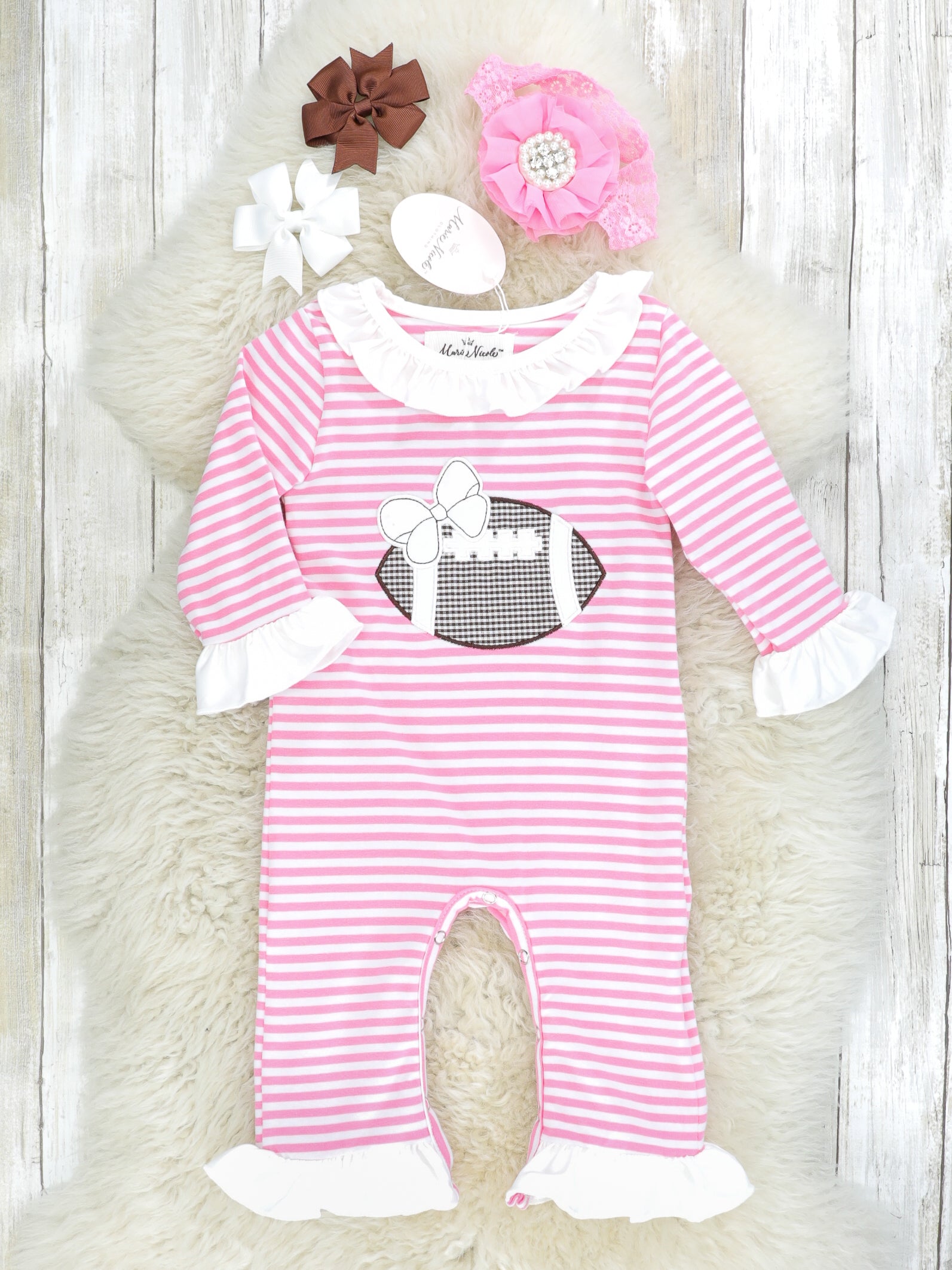 Ready... Set... Hut! This adorable sibling set is perfect for your football kiddos! This pink striped romper features ruffle details, a football appliqué, & a round ruffle neckline.