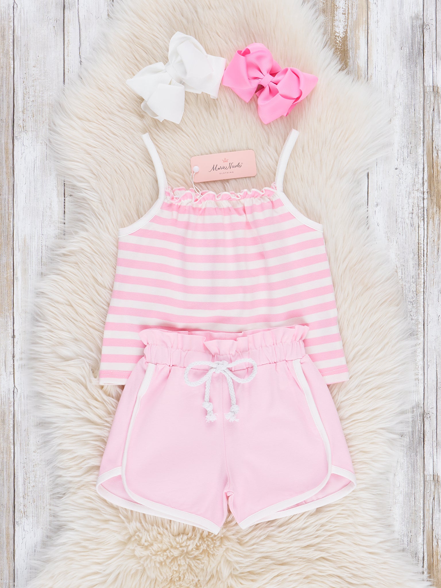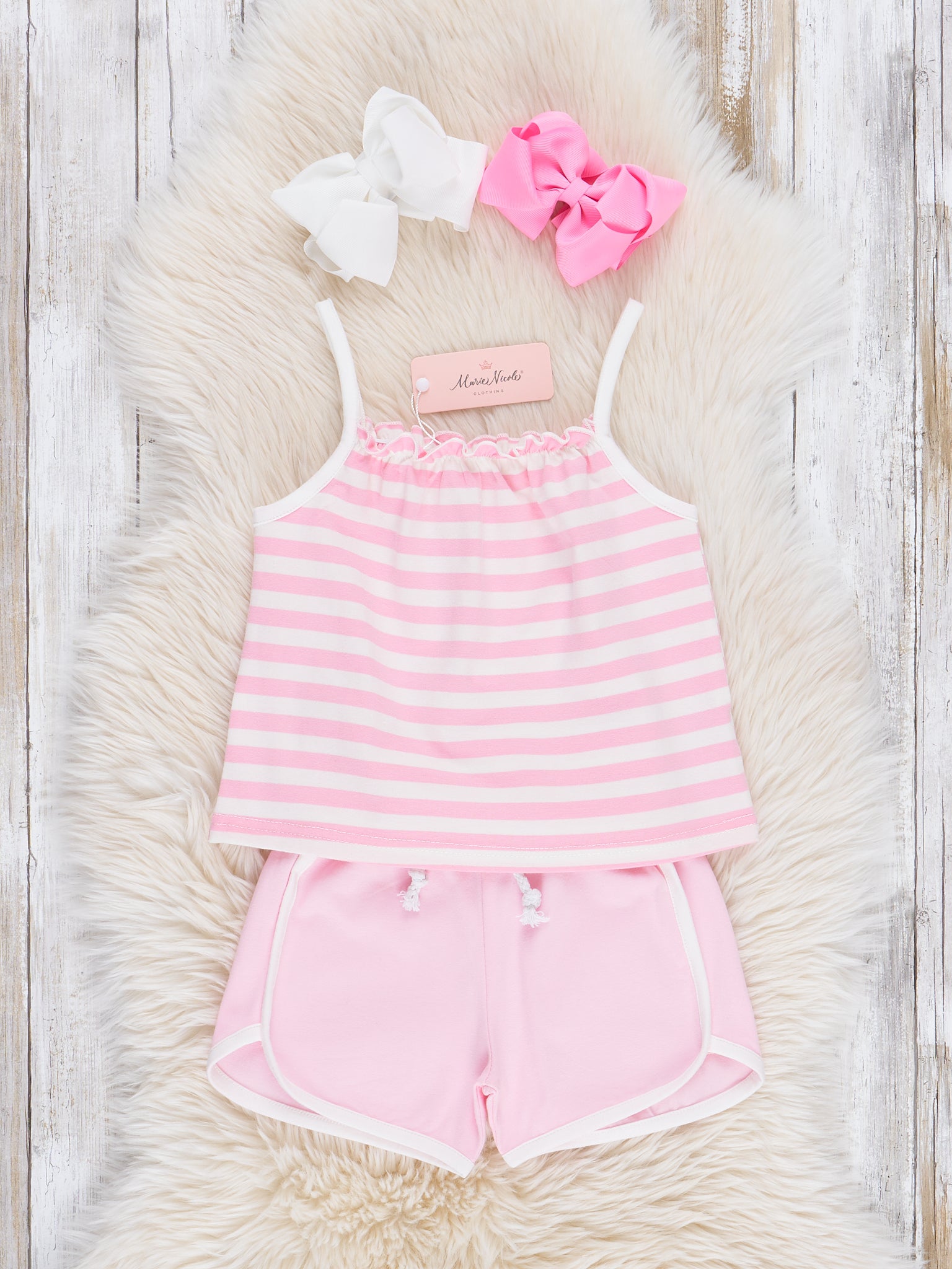 rJump into the game with this Pink Striped Pickleball Outfit! Designed for girls, this outfit features a comfortable pink striped top with elastic detailing and sporty pink shorts. Perfect for playing pickleball (or just looking cute on the court), this outfit is made by Marie Nicole Clothing.
