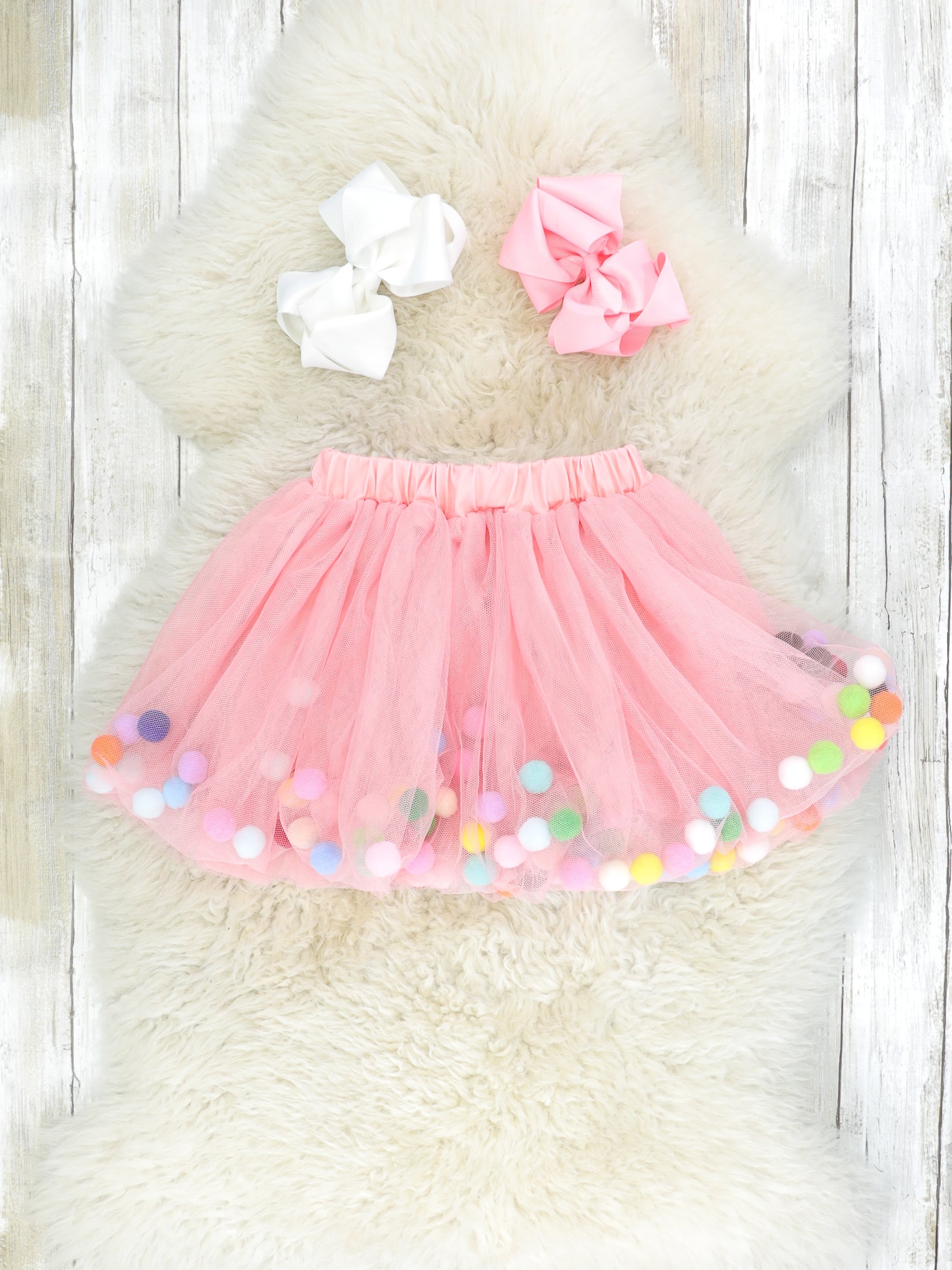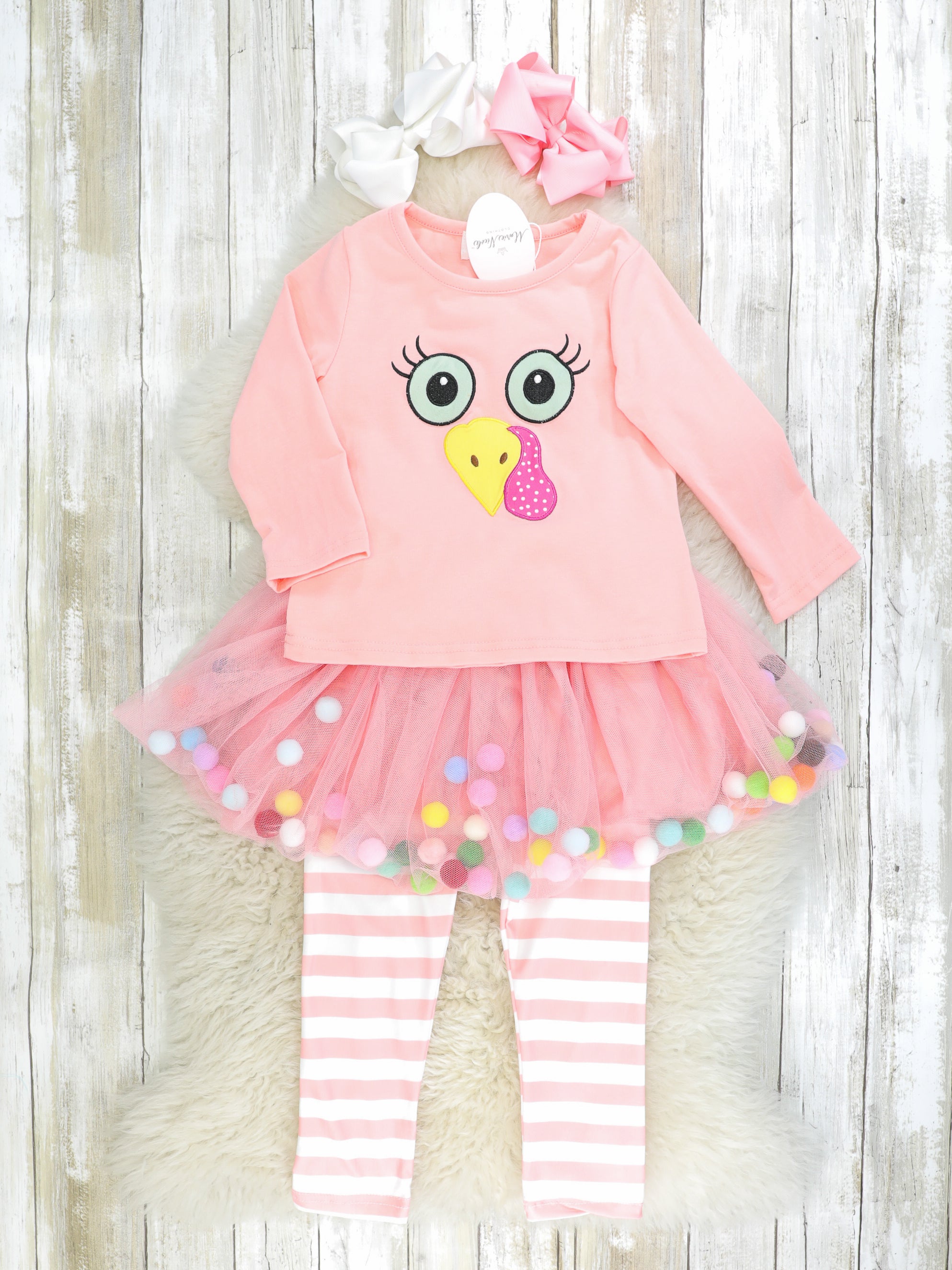 This turkey outfit is tulle cute! This outfit features a pink turkey top with striped leggings & a tulle pom pom skirt with an elastic waistband.