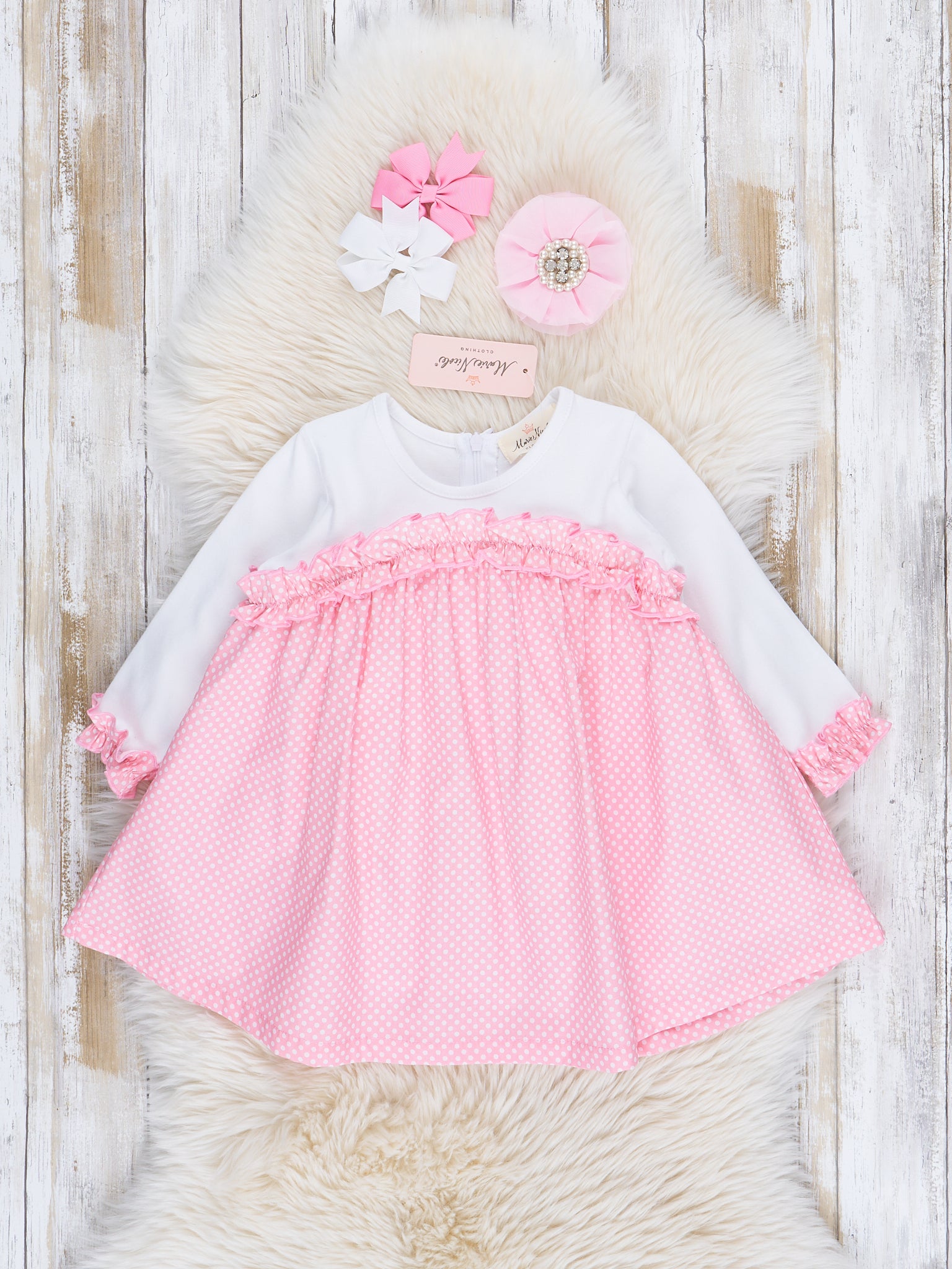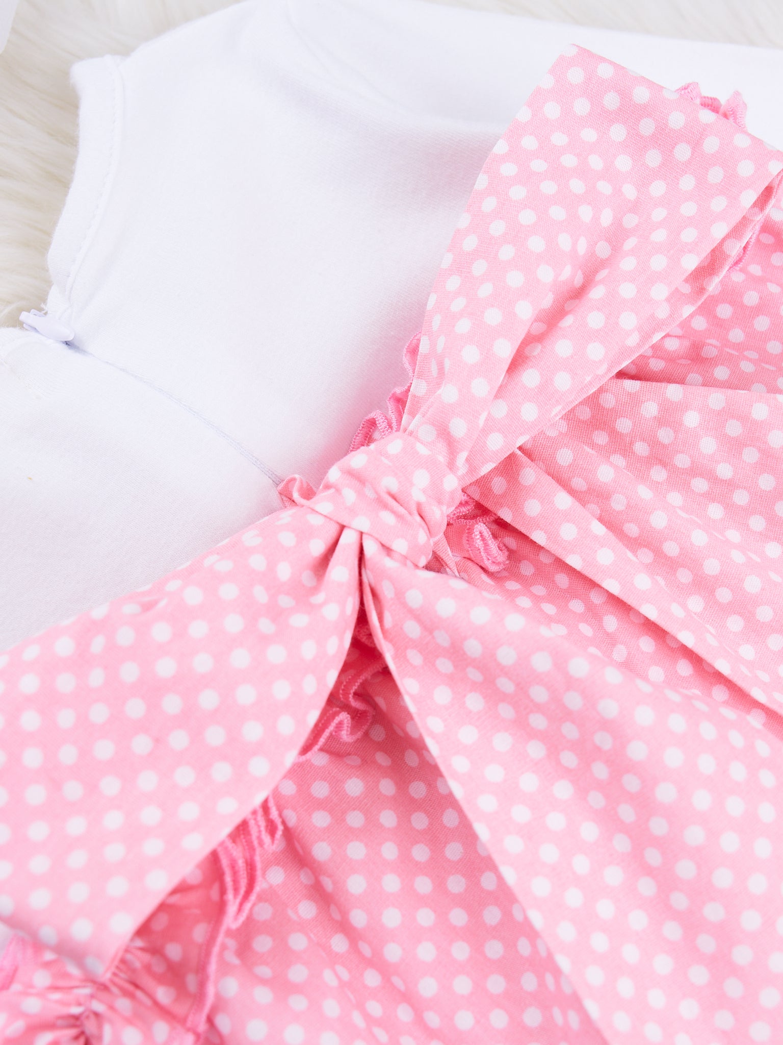 This dress is a delightful masterpiece, featuring a classic pink and white polka dot pattern that's both fun and elegant. But what truly sets it apart is the charming bow detail at the back, adding a touch of sweetness and sophistication.