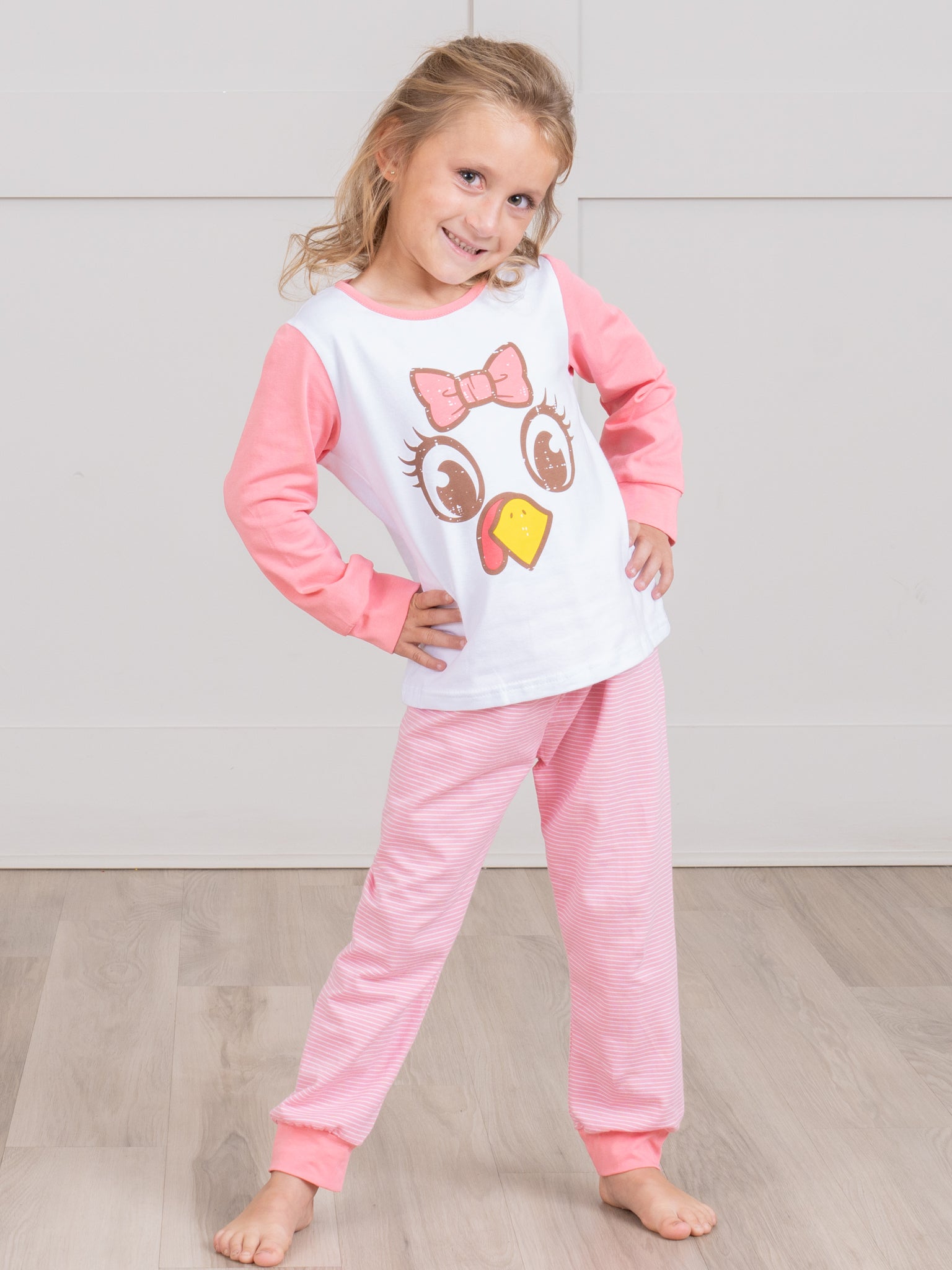 Keep your sleep routine looking snazzy with these Pink & White Turkey Pajamas! Boasting a cozy design and an adorable turkey face, these comfy PJs will have you cooing like a little chick. Rockin' a pink bottom and bright white top with pink raglan sleeves, these pajamas will keep you snug as a bug in a rug - gobble, gobble!