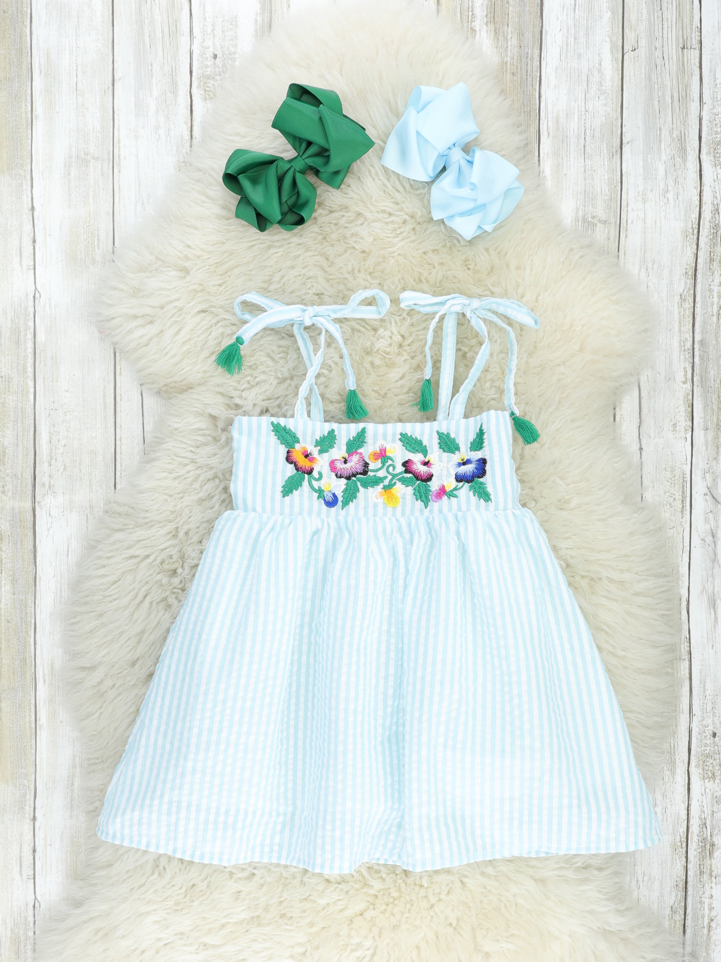 Be a twinning sensation with this stunning sister set! Our Pinstriped Floral Tie Dress features an adorable embroidered floral pattern, subtle pinstripes, and adjustable tie straps - perfect for when your look needs a little double trouble. Plus, its fully lined so that you can wear it with ease - and without fear of wardrobe malfunctions! Get ready to take twinning to the next level!