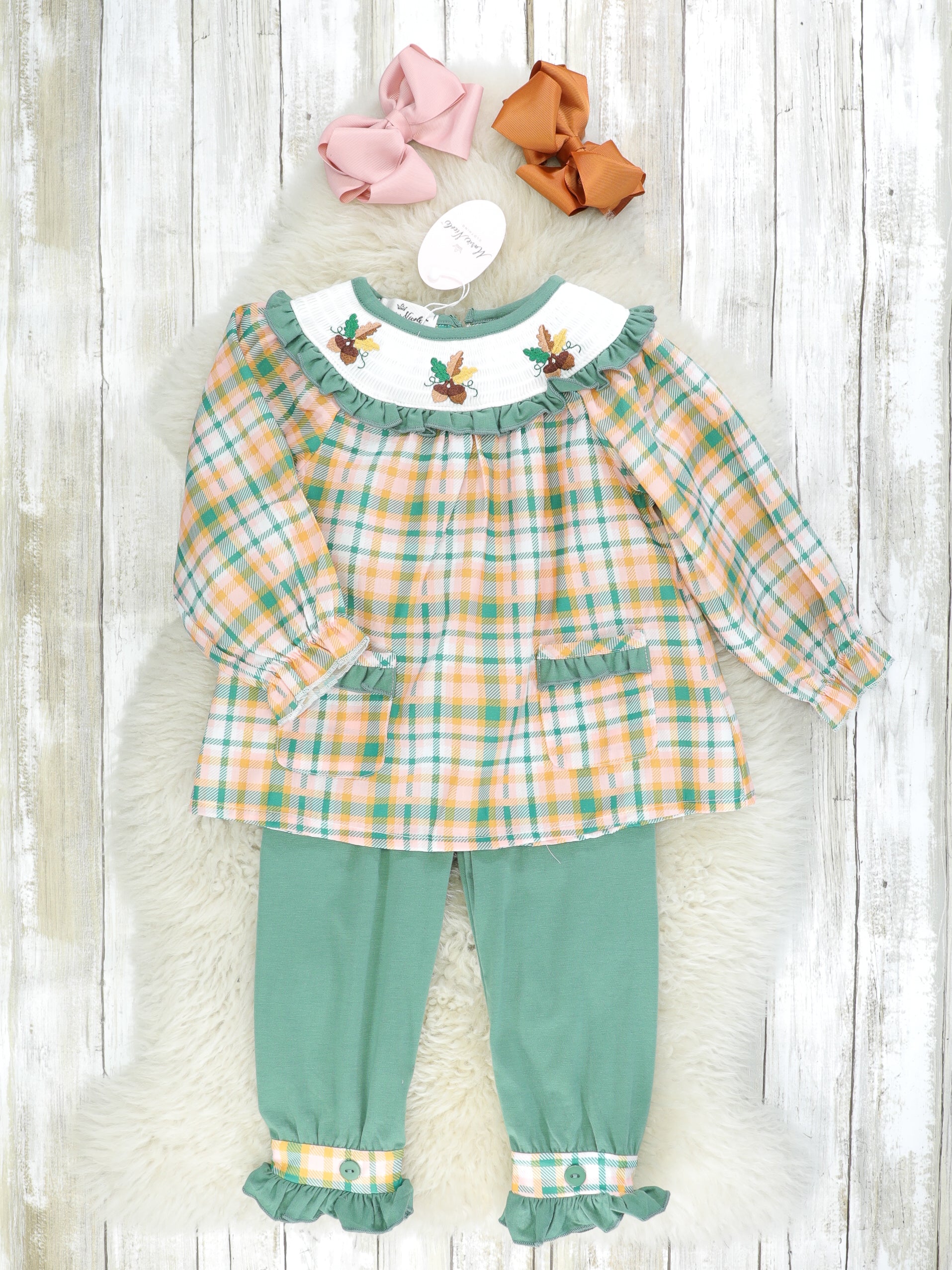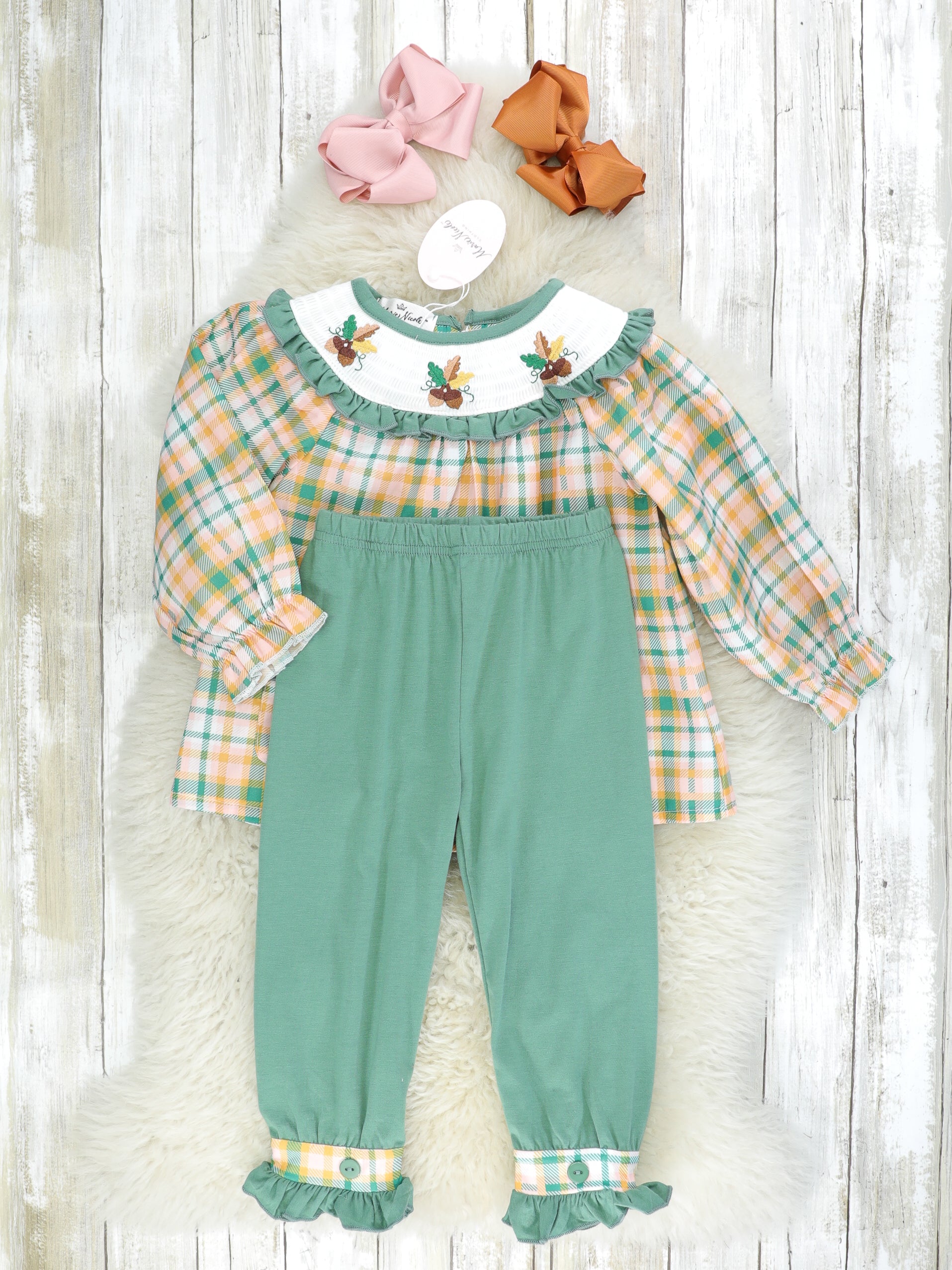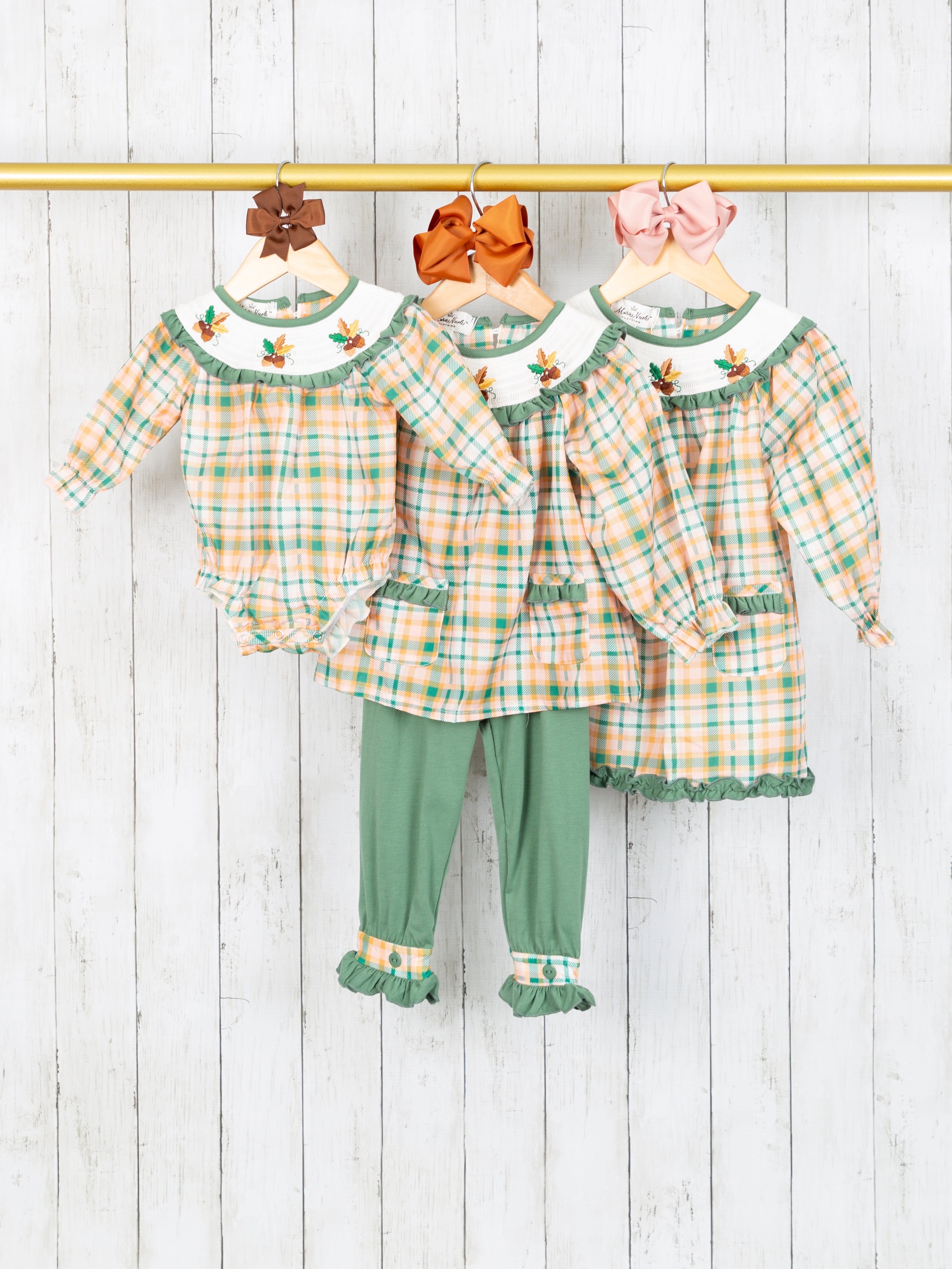 This tasteful acorn set has something for all the Thanksgiving kiddos! This outfit features a plaid shirt with a smocked neckline, embroidered acorns, pockets, ruffle trim, & green ruffle pants.