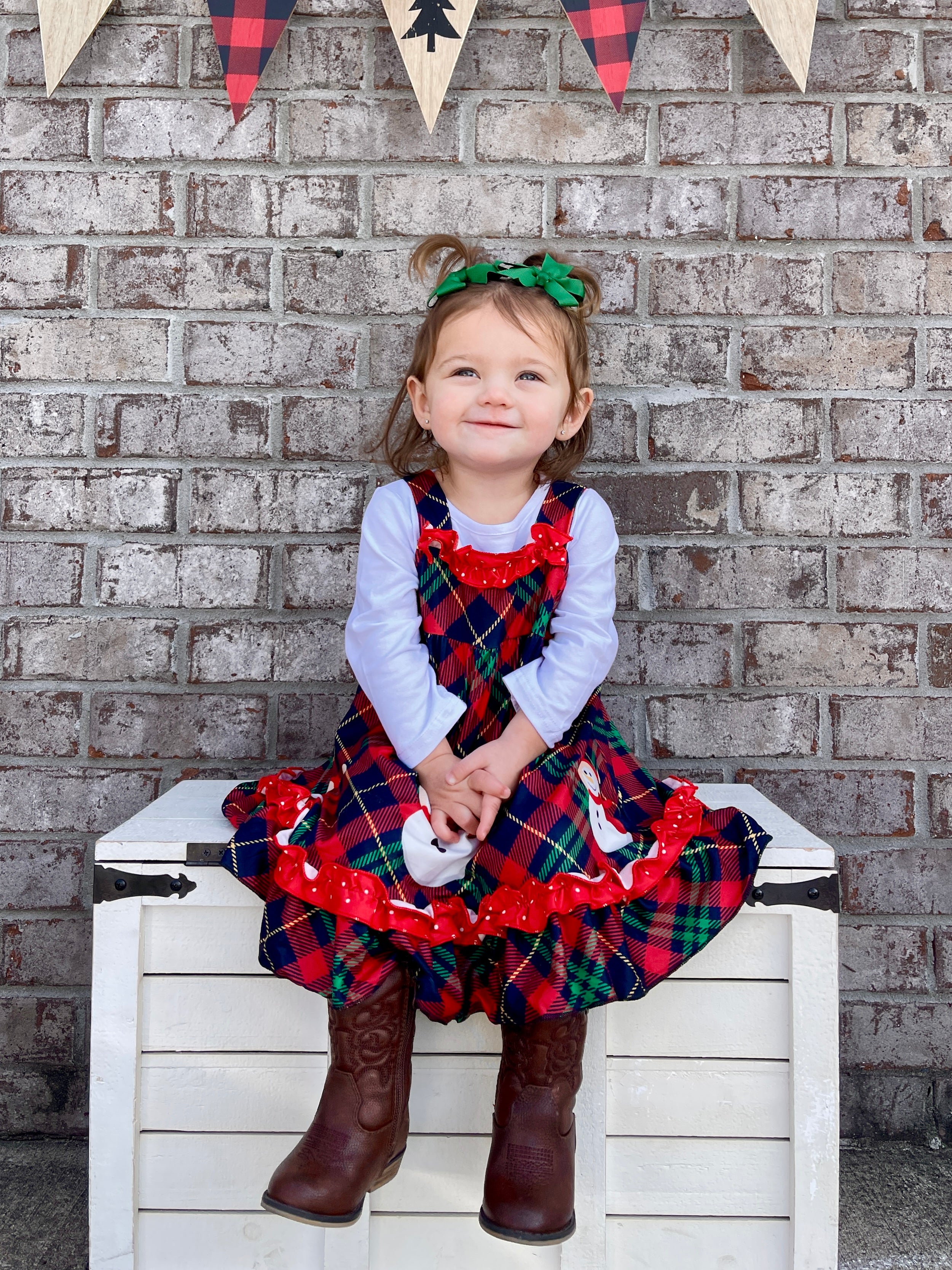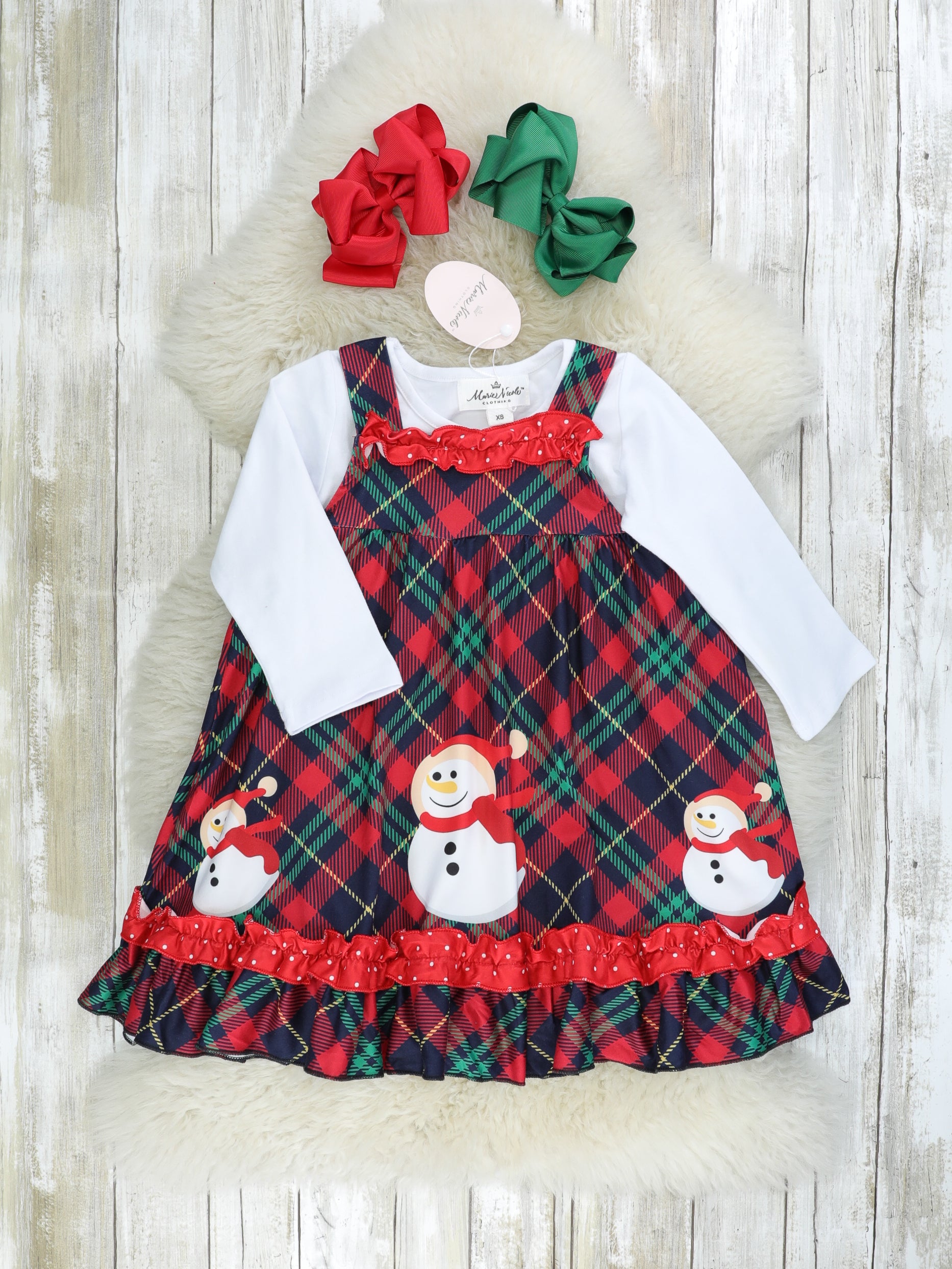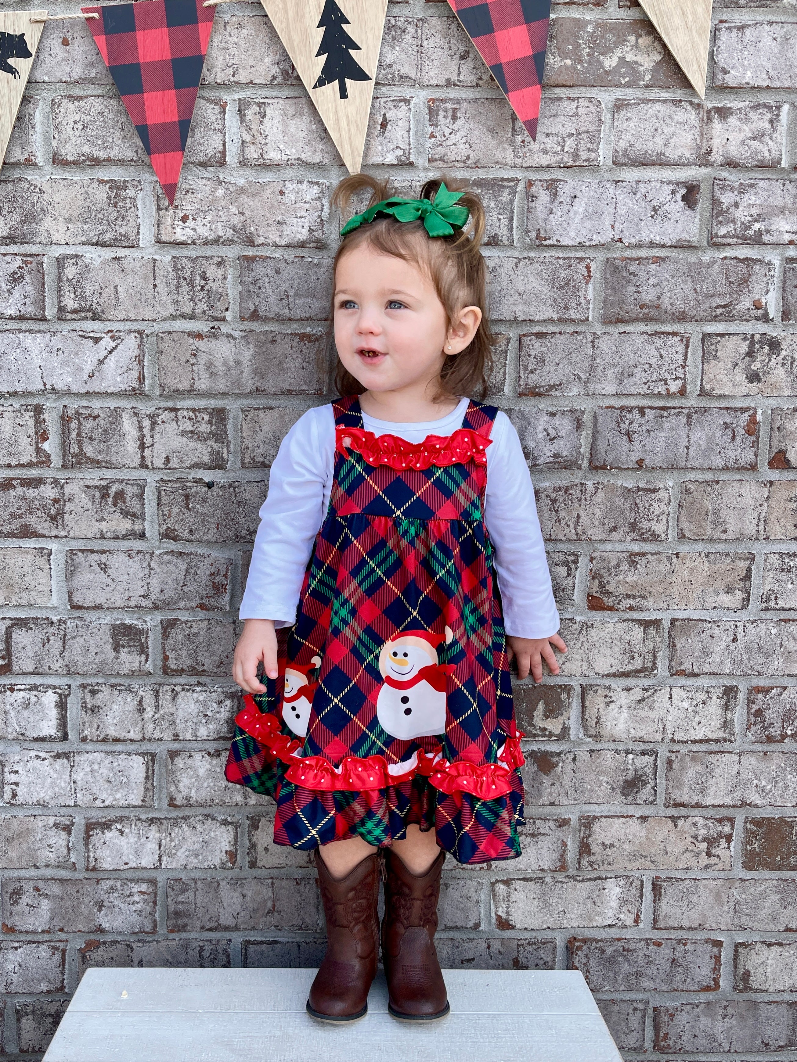 With this darling sister set, it's love at frost sight! This set features a white top & a plaid overall dress with polka dots, ruffle details, & snowman details.