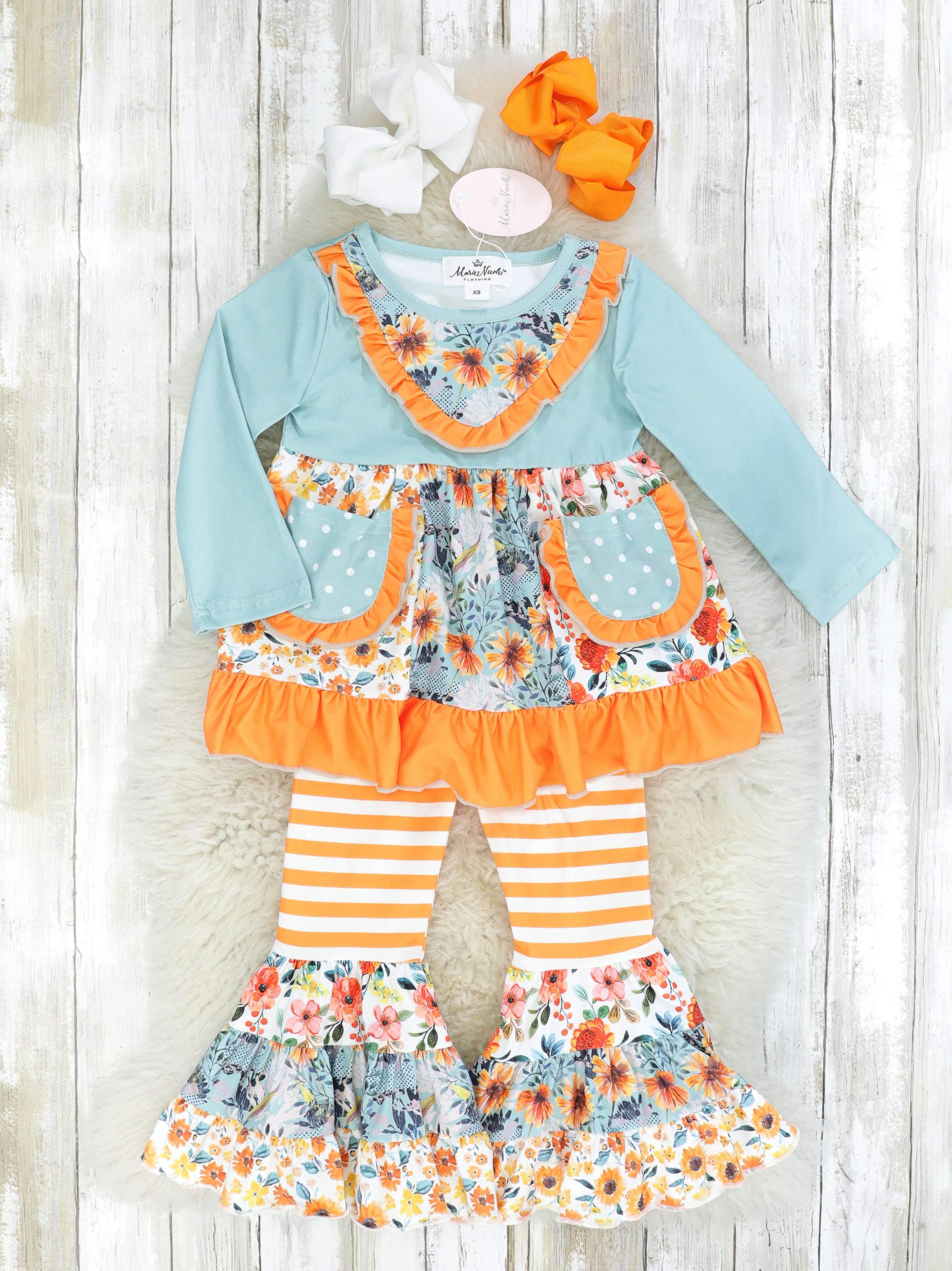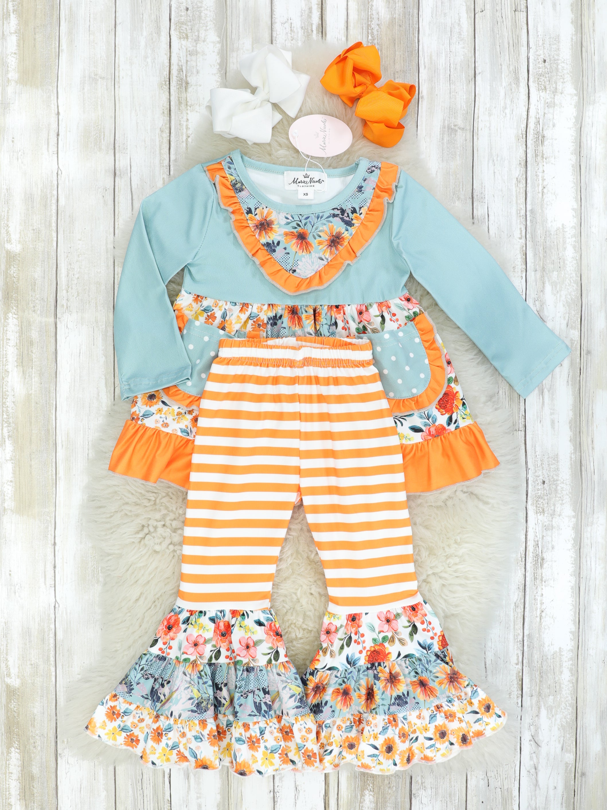 Fall florals never looked so good! This outfit features florals, pockets, ruffles, & stripes.