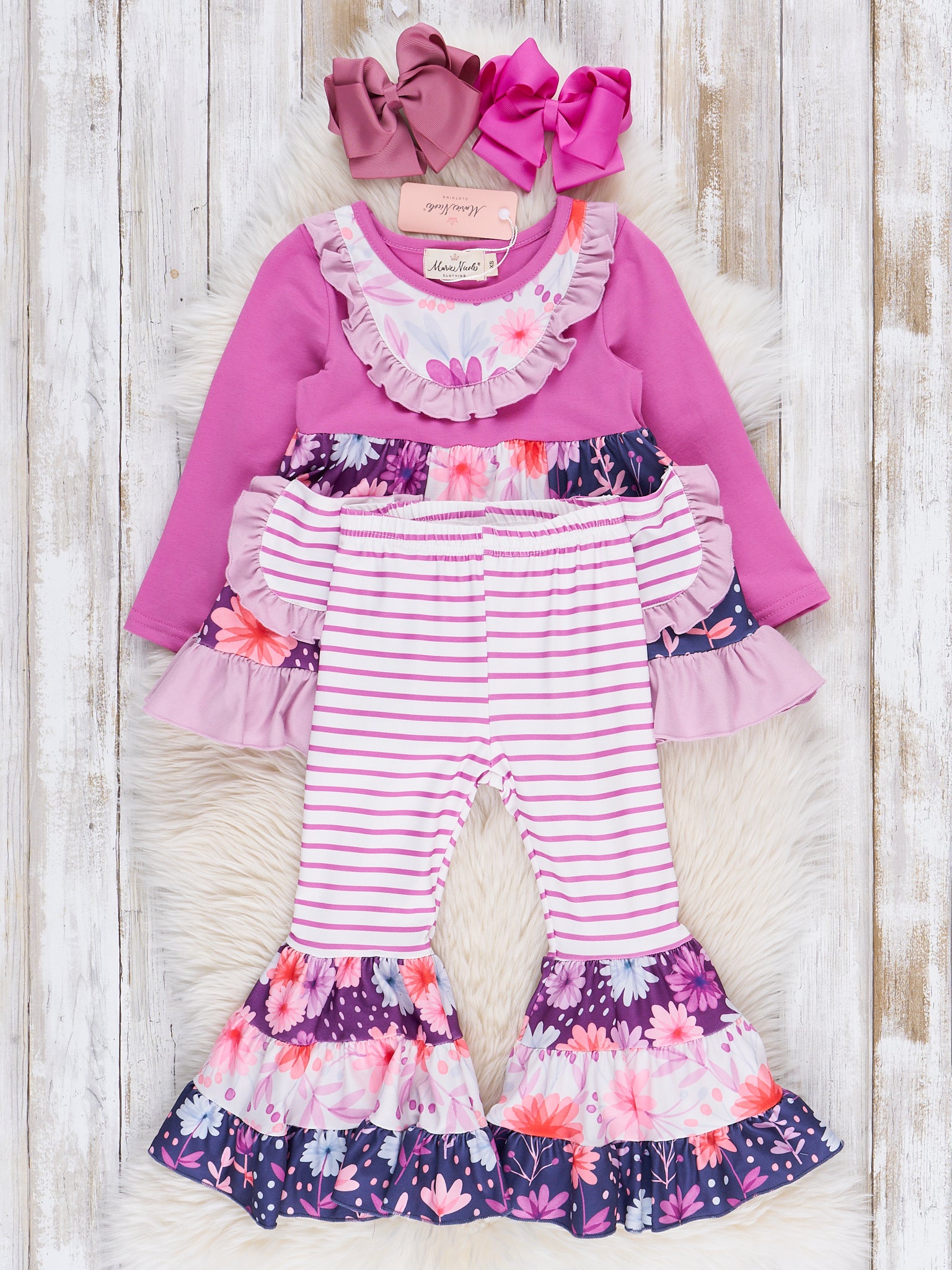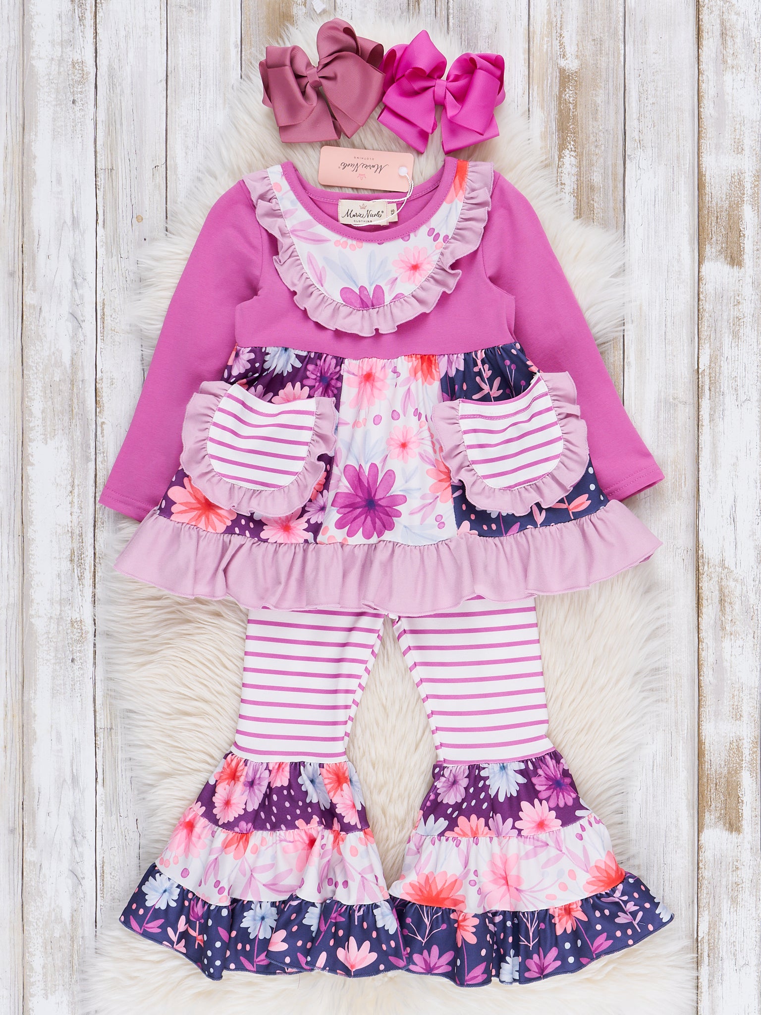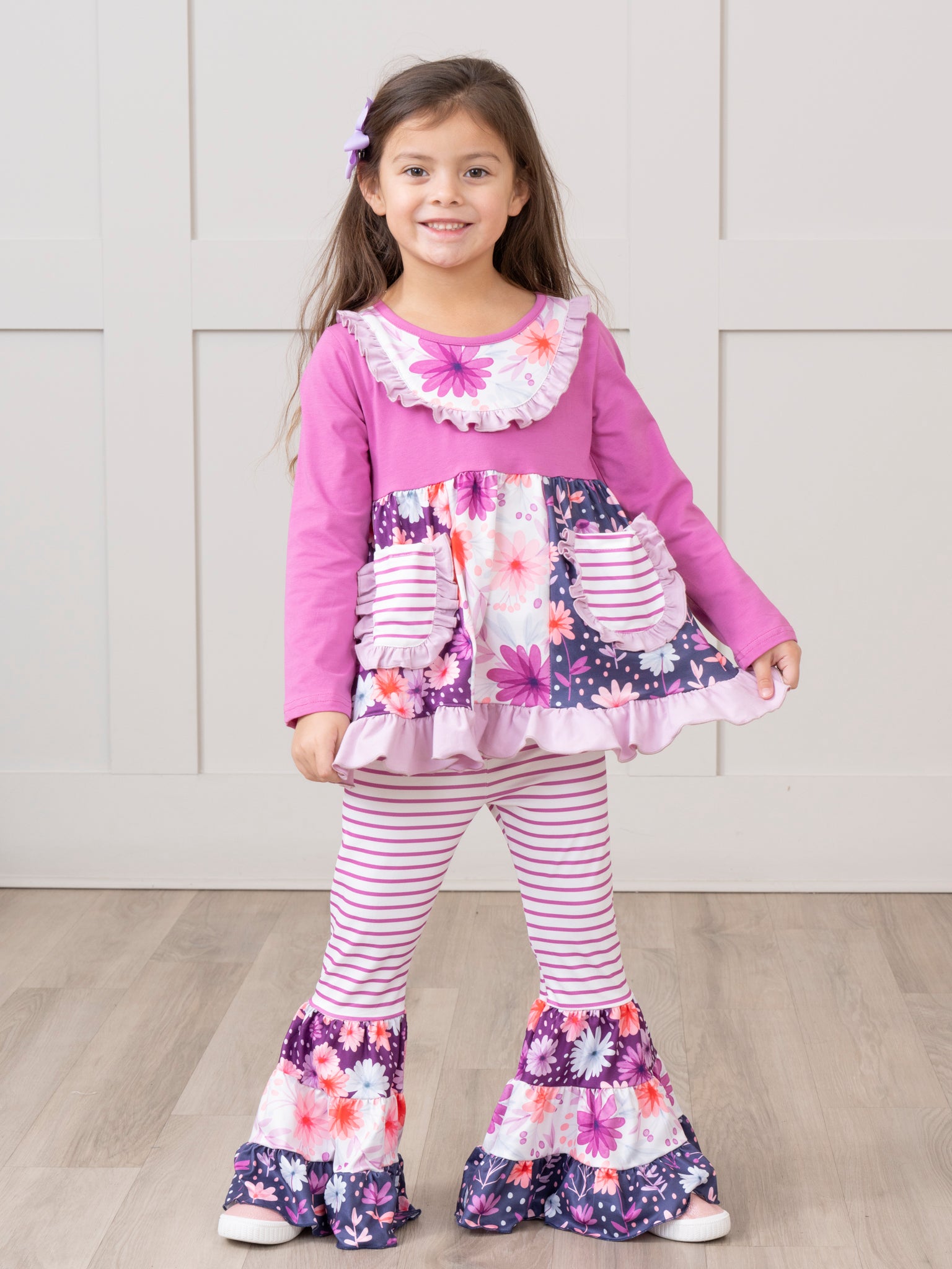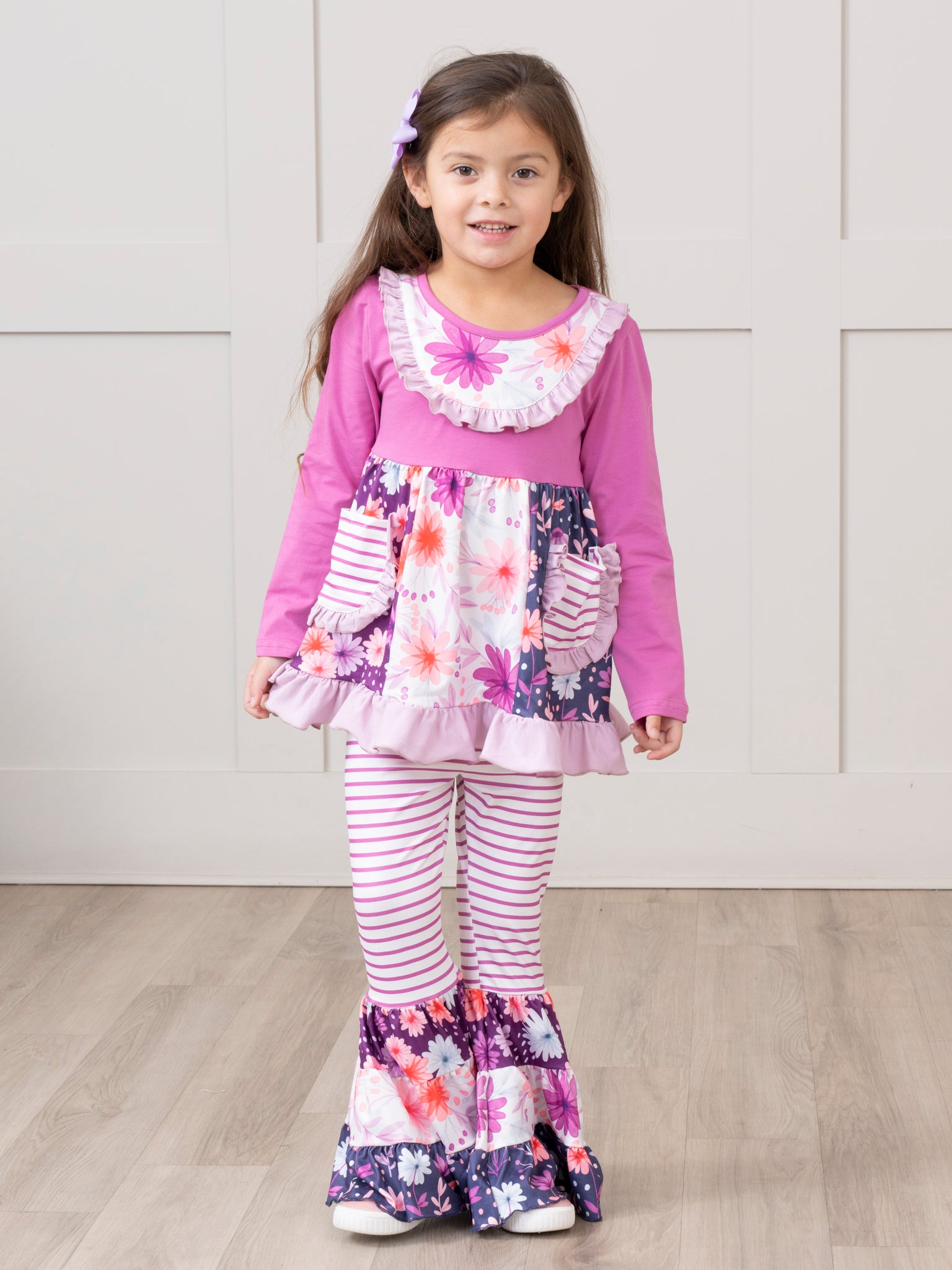 Get ready for springtime blooms with our Purple Springtime Florals Ruffle Outfit! This cute sister set by Marie Nicole Clothing will have your little girl twirling with delight. The ruffle details add a touch of whimsy to this flowy and fun ensemble. Perfect for all your spring adventures!