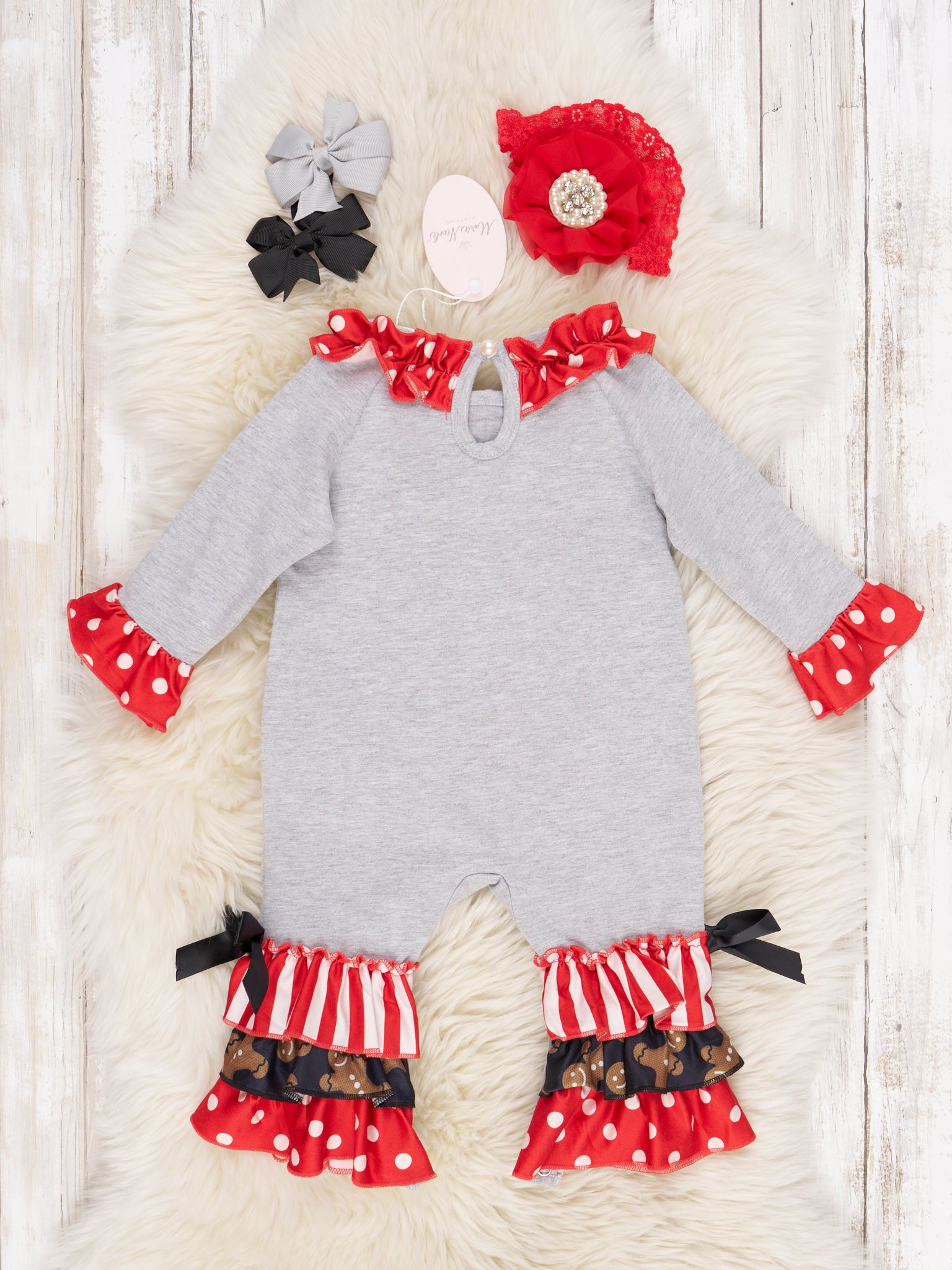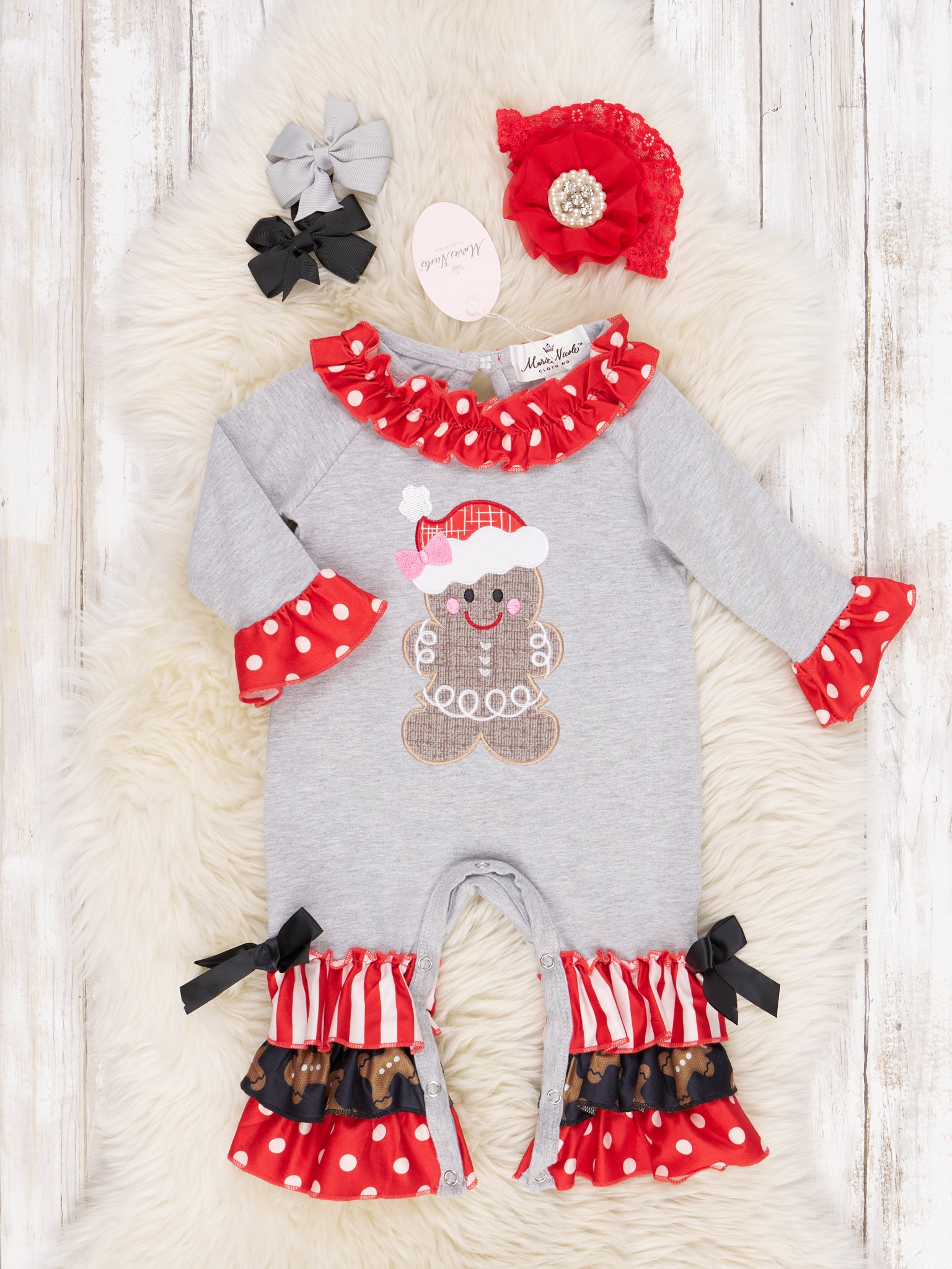 Mmm, treat yourself to this delicious gingerbread sibling set! As cozy as Grandma's warm kitchen, this grey romper with ruffles make for a comfort that can't be beaten. The sweet gingerbread appliqué really takes it to the next level of comfiness! So what are you waiting for? Get baking!
