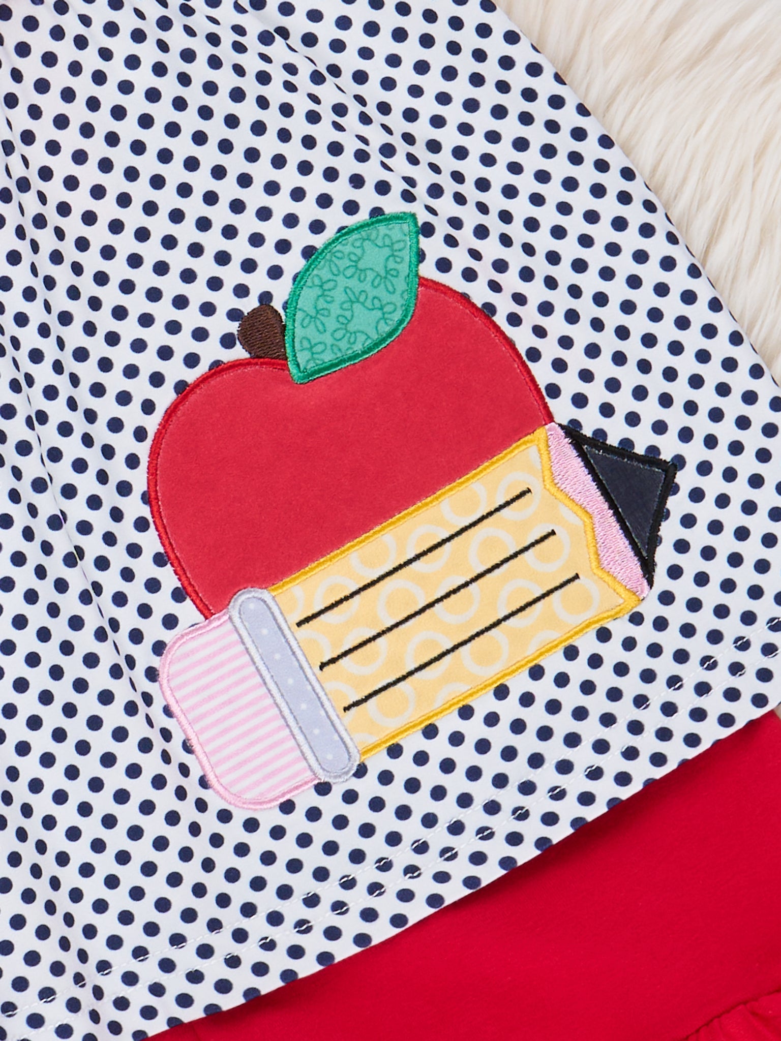 Fashionable siblings will feel adorably ready for the new school year in this sister set! This dress is fun and funky with a soft polka dot design and bright red trim! The adorning apple & pencil design is perfect for your little pupil! 🍎✏️