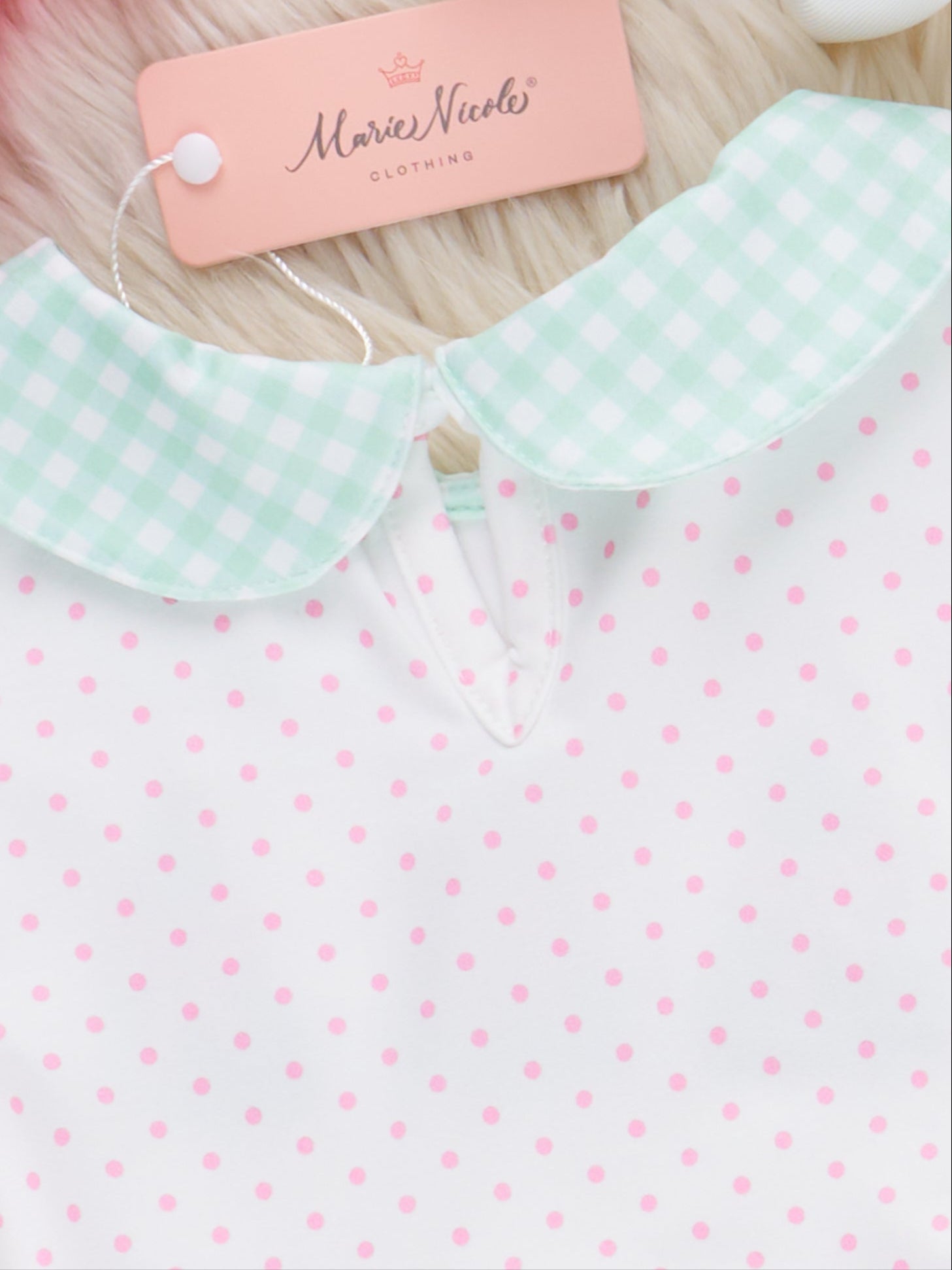 The Polka Dottie Christmas Tree Embroidered Bubble Romper by Marie Nicole Clothing features a festive polka dot print, a peter pan collar with trim, and three embroidered Christmas trees across the chest. This adorable bubble offers elasticized cuffs and a roomy fit, making it perfect for holiday celebrations, photos, and cozy winter days.