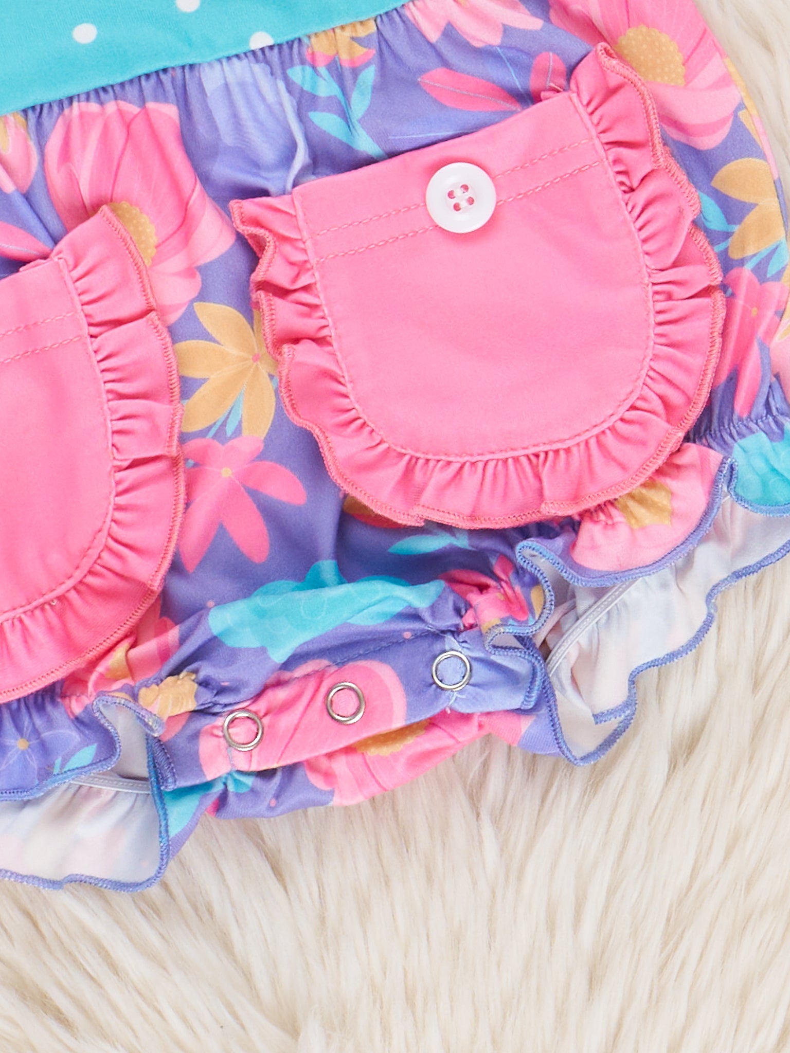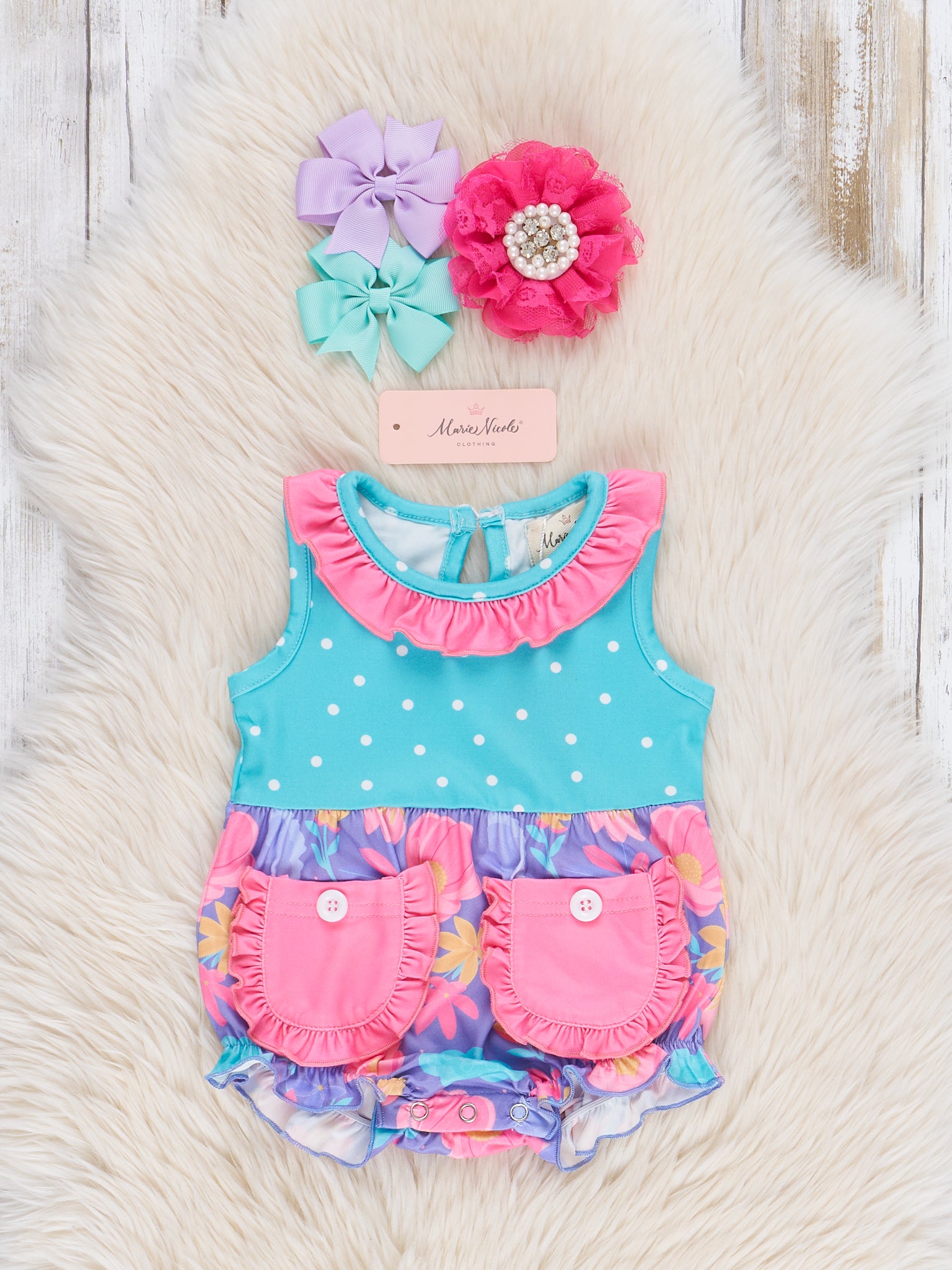 Get your little ones ready for summertime fun with the Poppy Dots Ruffle Bubble! This playful girls bubble, designed by Marie Nicole, features a trendy teal polka dot bodice paired with a vibrant poppy print bottom. With pink ruffle trim, adorable pockets and a matching sister set available, this bubble is perfect for any summer occasion.