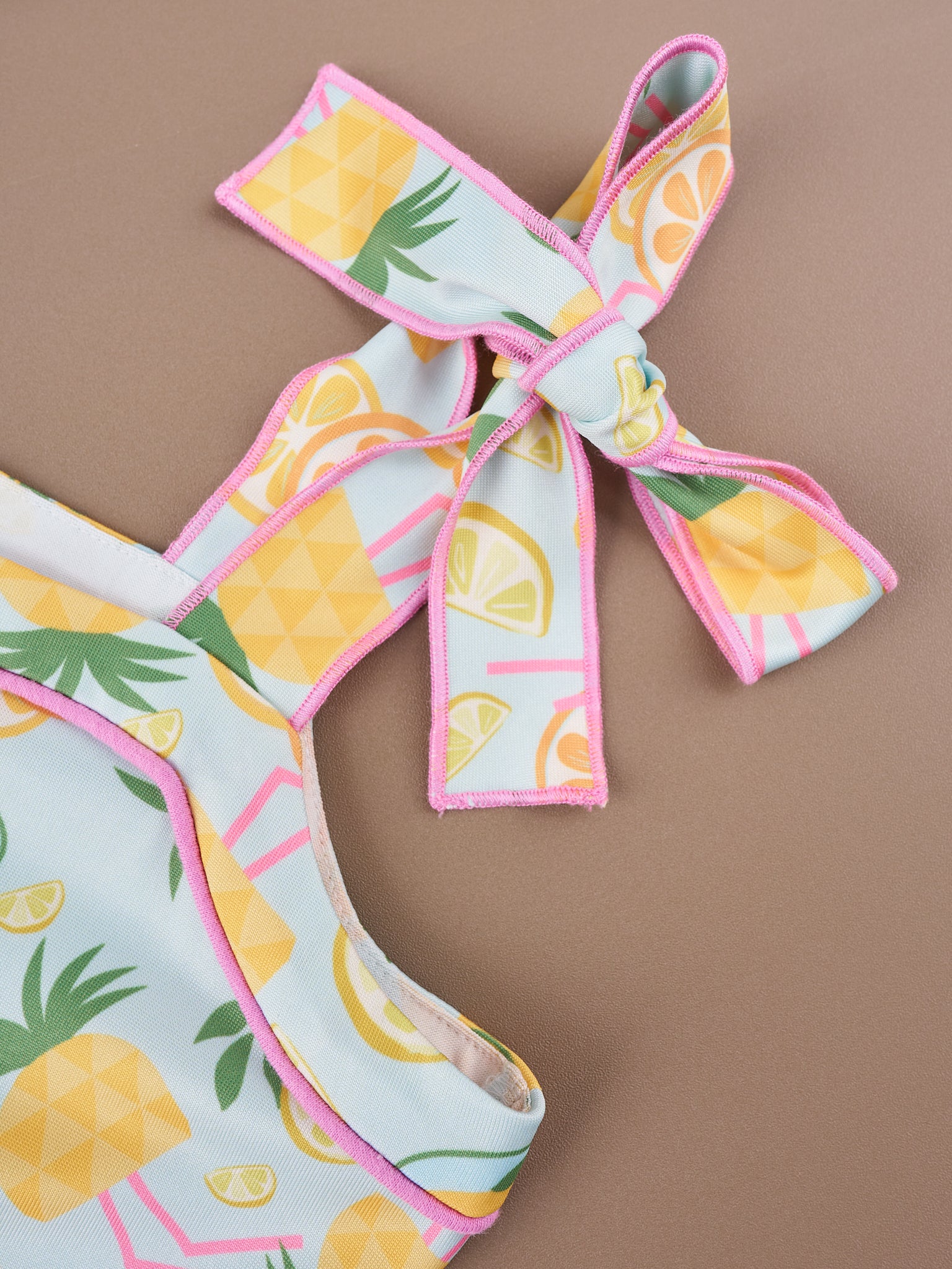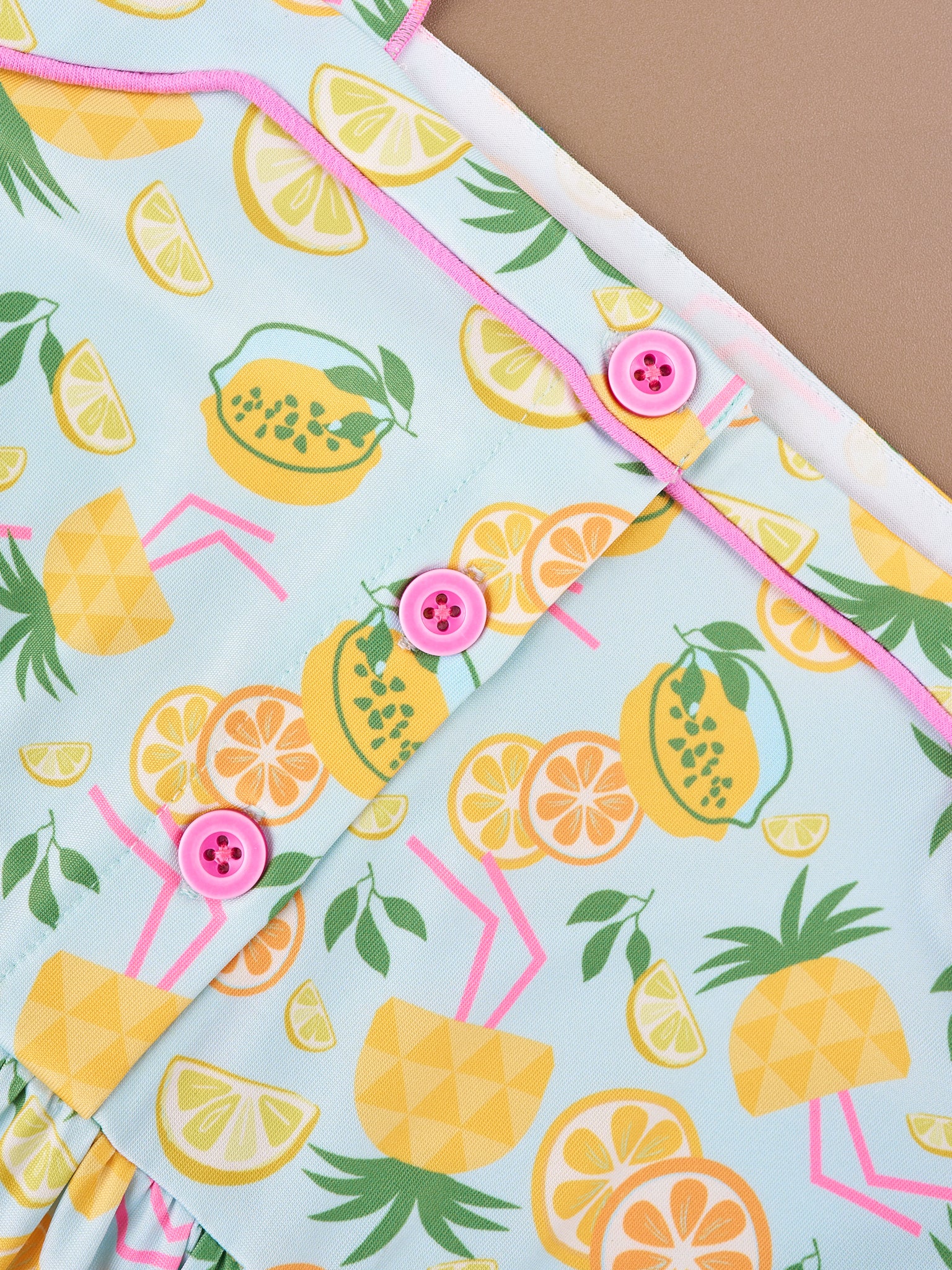 This collection features a stunning, hand-drawn print with a medley of pineapples, lemons, limes, and oranges.