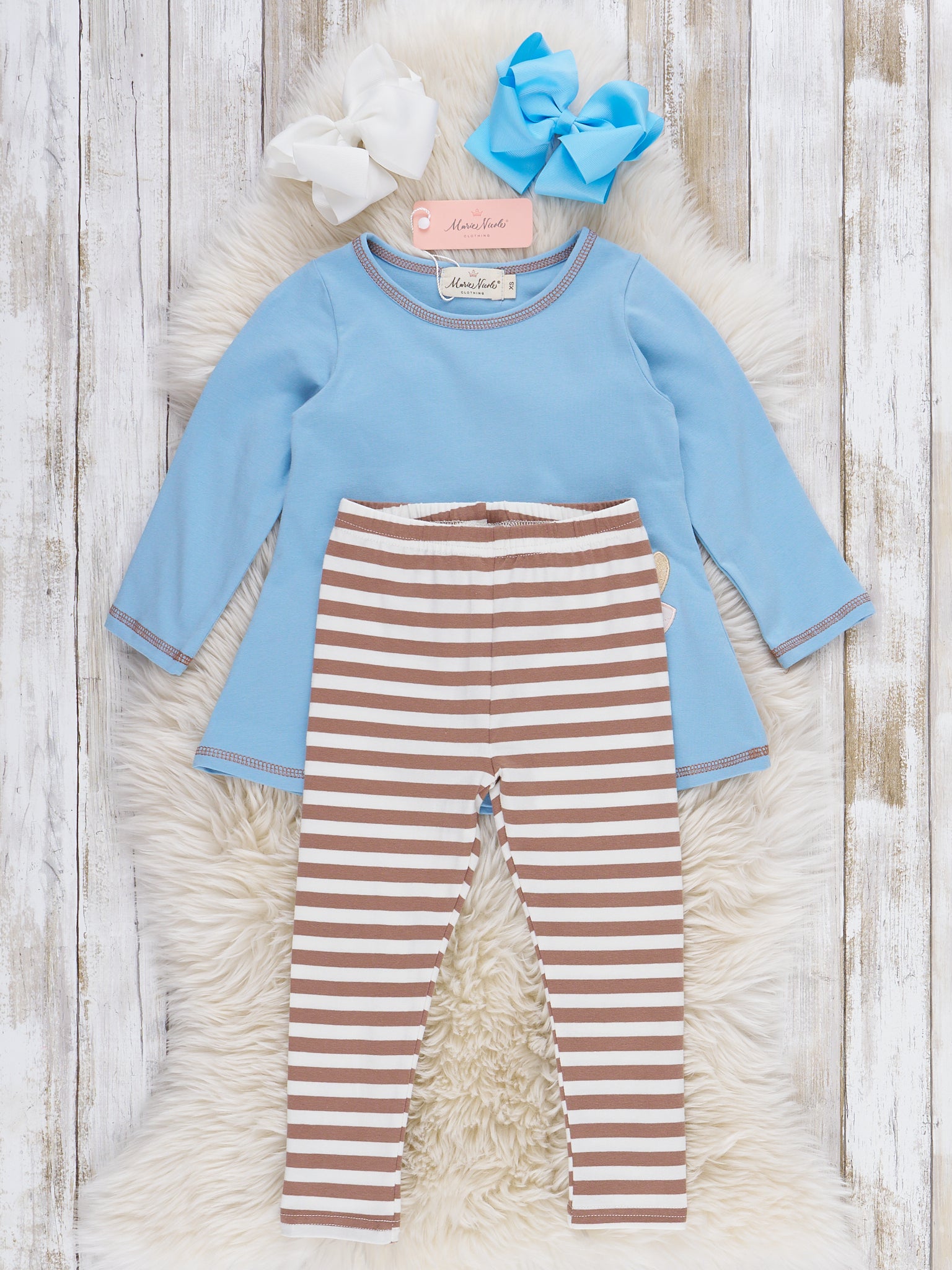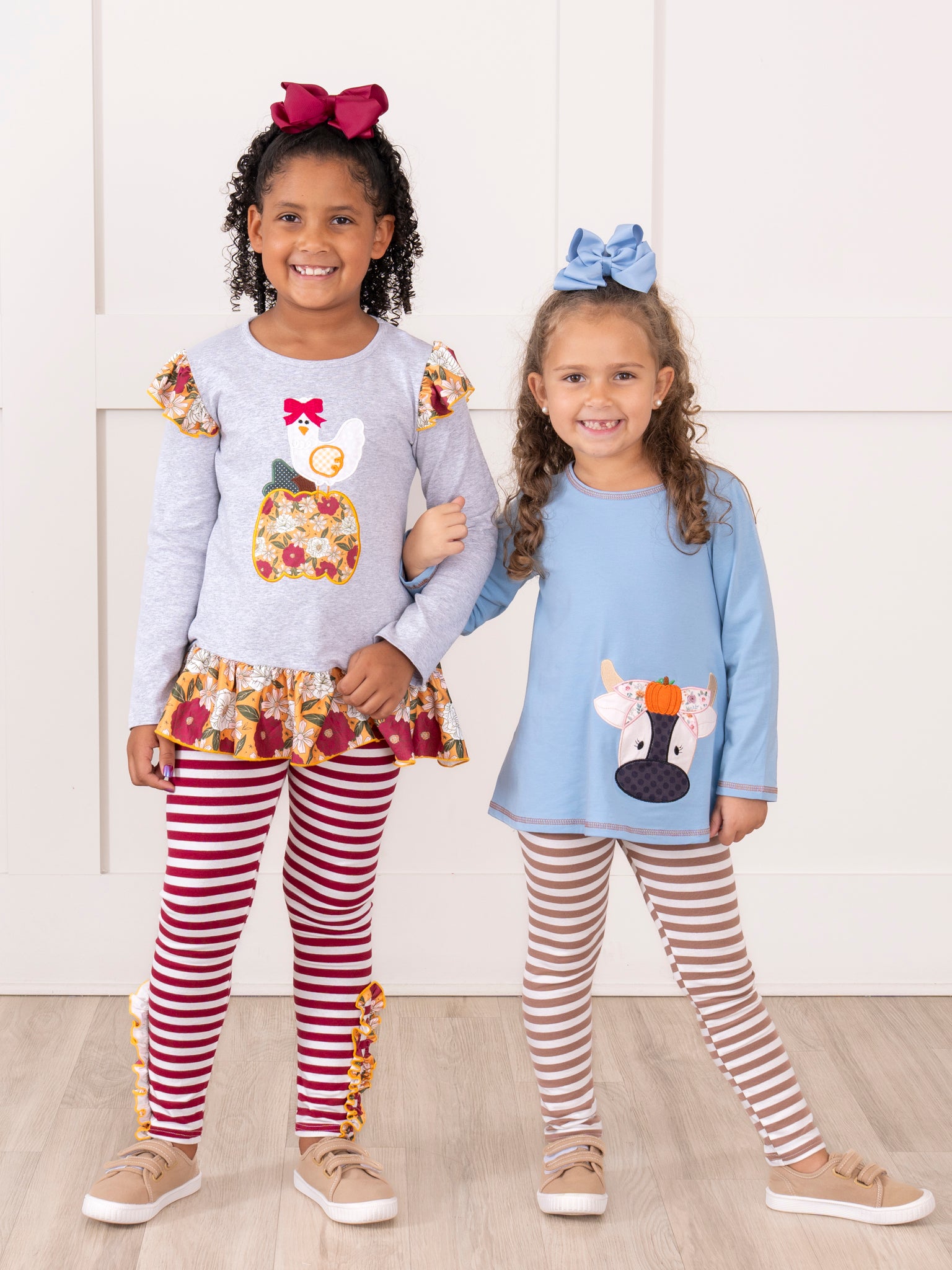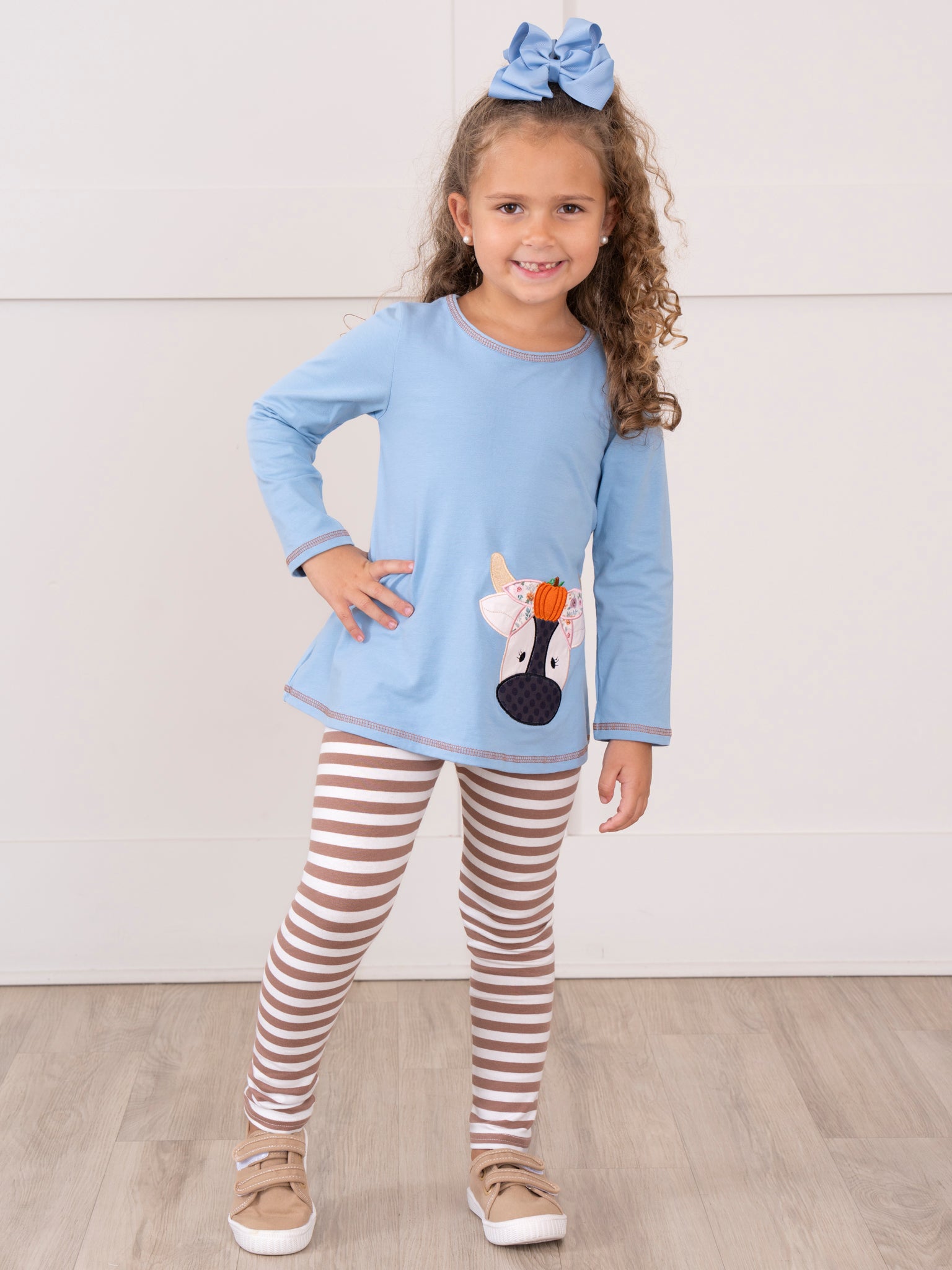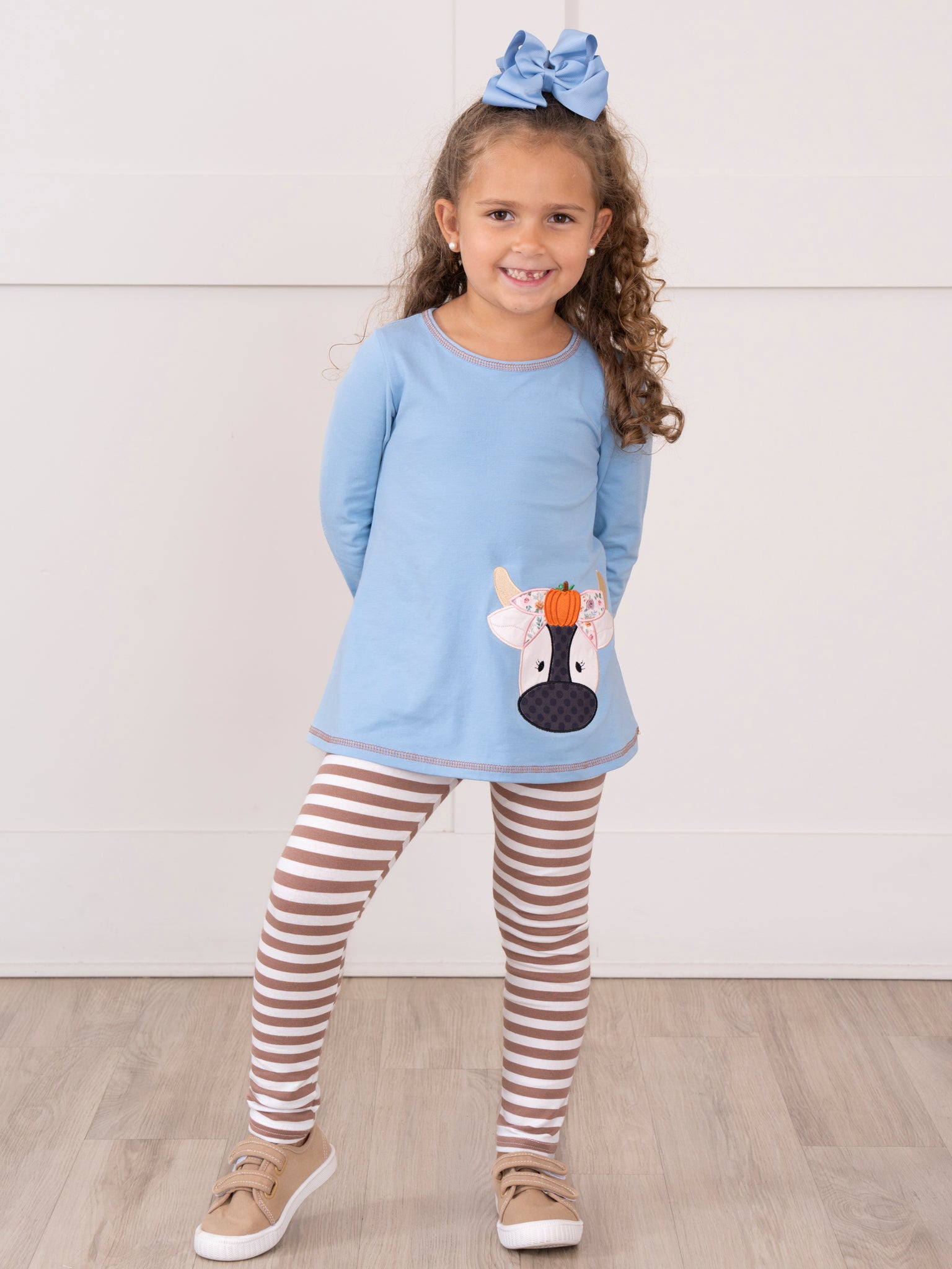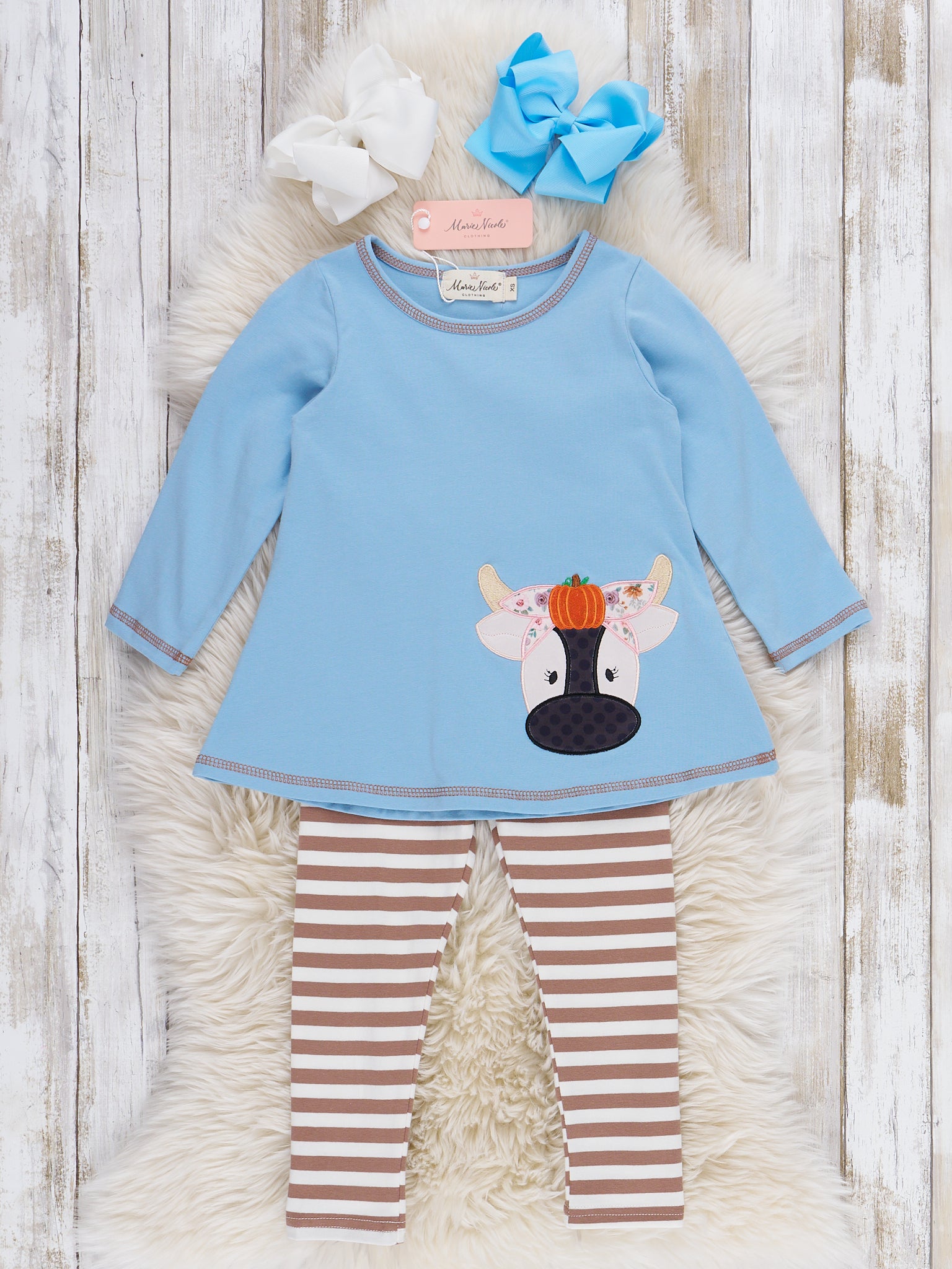 The Pumpkin Cow Striped Outfit by Marie Nicole Clothing features a playful top with an appliqué cow wearing a pumpkin headpiece, paired with comfortable striped pants. This set combines whimsical farm-inspired autumn style with ease of movement, making it perfect for pumpkin patch visits, fall celebrations, and capturing fun seasonal moments.