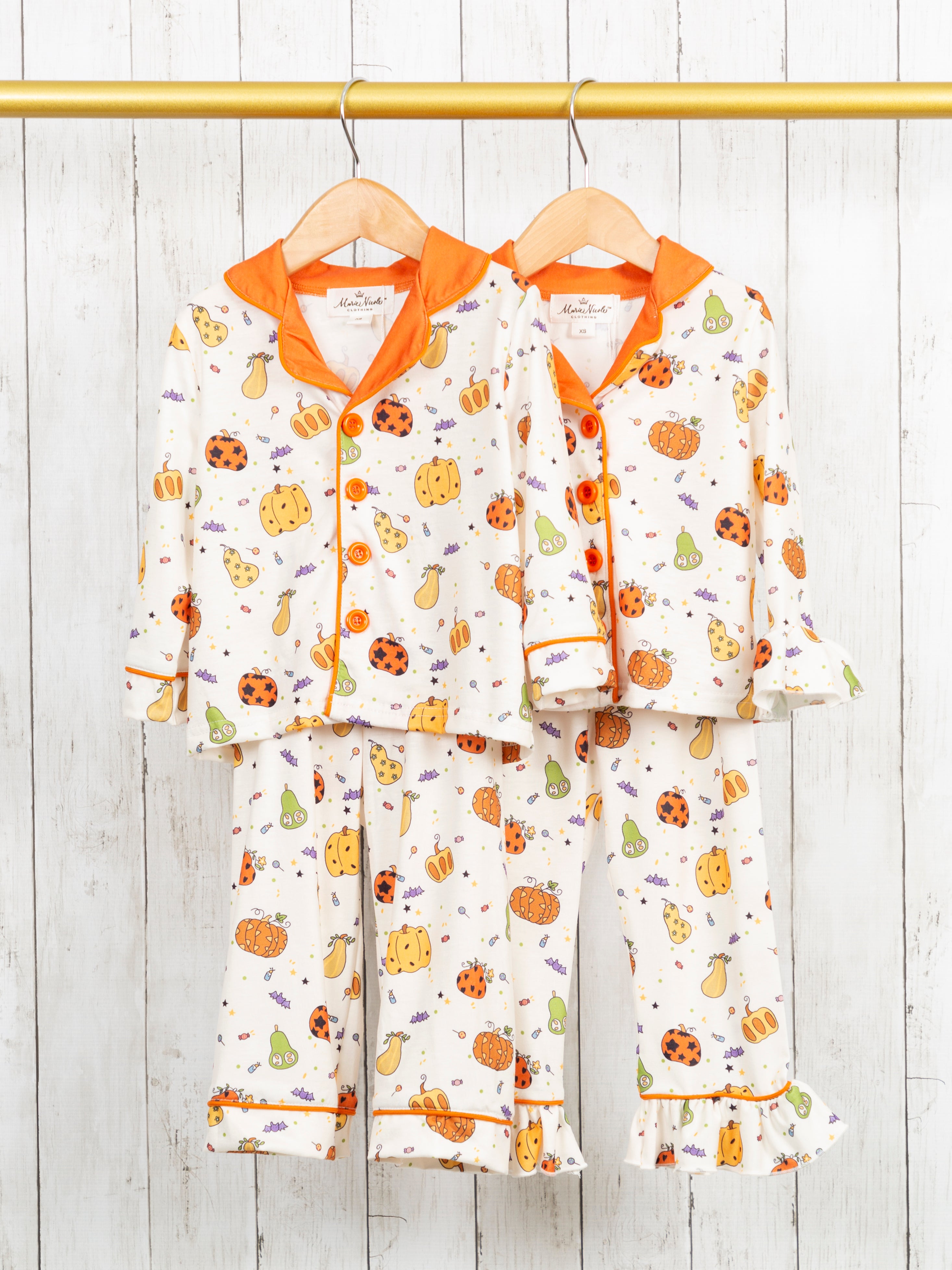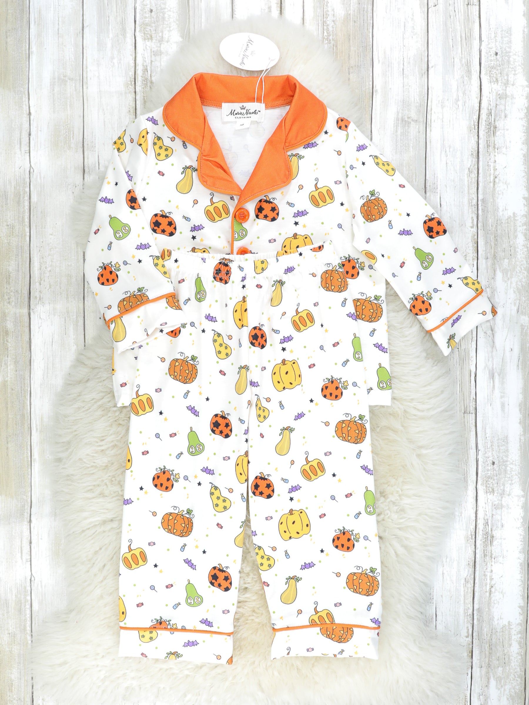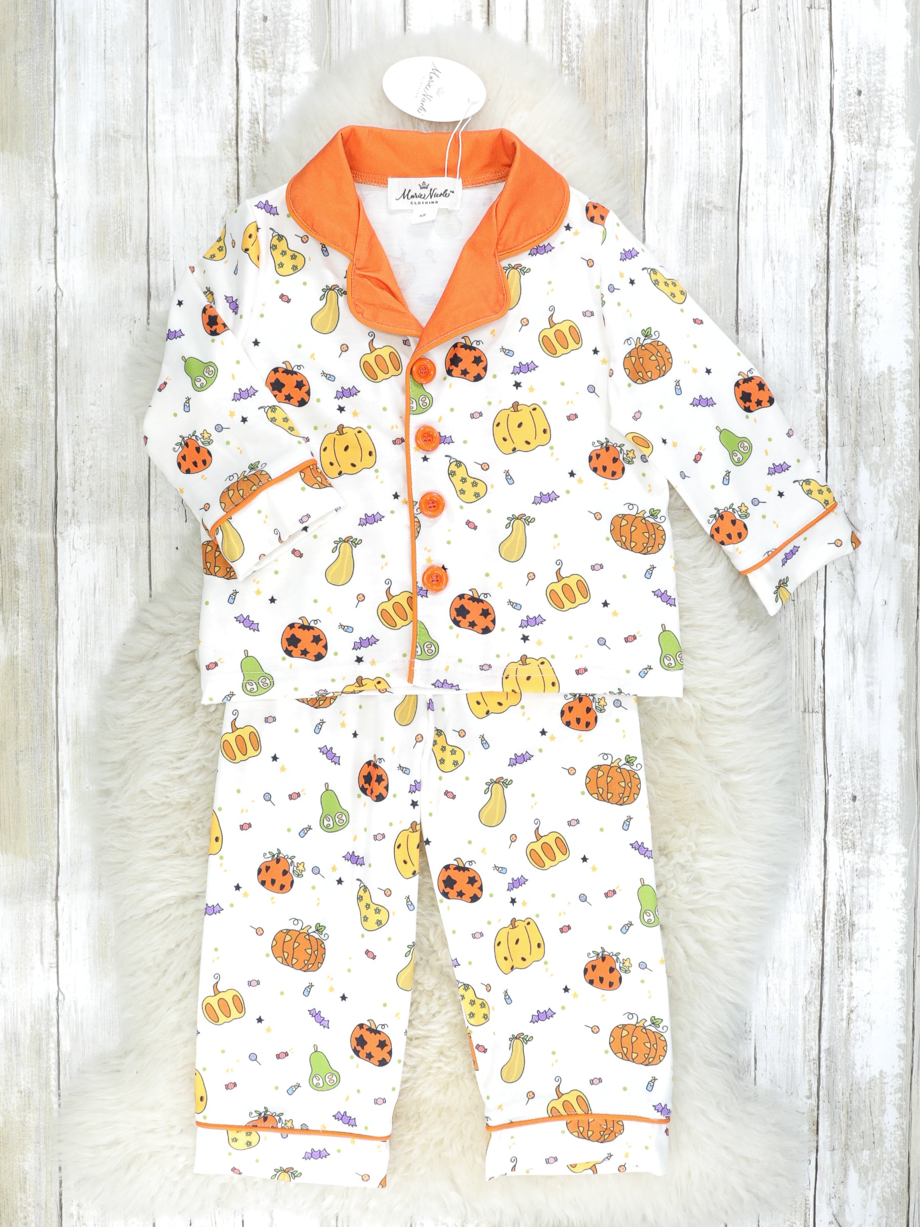 MNC's fall harvest is here & this GOURDeous, exclusive collection has something for all the little pumpkins of your life! These pajamas feature functioning buttons, an orange collar, & an elastic waistband.