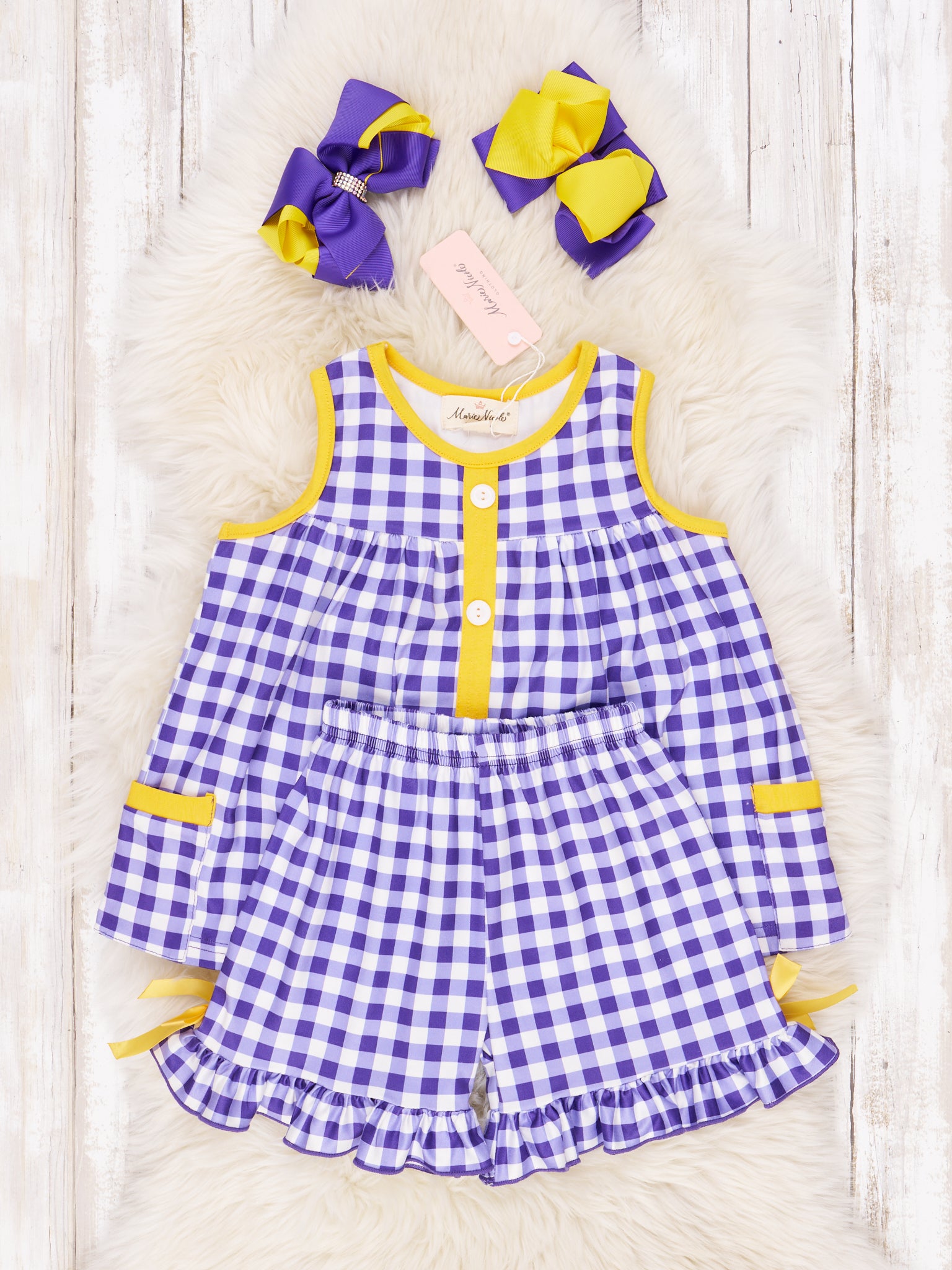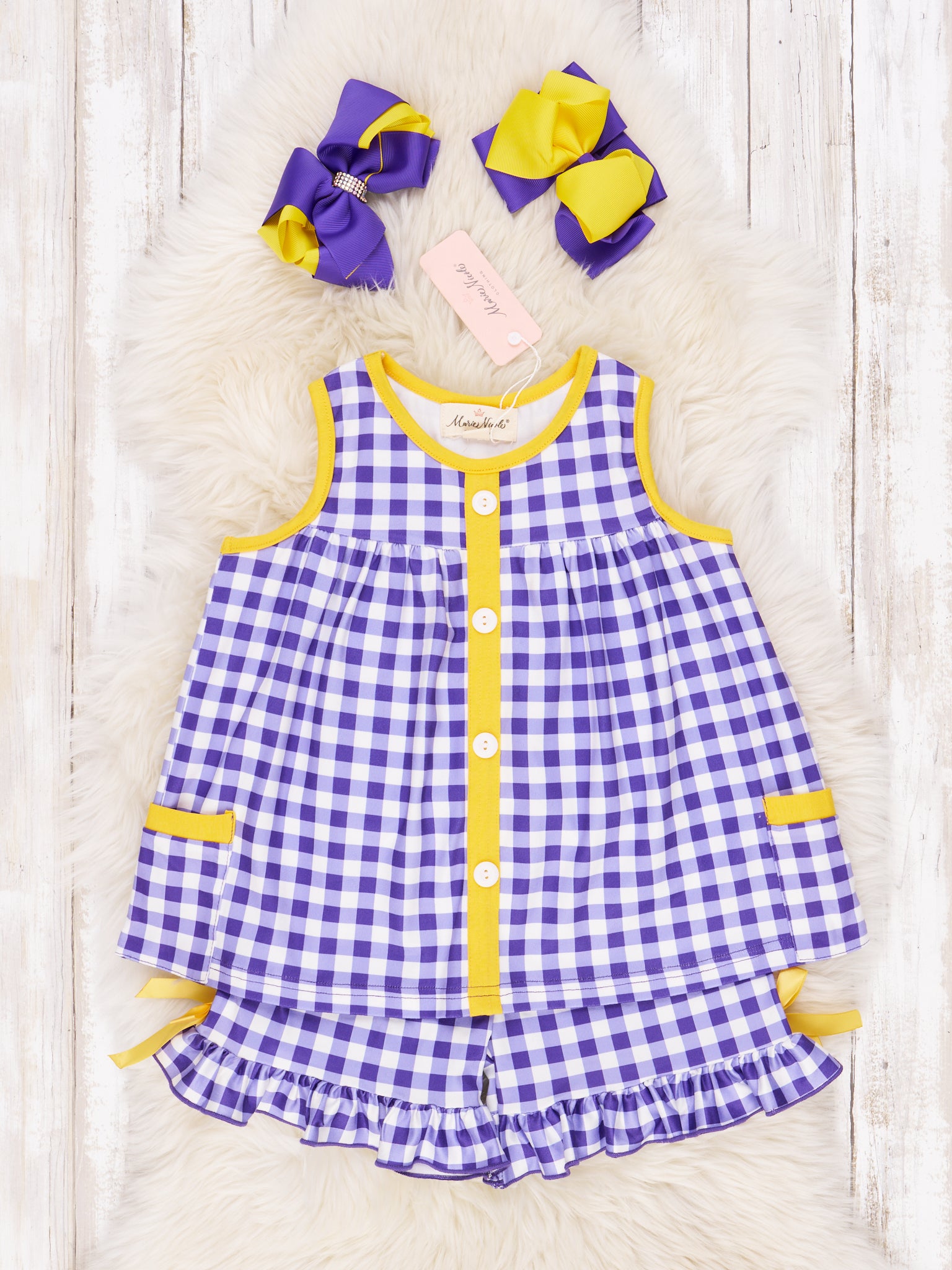 Stay stylish with this family-friendly collegiate set! This Purple & Gold Outfit comes in a fresh gingham design and is perfect for any family outing. Get your matching set now and show your sports-themed pride!