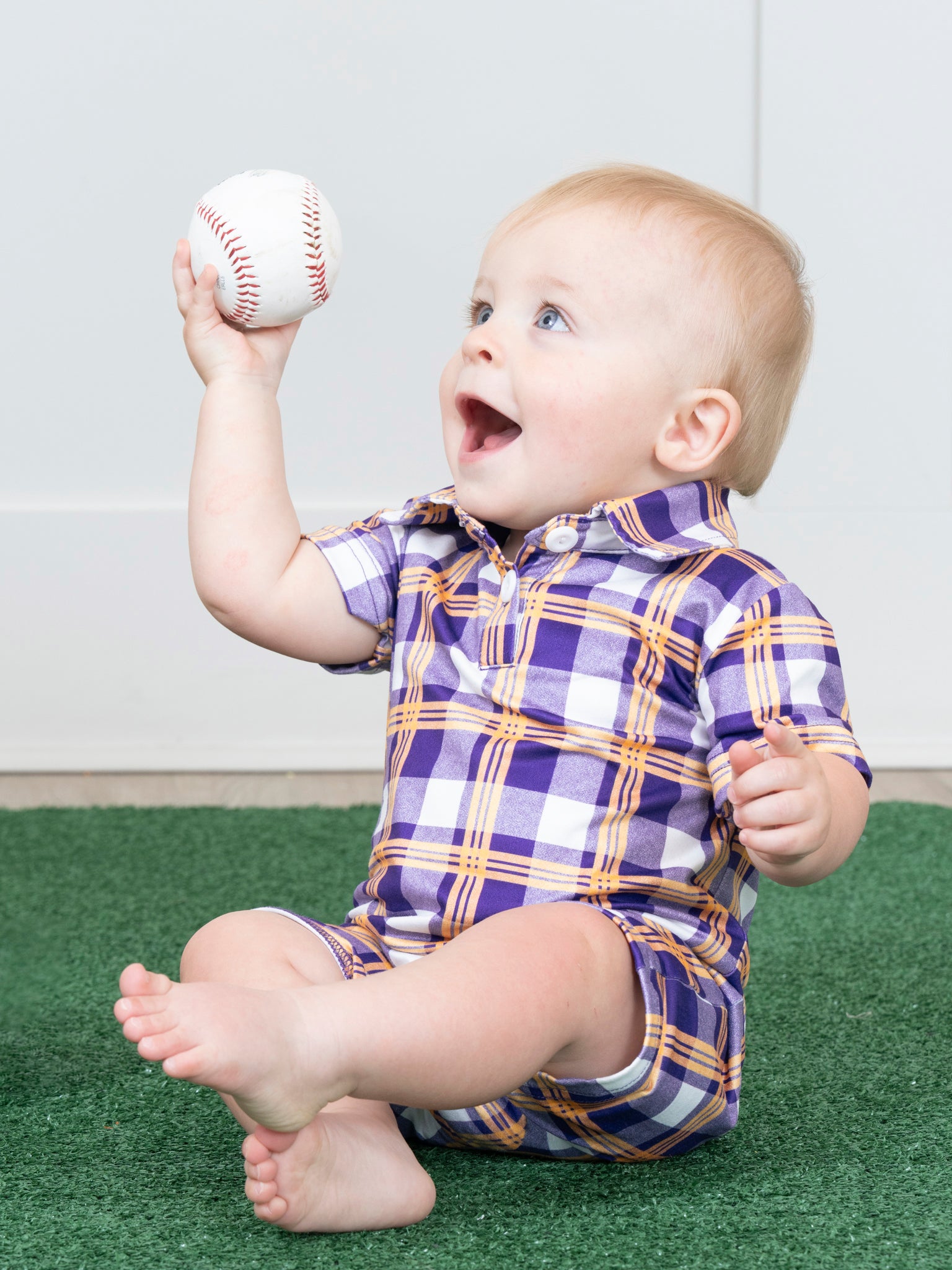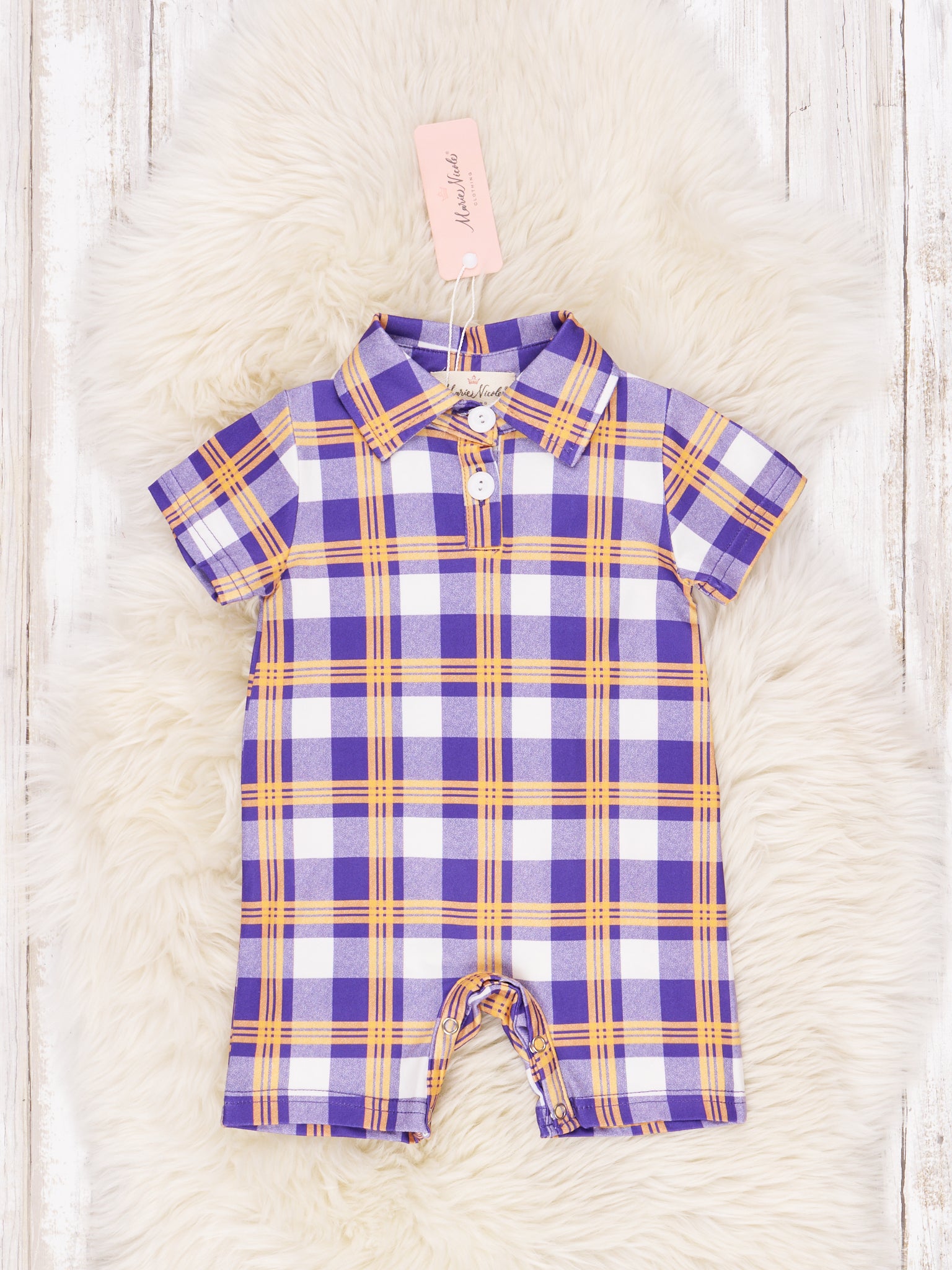 Stay stylish with this family-friendly collegiate set! This Purple & Gold Romper comes in a fresh button-up plaid design and is perfect for any family outing. Get your matching set now and show your sports-themed pride!