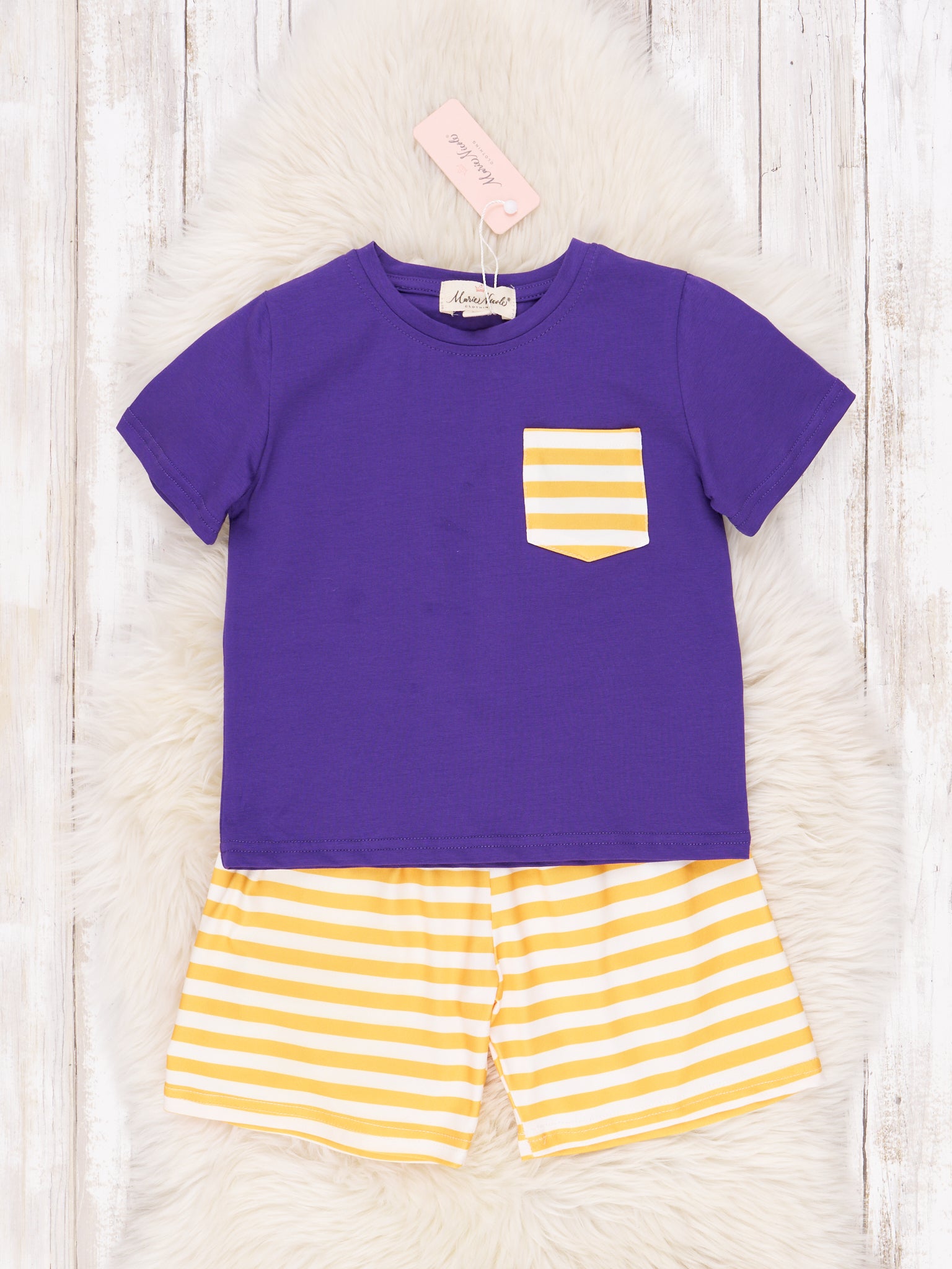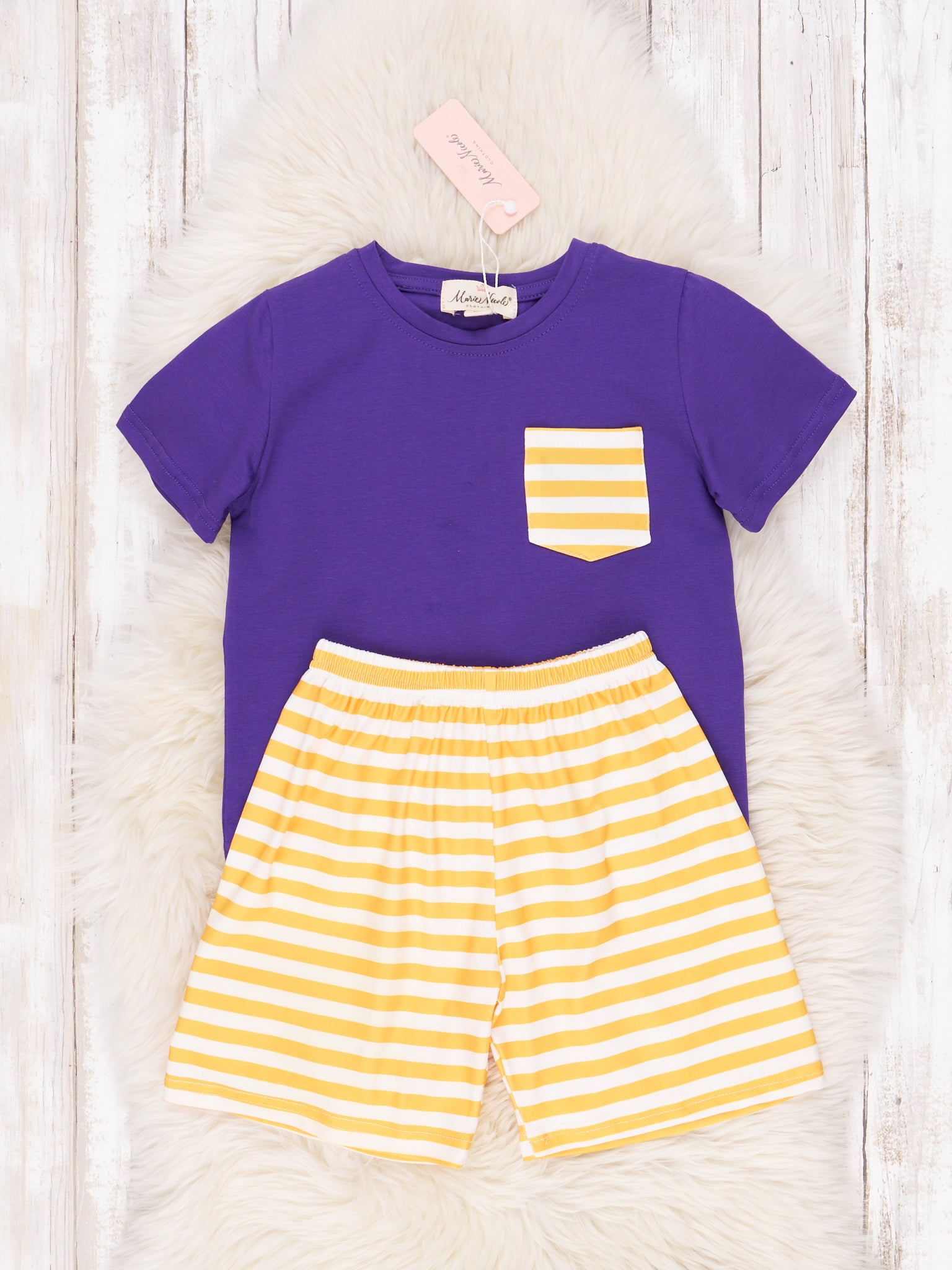 Stay stylish with this family-friendly collegiate set! This Purple & Gold Outfit comes in a fresh stripe design and is perfect for any family outing. Get your matching set now and show your sports-themed pride!