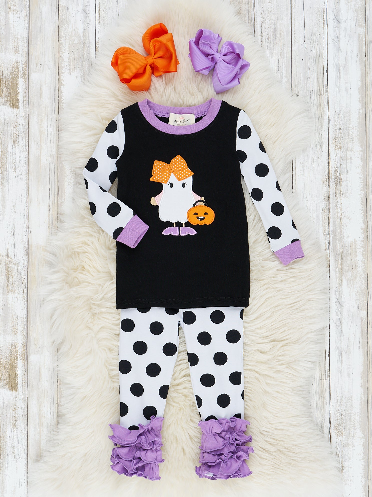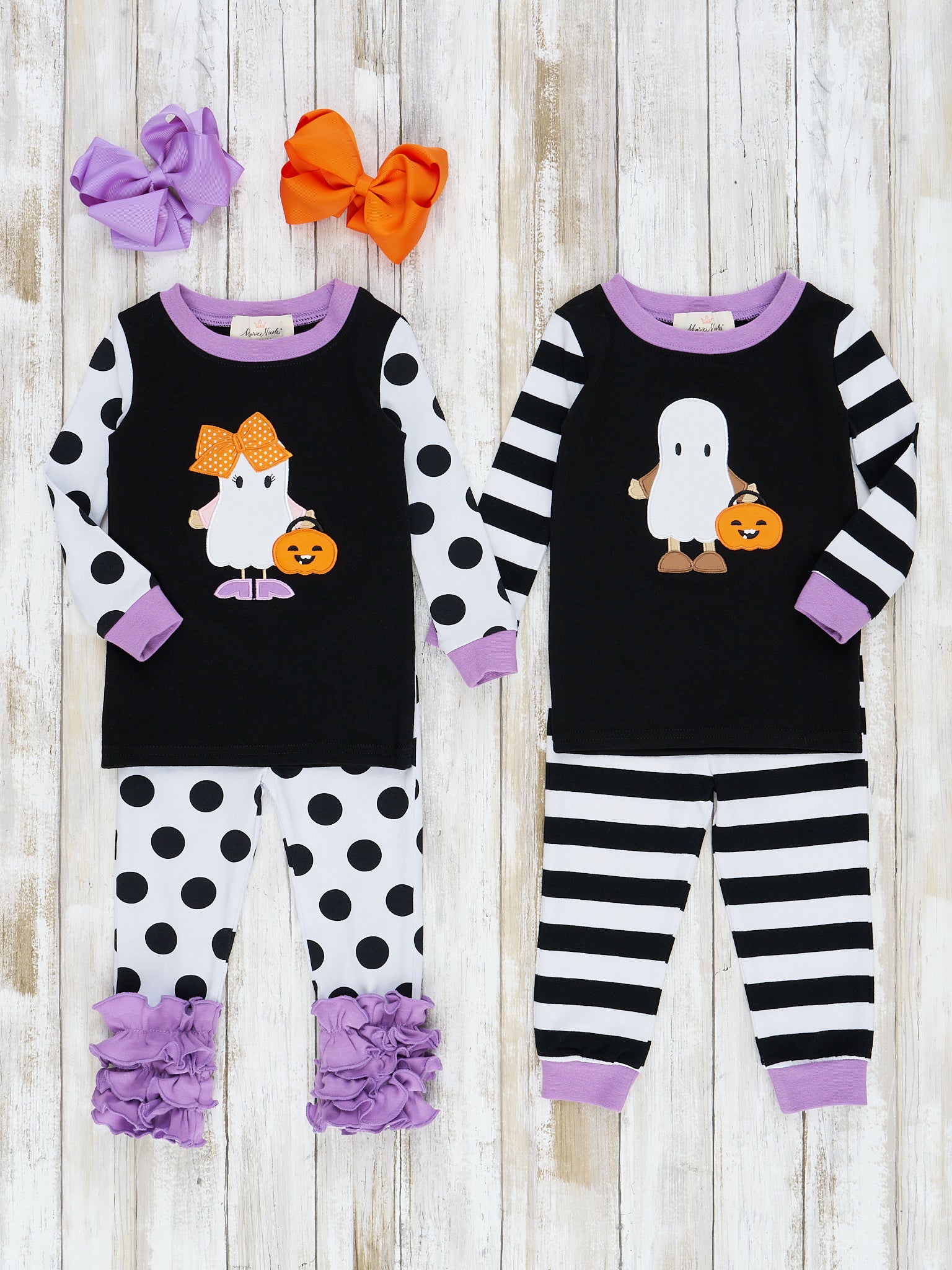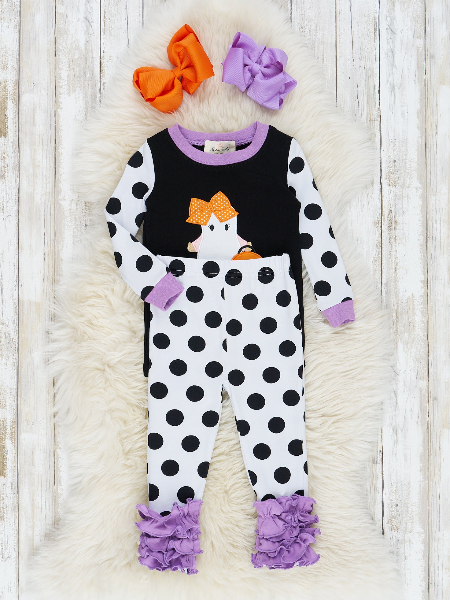 Tuck your little pumpkin in these adorable pajamas! These pajamas feature classic black and white polka dots and stripes, a ghost appliqué & contrasting purple trim with ruffle detail for girls.
