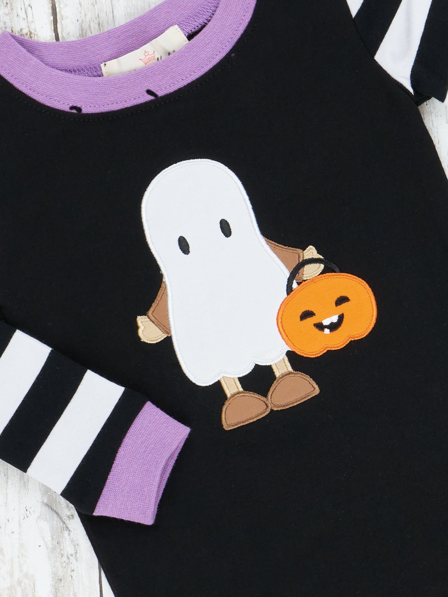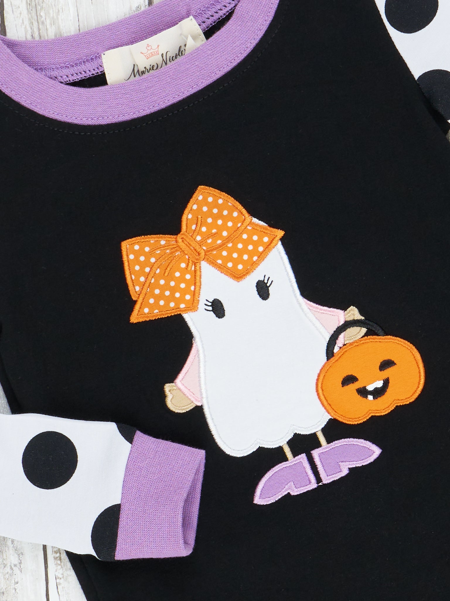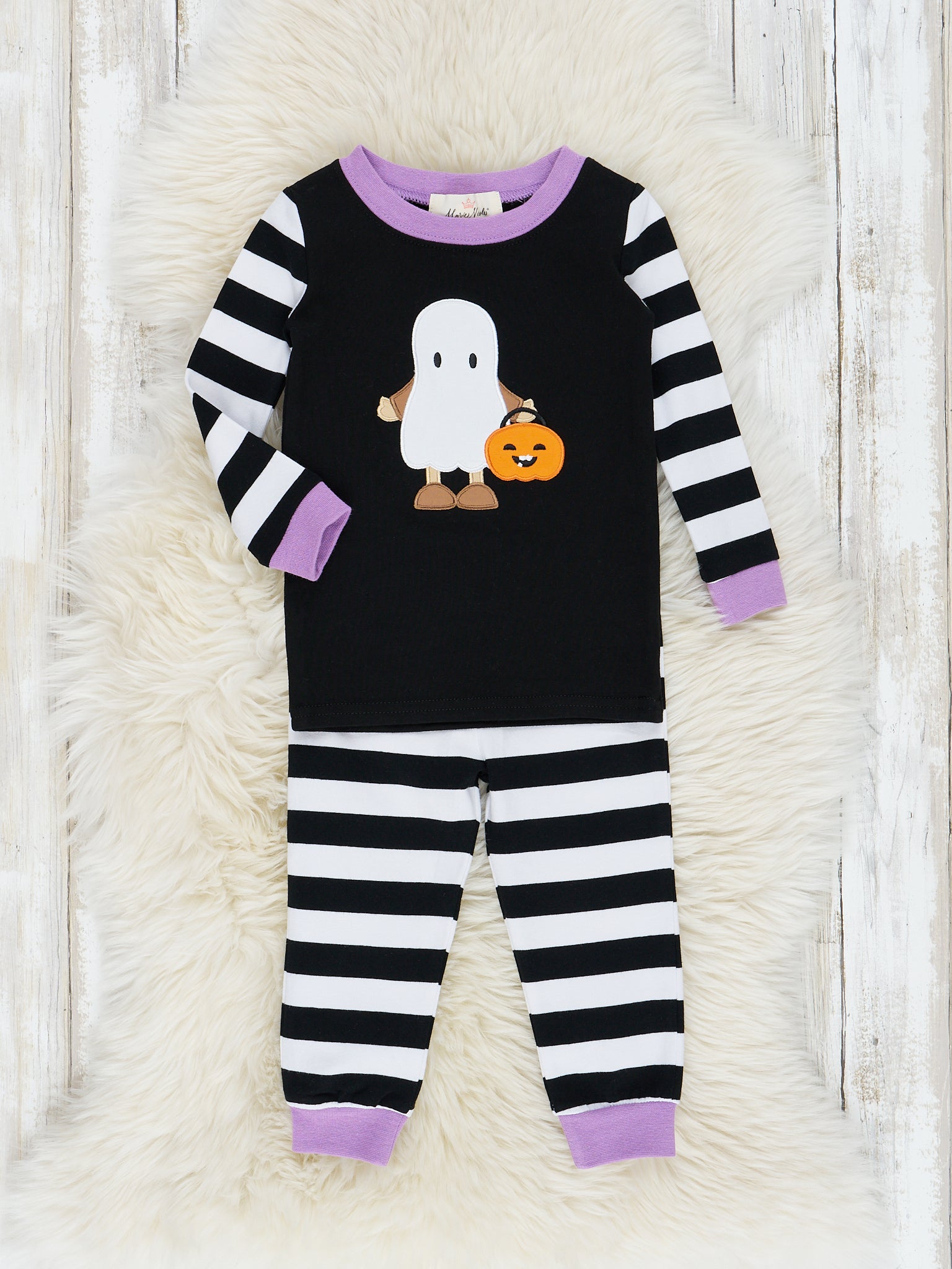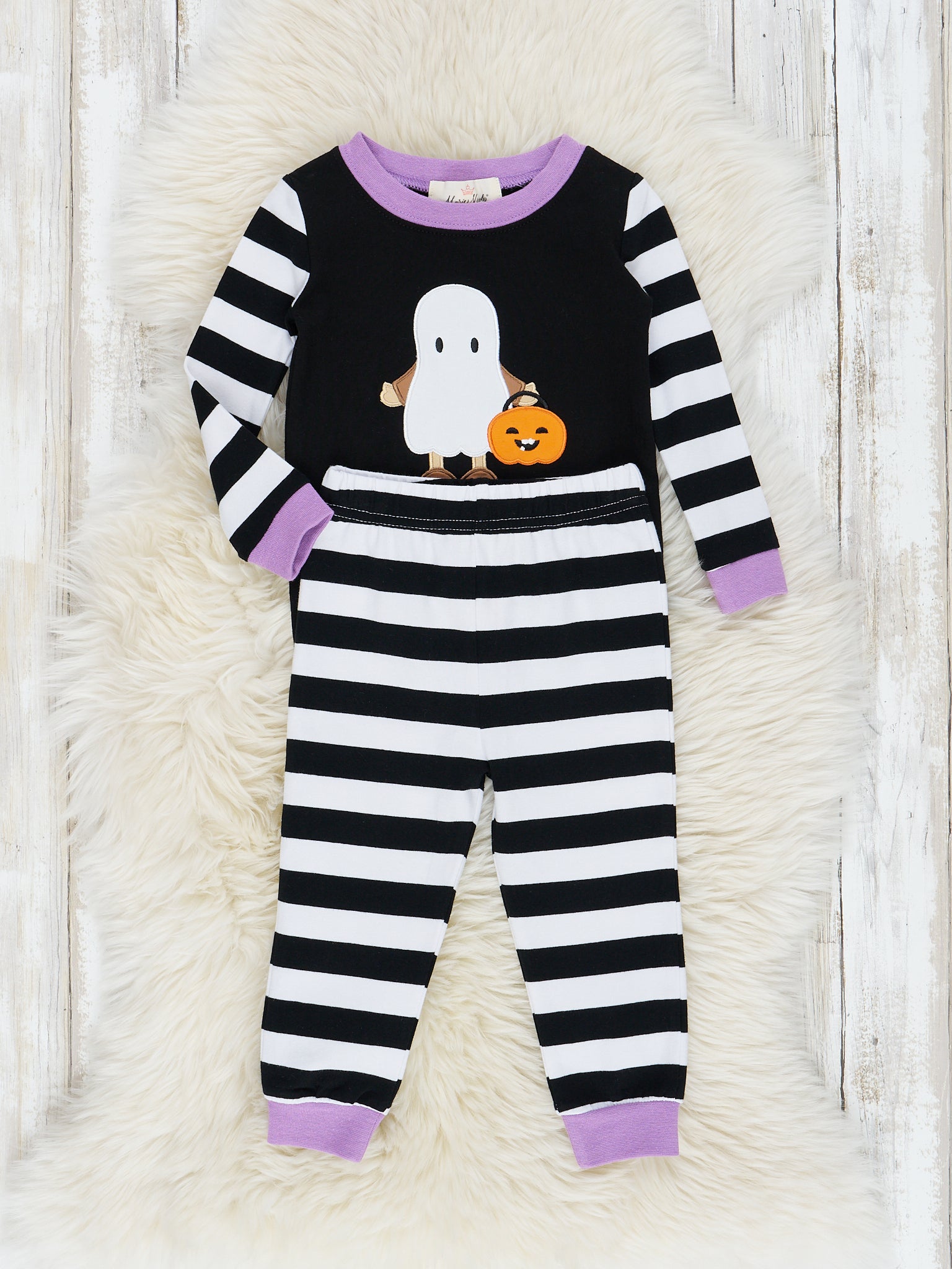 Tuck your little pumpkin in these adorable pajamas! These pajamas feature classic black and white polka dots and stripes, a ghost appliqué & contrasting purple trim with ruffle detail for girls.