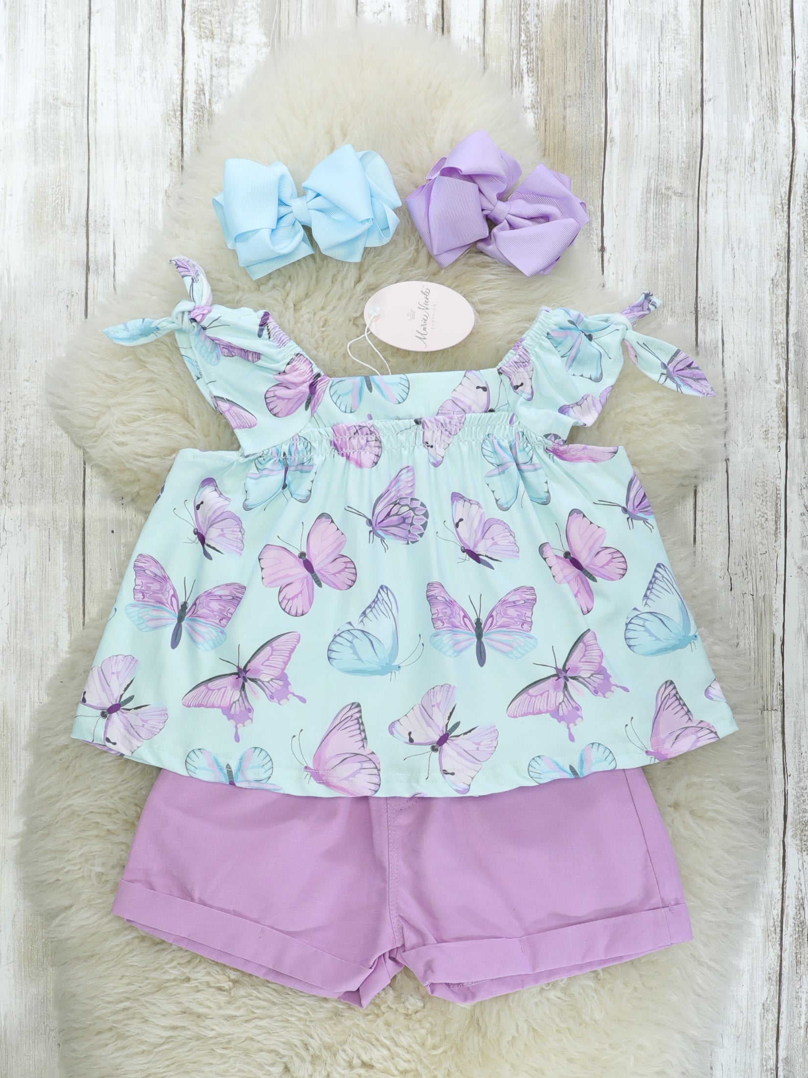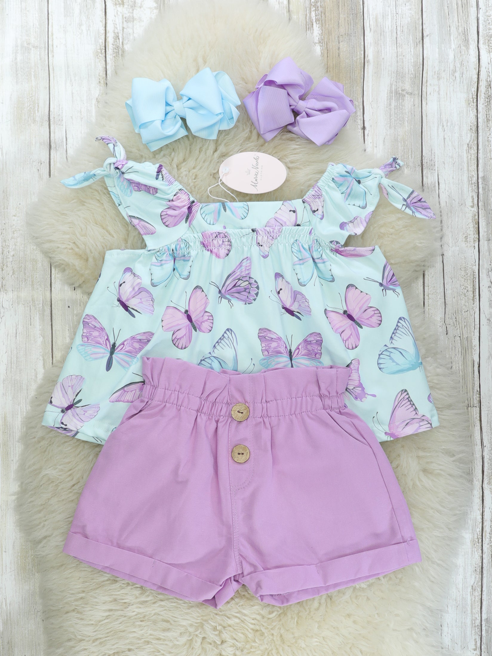 Butterfly fly away in this beautiful outfit! It features a peplum tank with adjustable ties on the shoulder & a butterfly print; the paperbag shorts have a cinched elastic waist & nonfunctional wooden buttons.