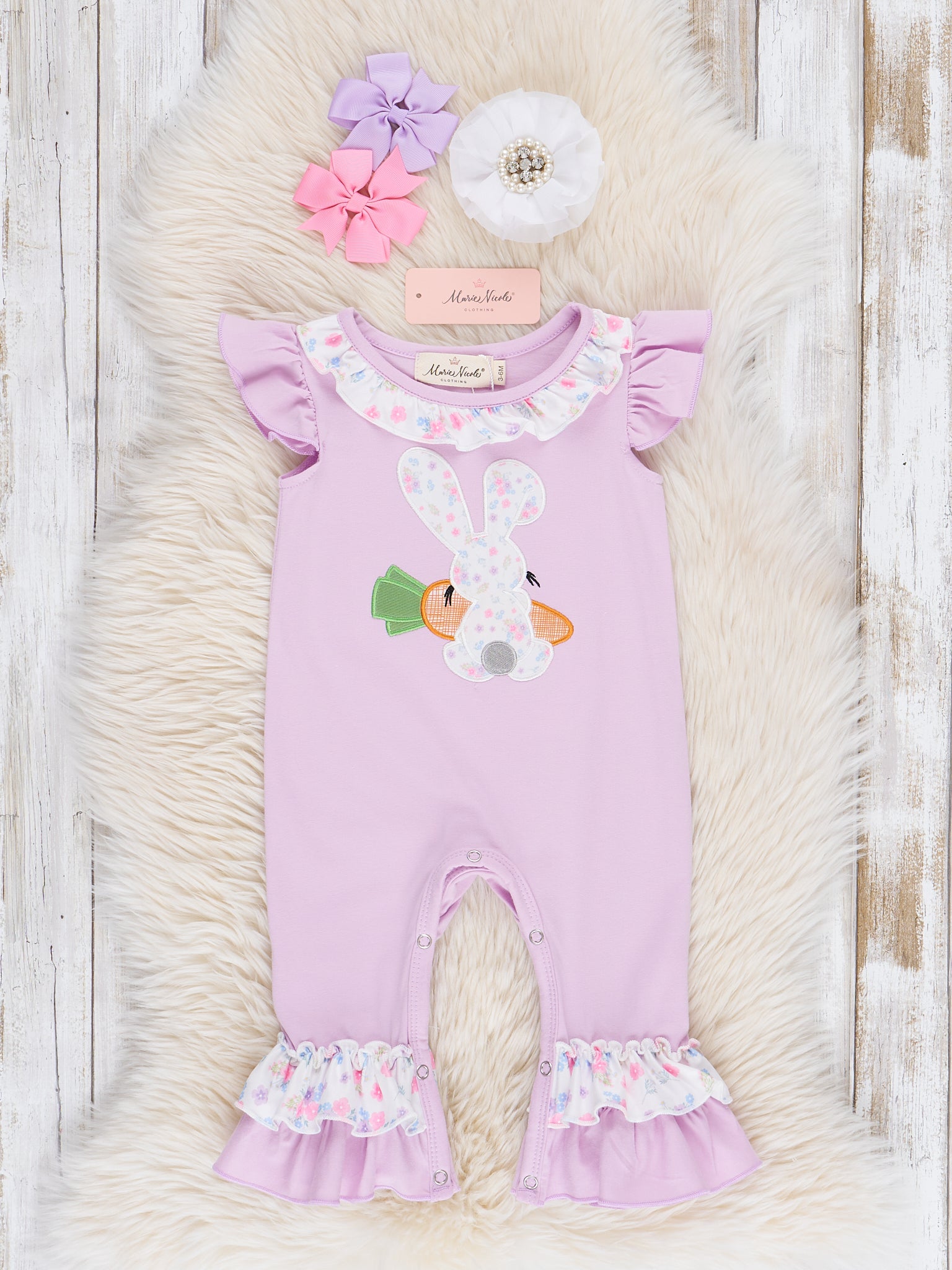 This adorable girls romper is perfect for Easter or any special occasion! Made from soft purple cotton with sweet ruffle detailing, this romper features beautiful floral accents on the bodice and embroidered bunny. Complete the look with the matching sister set from Marie Nicole Clothing. Hop into style with this charming dress!