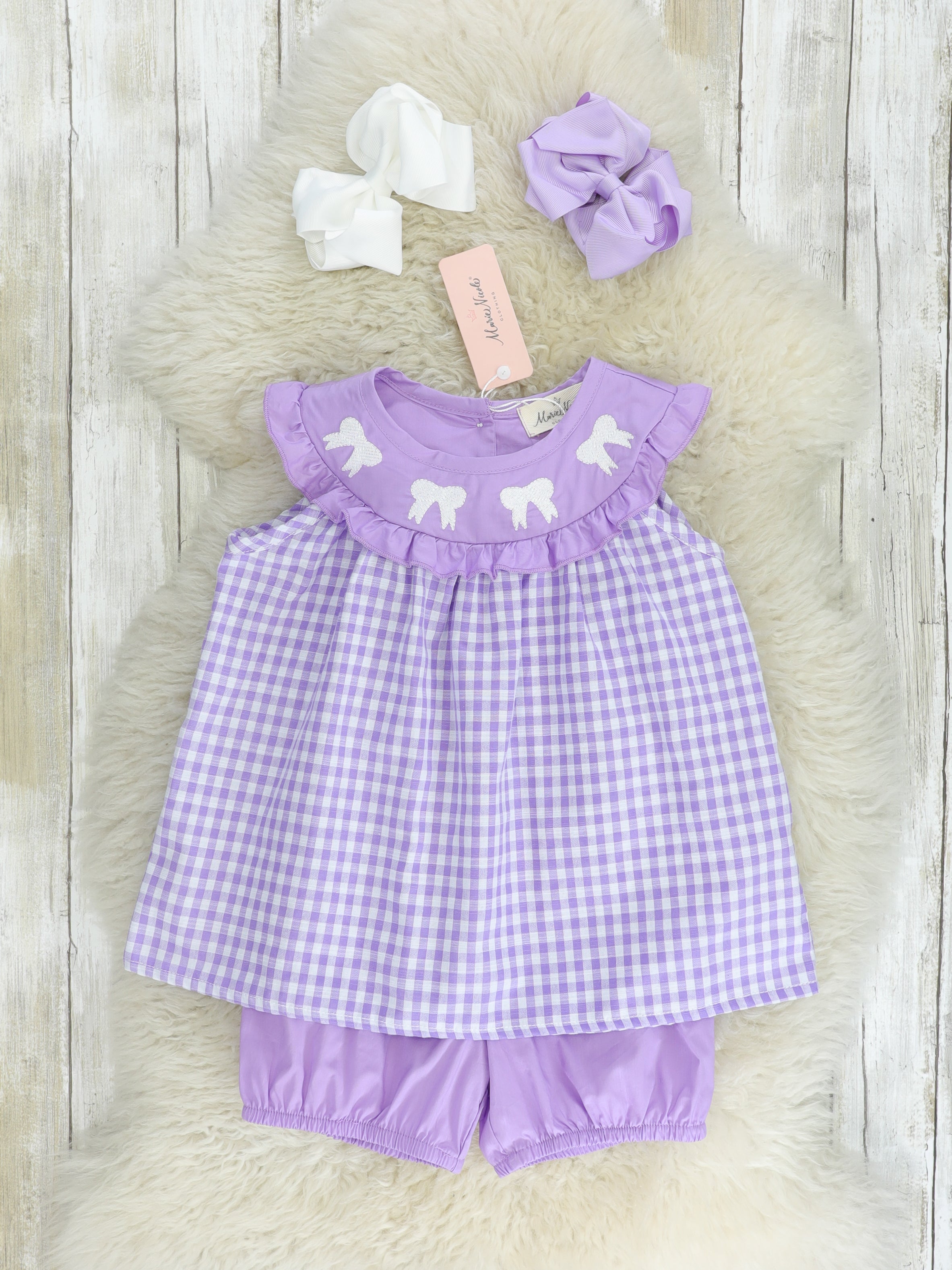 The perfect sister set for your girls who love big bows! This outfit features a purple gingham top with ruffle trim, the sweetest embroidered bow, & purple ruffle shorts with an elastic waistband.