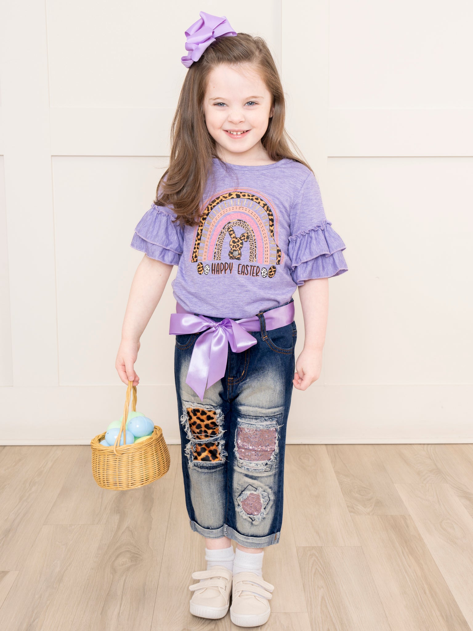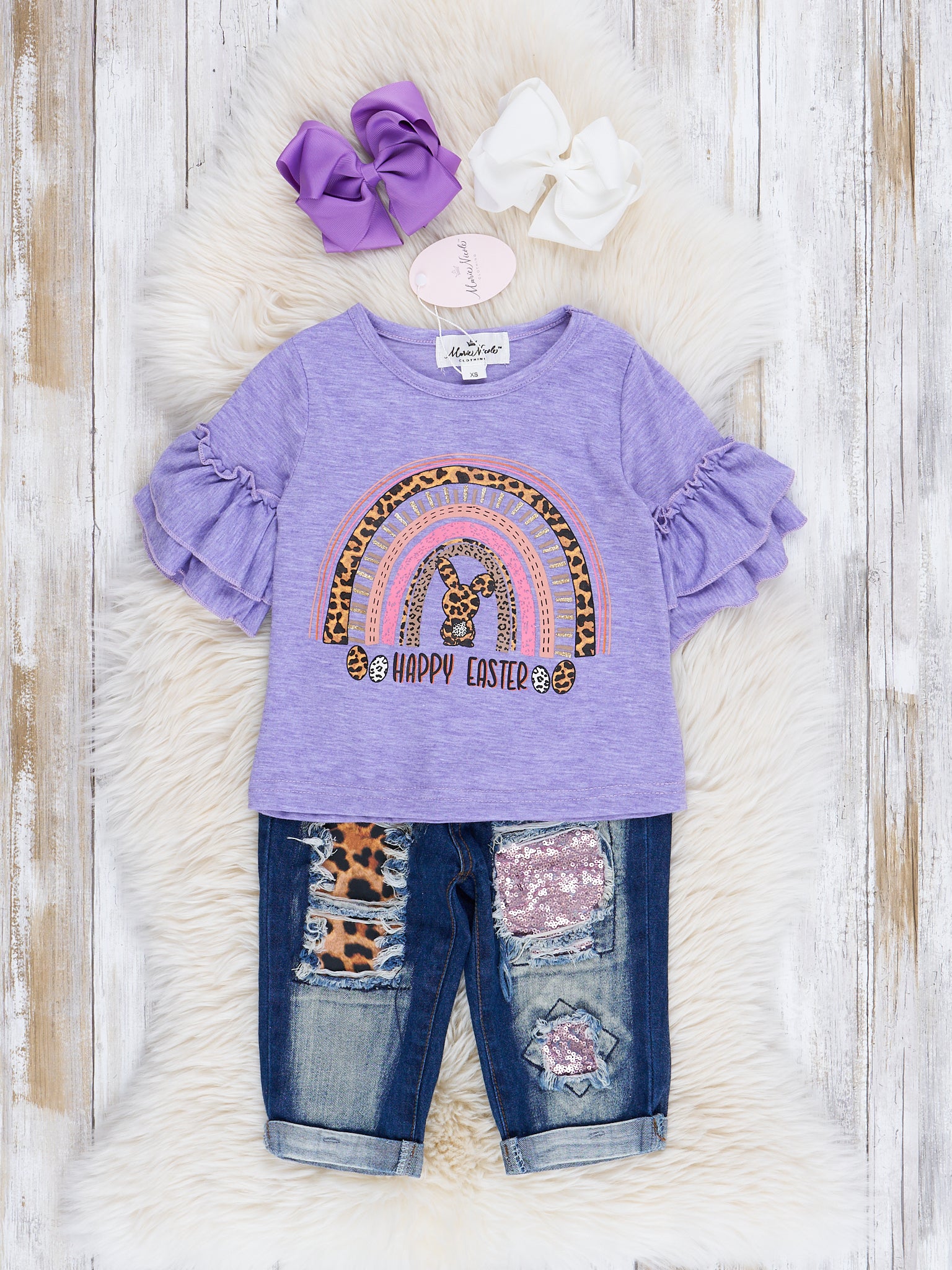 You've spotted the cutest Easter outfit! This outfit features a purple top with layered ruffles, a darling leopard rainbow, a "Happy Easter" detail, denim pants with sequin patches, & a purple ribbon belt.