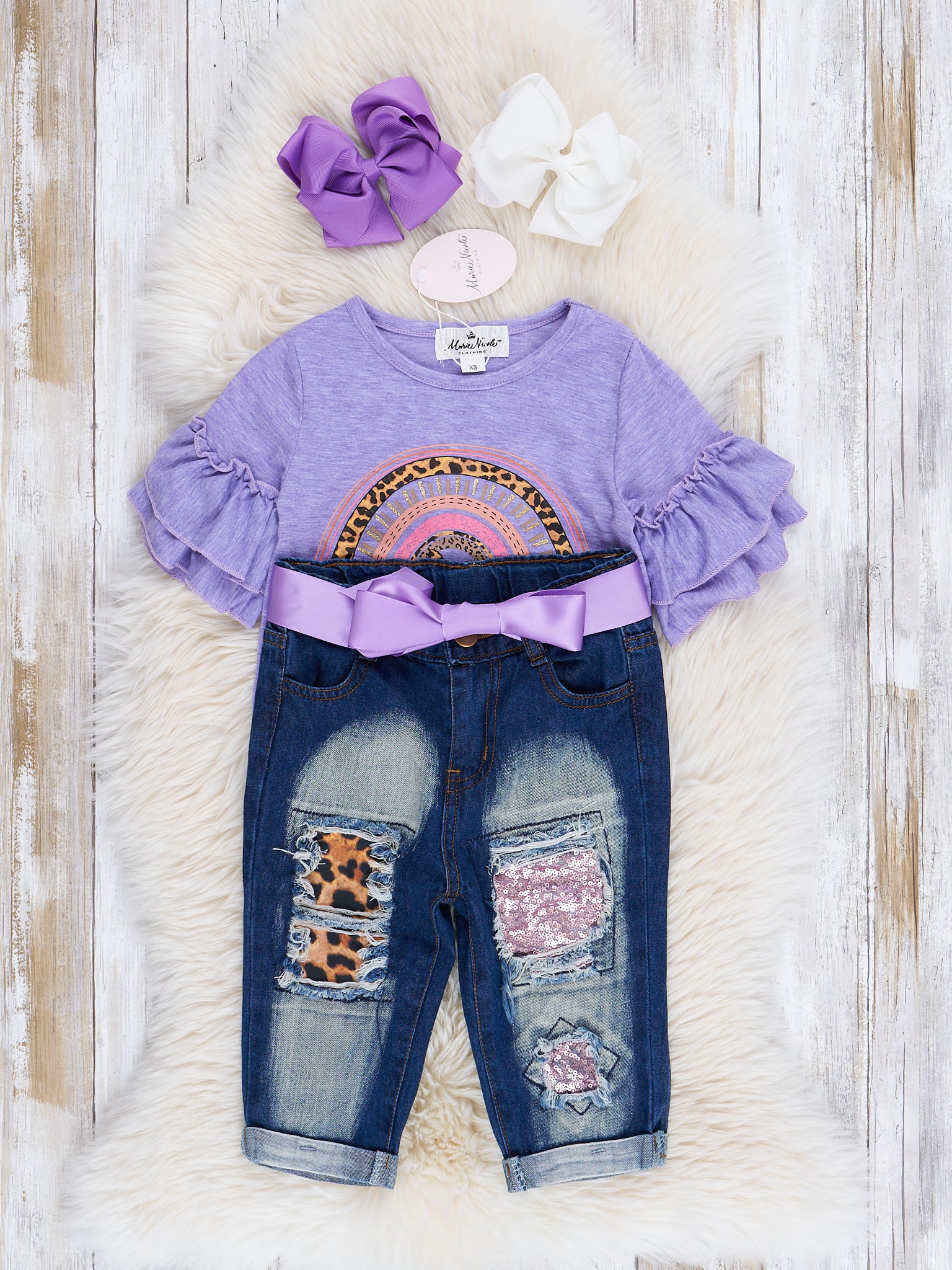 Purple Leopard Rainbow Ruffle Top & Distressed Denim Outfit