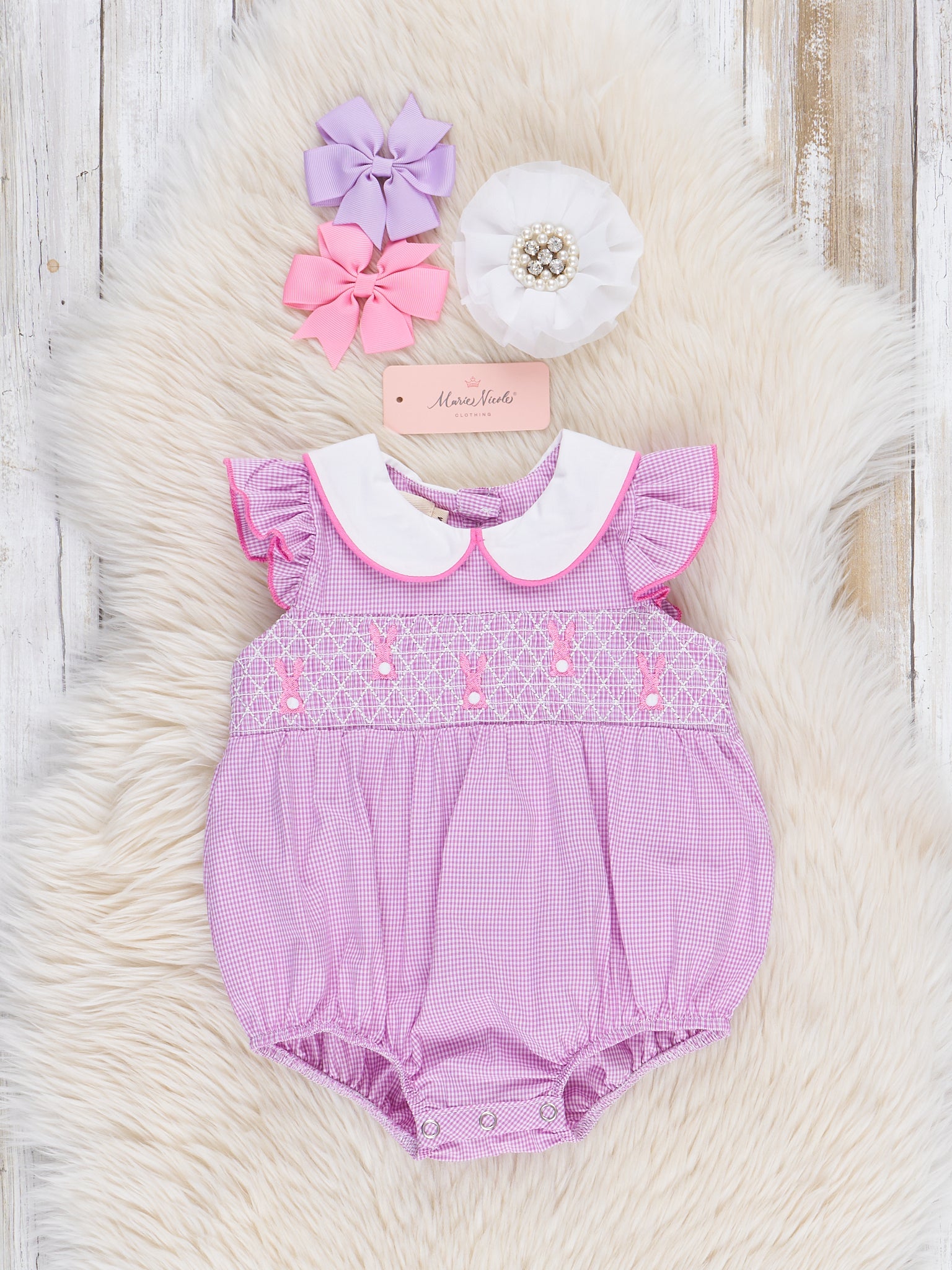 Hop into spring with our Purple Smocked Bunnies Ruffle Bubble! This adorable girls bubble by Marie Nicole Clothing features charming pink embroidered bunnies over delicate smocking, creating a playful Easter look. Made with soft purple fabric and finished with a peter pan collar and pink trim, it's the perfect addition to your little one's wardrobe. Complete the look with our matching sister set. Hop to it!
