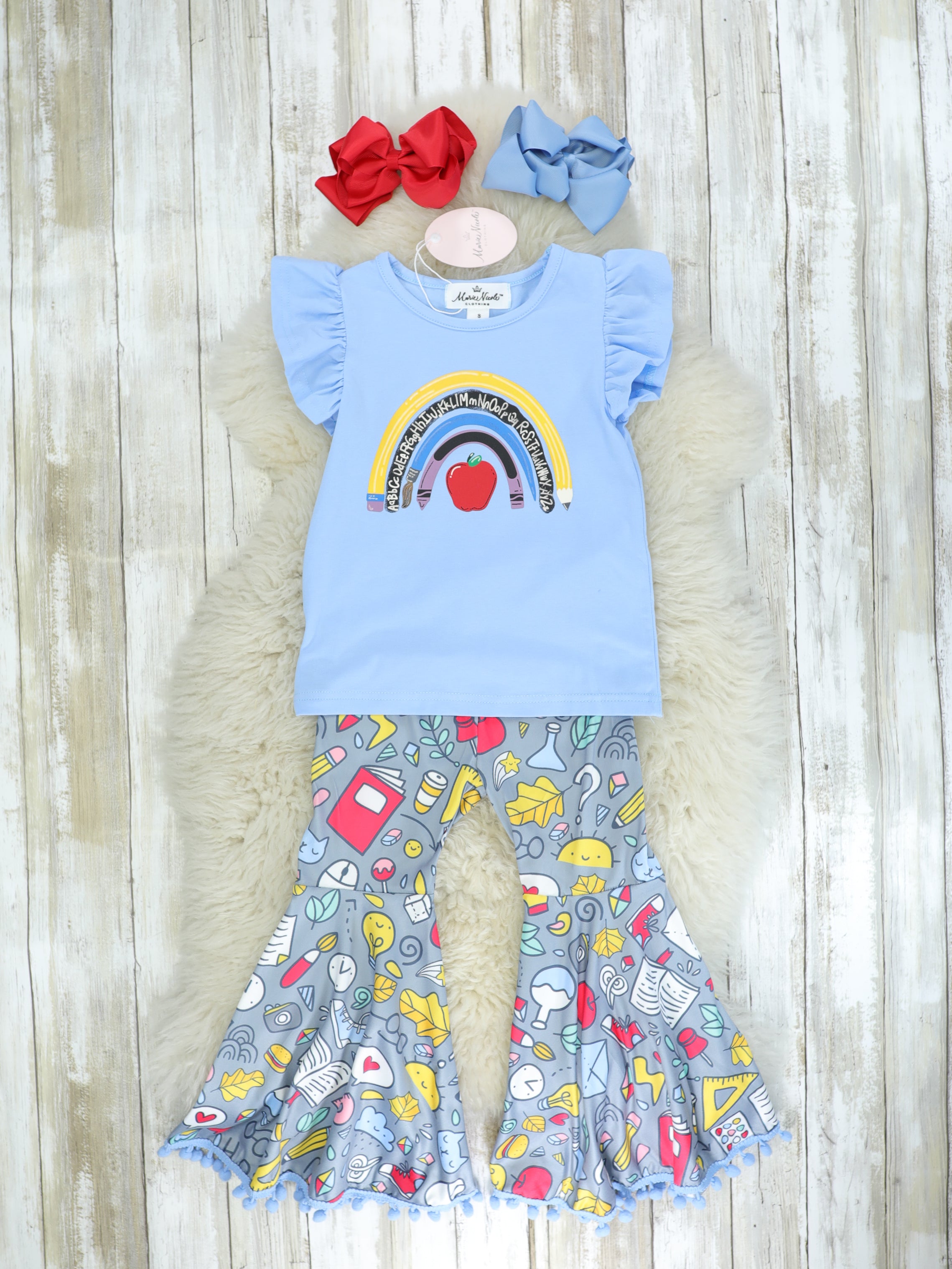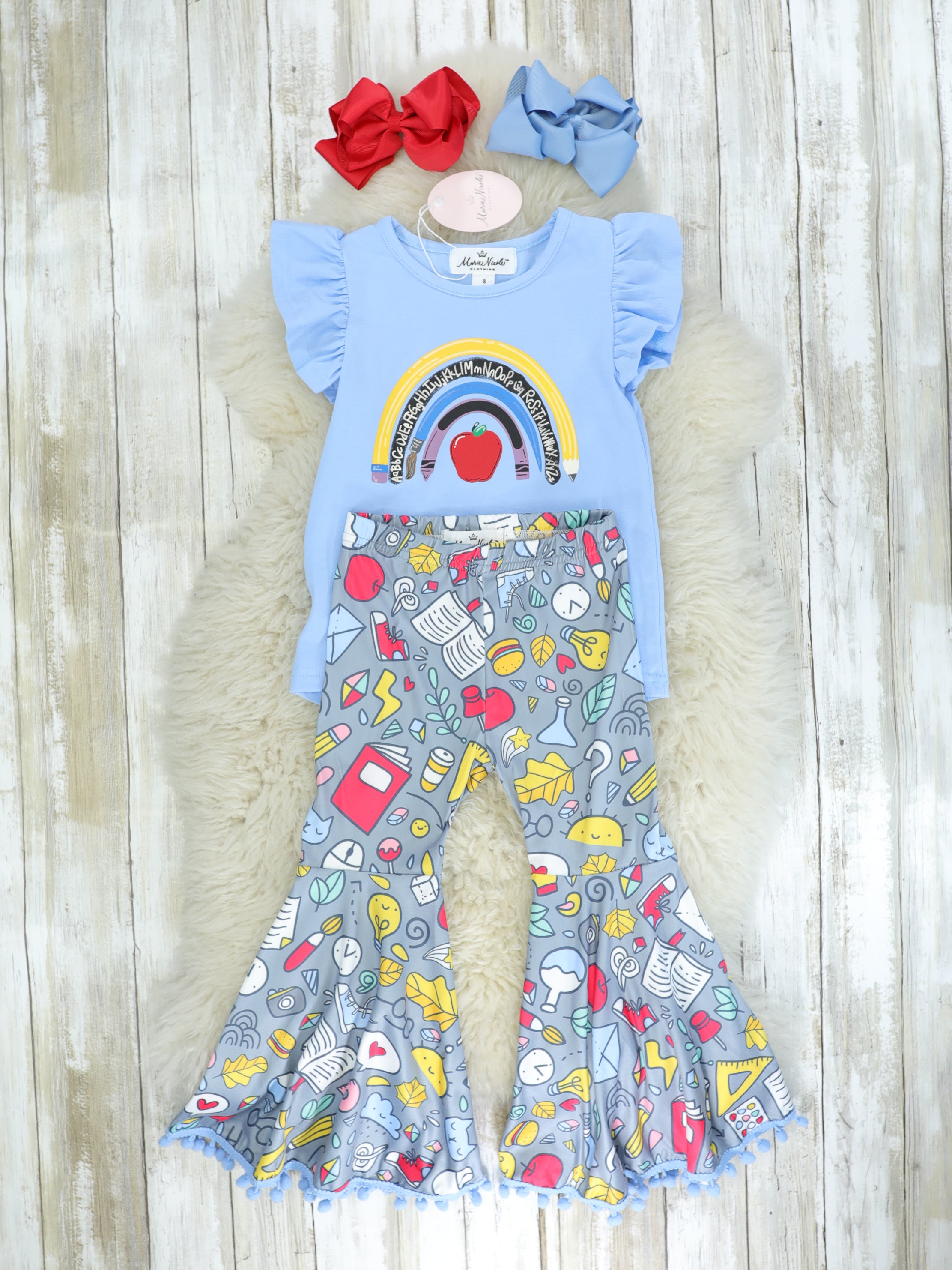 Our most favorite groovy back to school outfit yet! Featuring a vinyl rainbow decal with a pencil, the alphabet, paint brush, crayon and apple with ruffle sleeves on the top and multi print school supplies bell bottoms with blue pom pom trim.