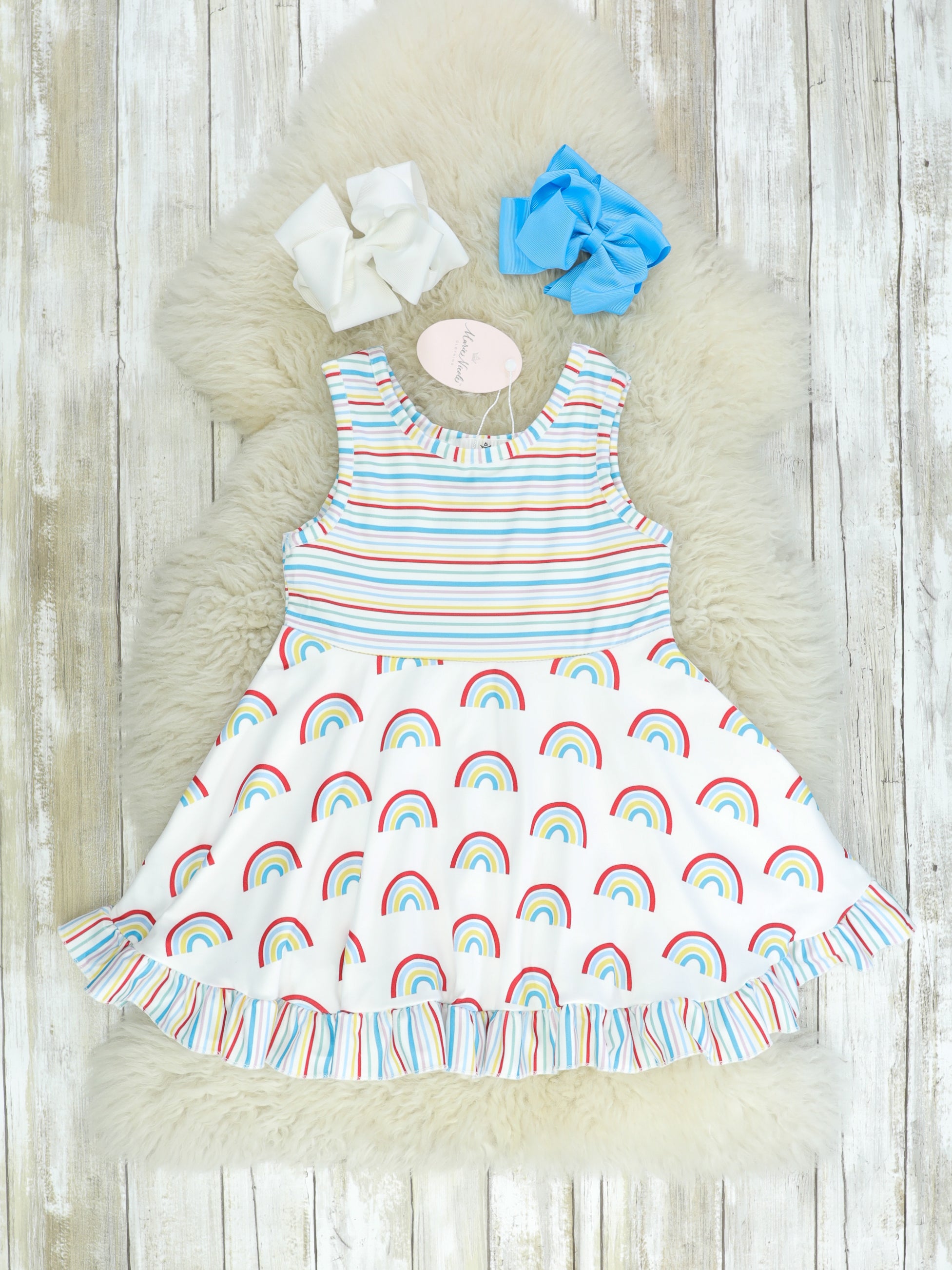 The perfect sibling set for the littles who brighten your day! This rainbow dress features stripes, a rainbow pattern, & sweet ruffles lining the bottom.