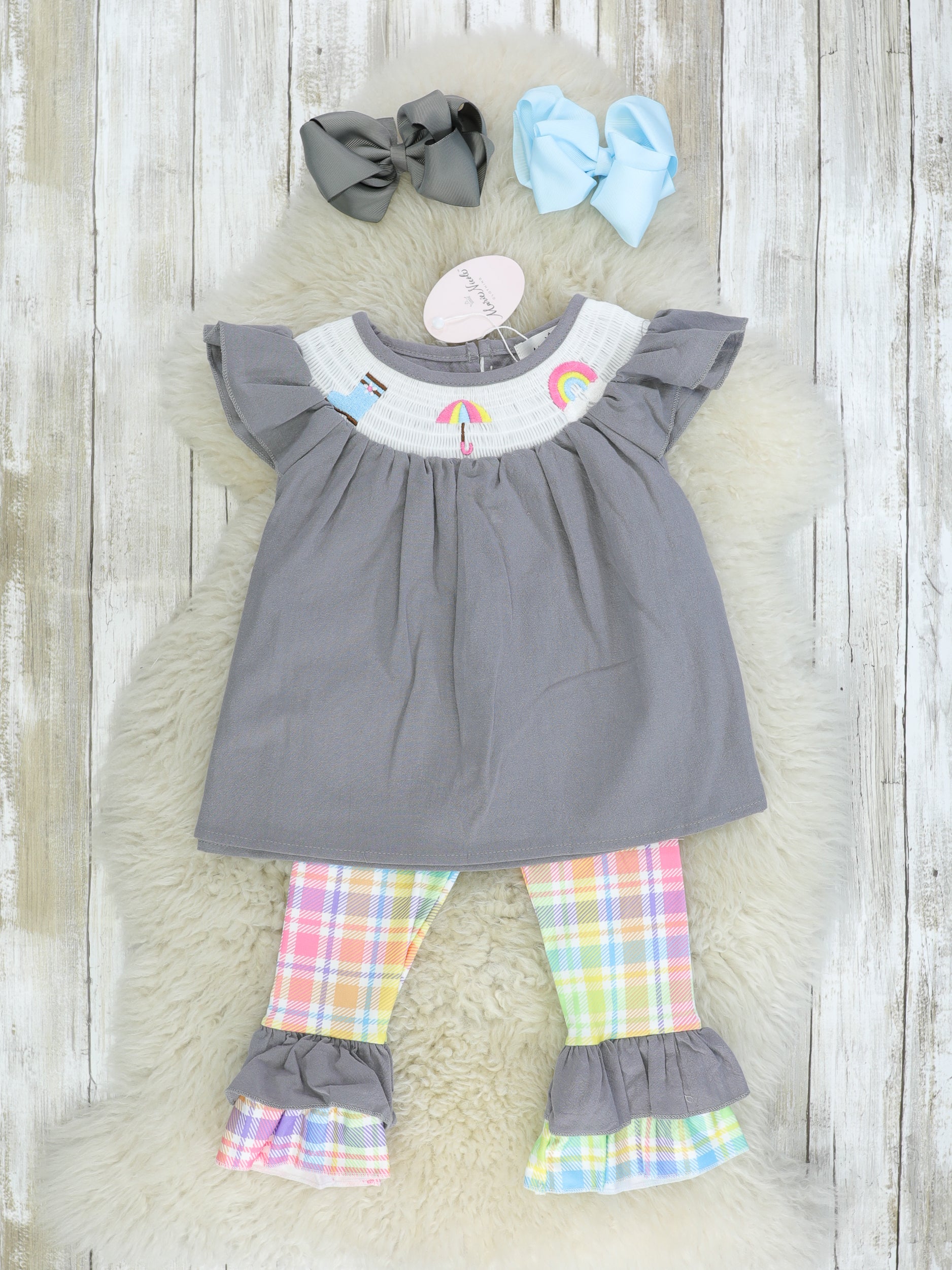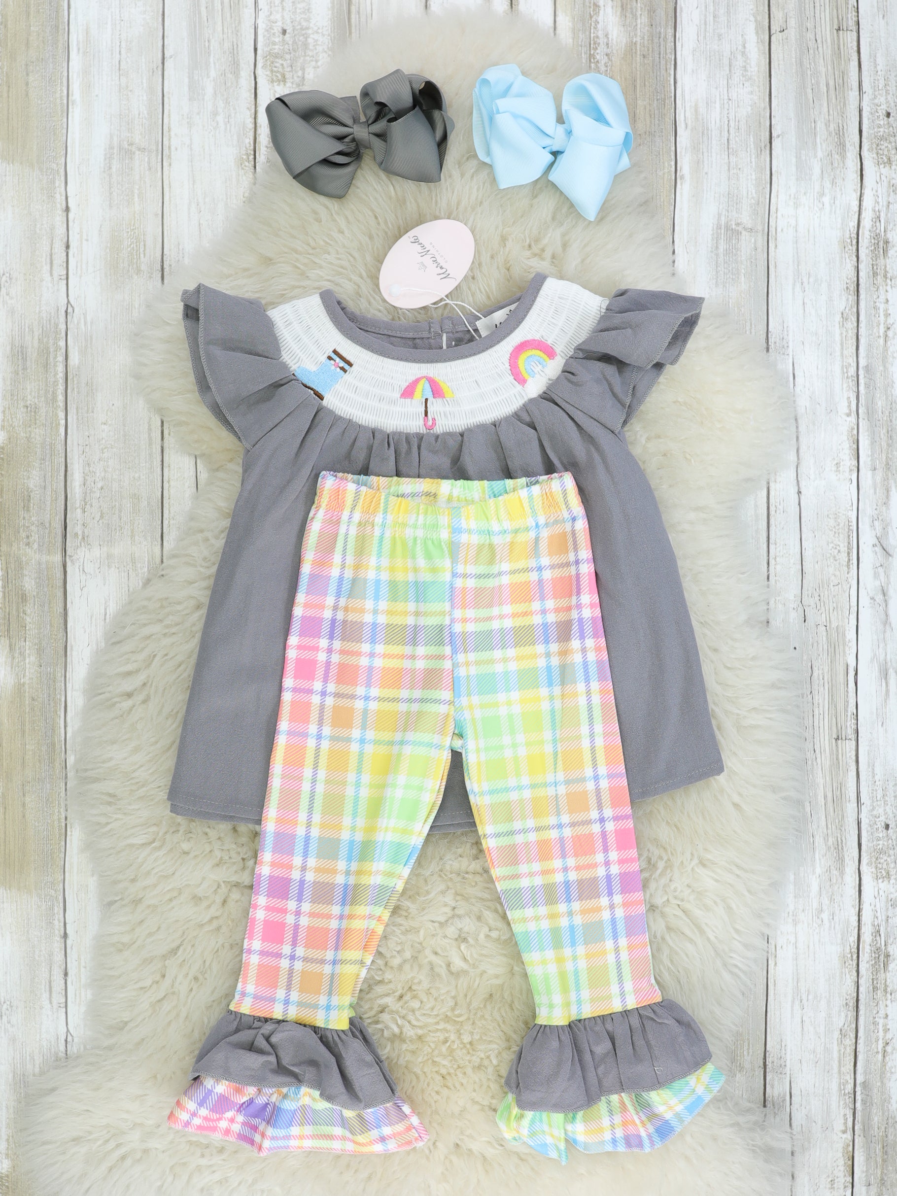 Save this sibling set for a rainy day! ☔️ This outfit features a smocked grey swing top & the prettiest bright plaid patterned bottoms.