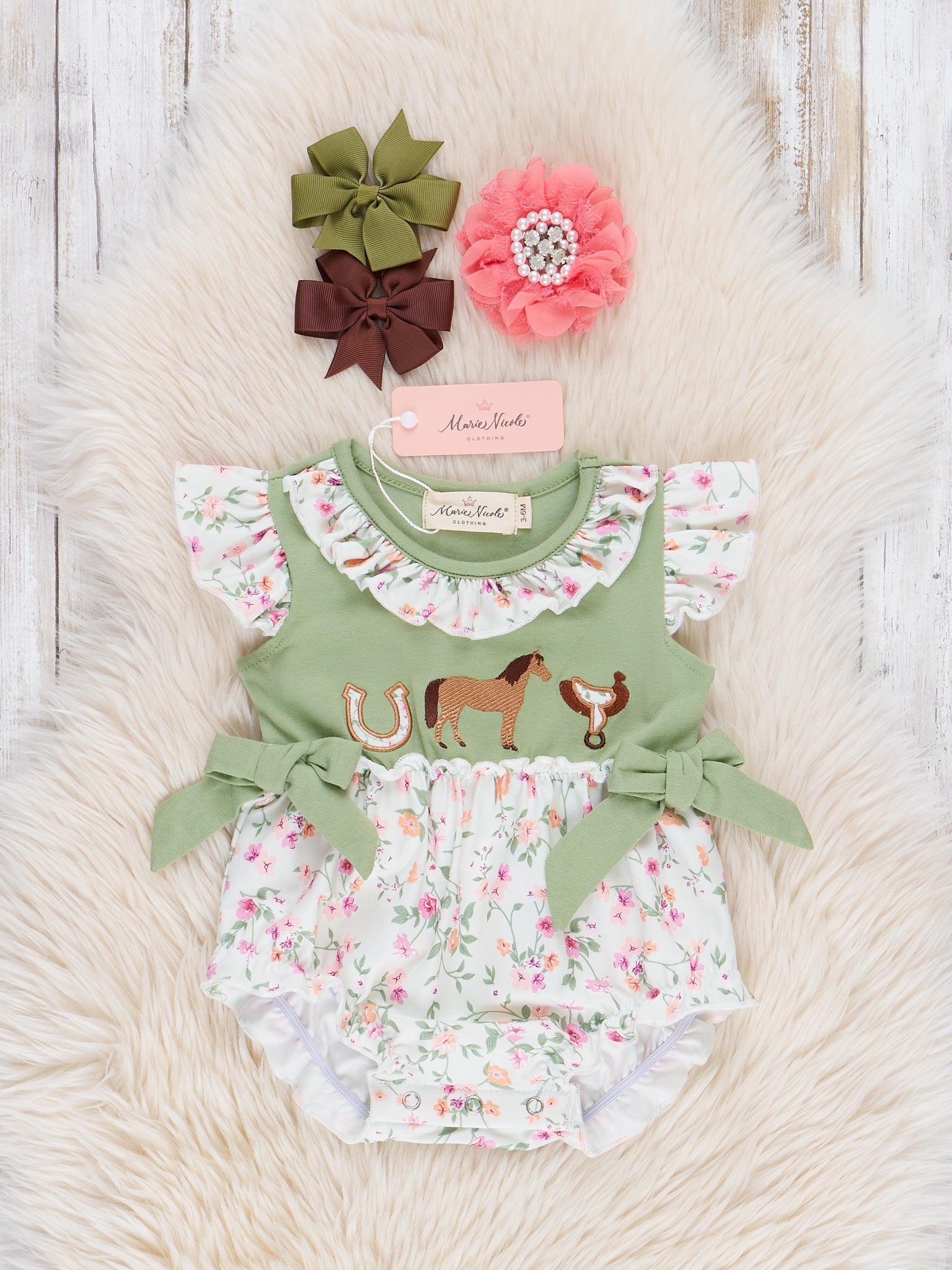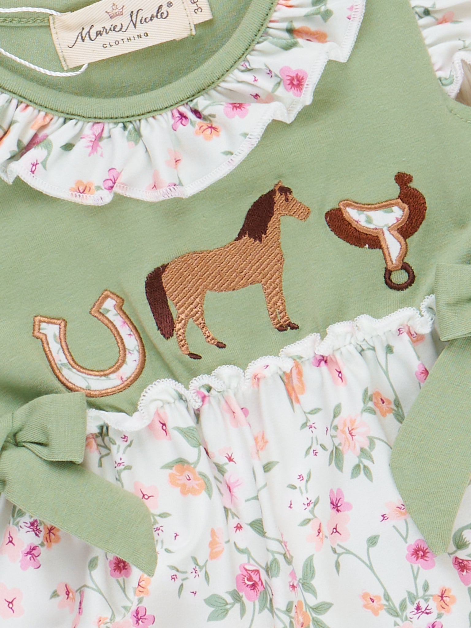 The Ranch Friends Floral Ruffle Bubble brings country charm to your little one’s wardrobe. Featuring a delightful mix of blooming florals with equestrian style, this sweet bubble includes a ruffle detailing and flutter sleeves top for a comfy look. This bubble from Marie Nicole is perfect for playdates, picnics, or a day on the farm.