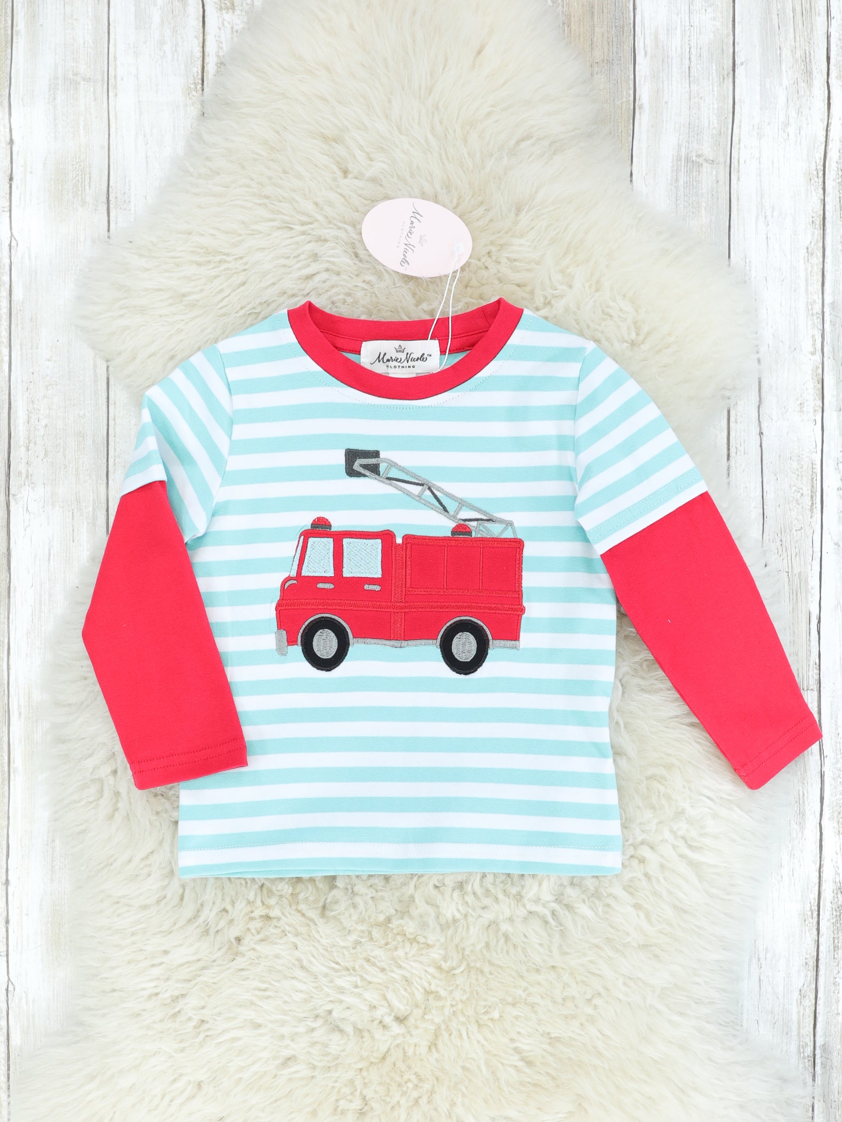 Red & Turquoise Striped Firetruck Shirt