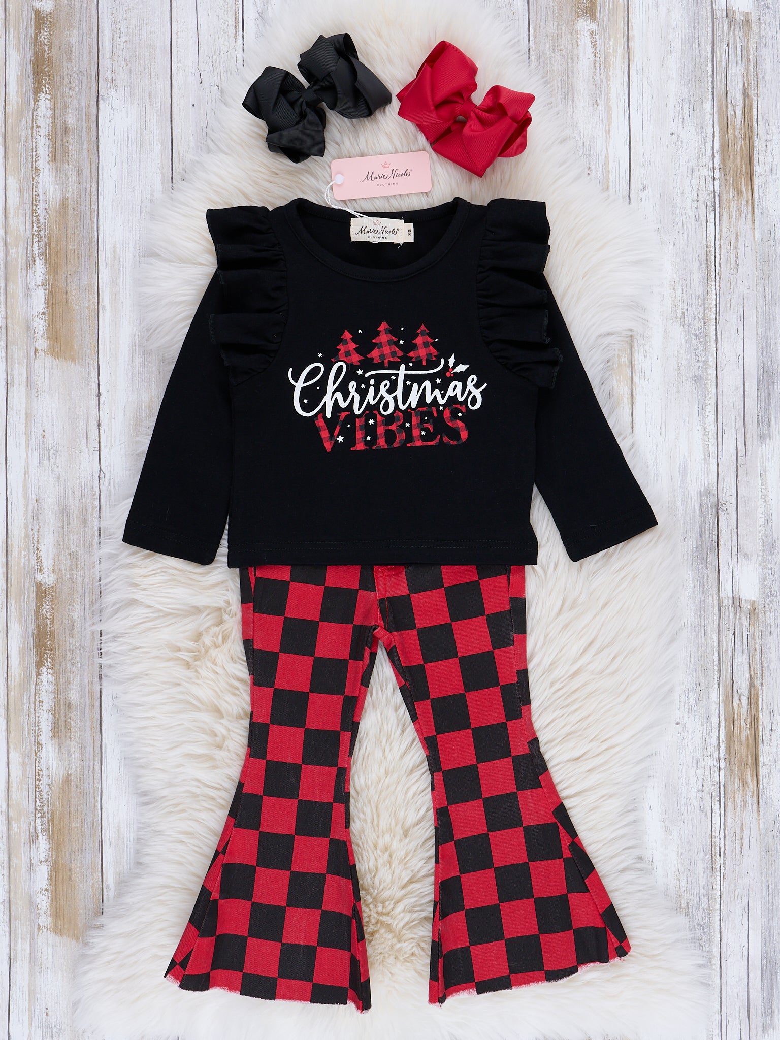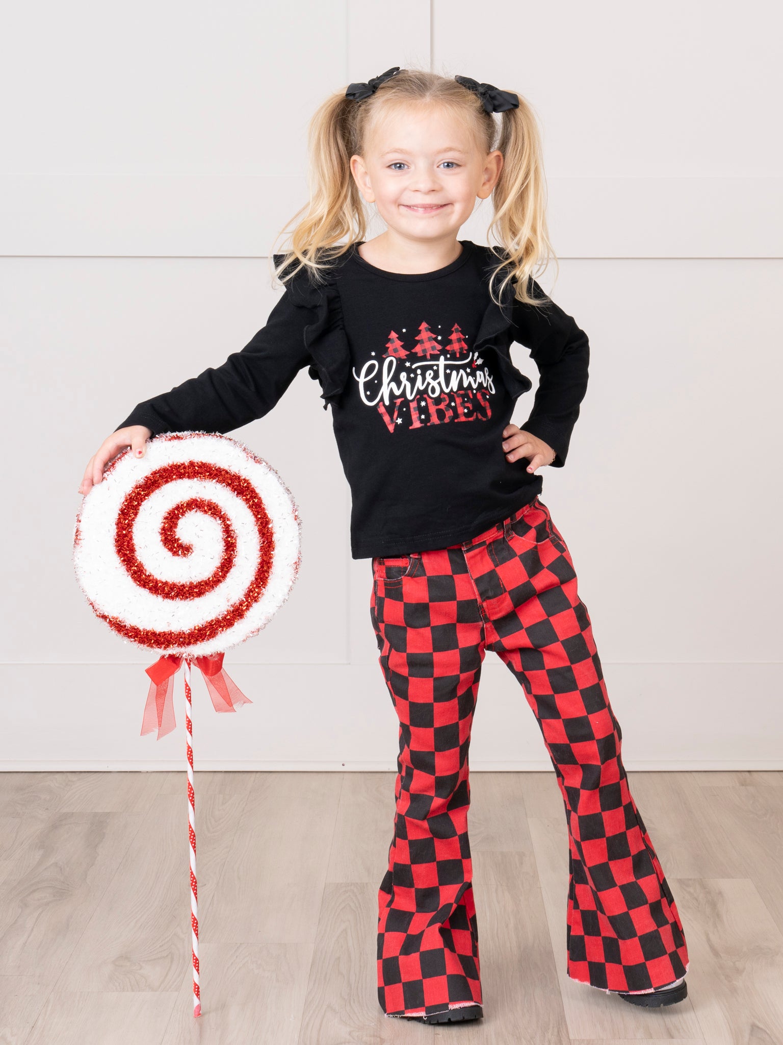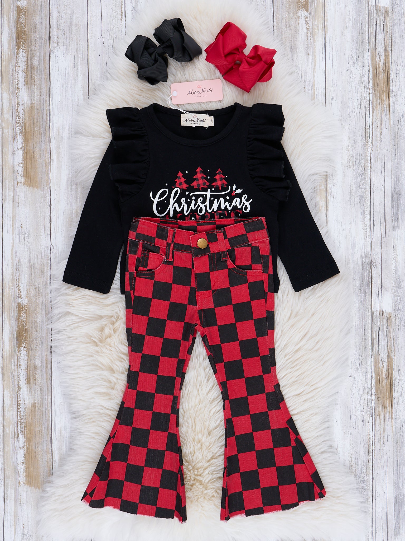 Your mini will bring all the Christmas vibes with this outfit featuring a ruffle sleeve crew neck top paired with black & red checkered bell bottoms.