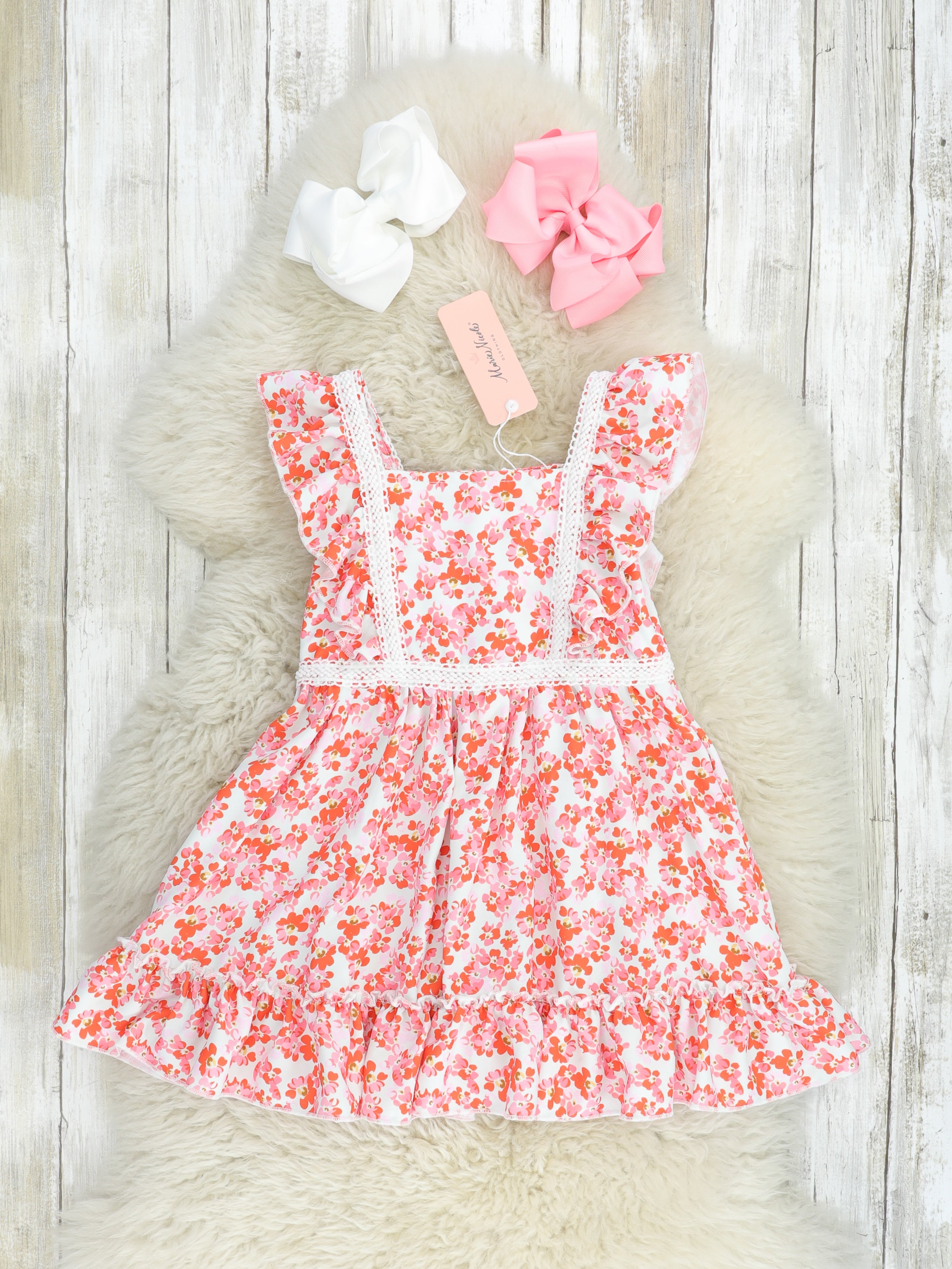 A delightful dress for your little blossom! This dress features gorgeous red blossoms, flutter sleeves, ruffles, & crochet trim.