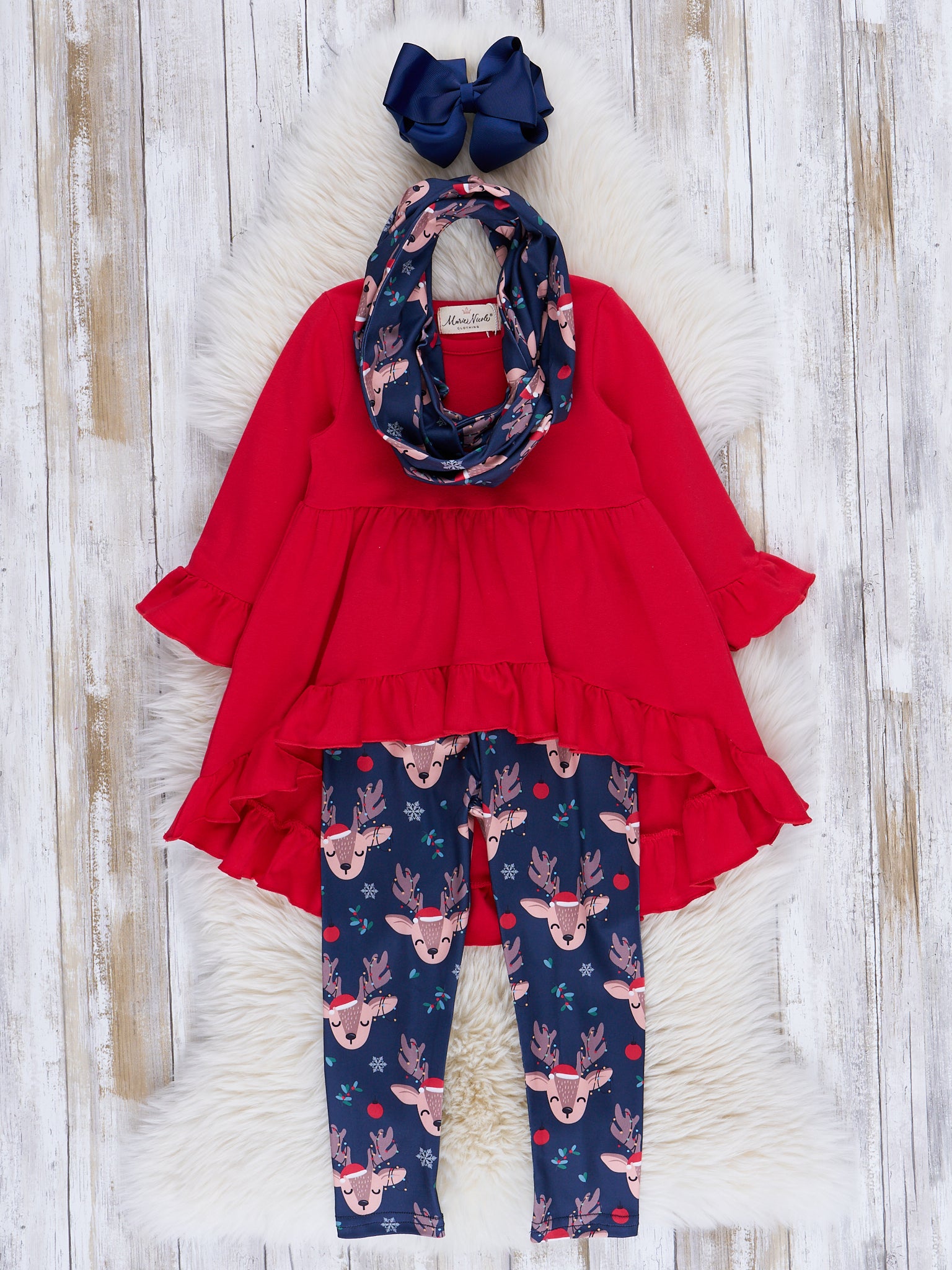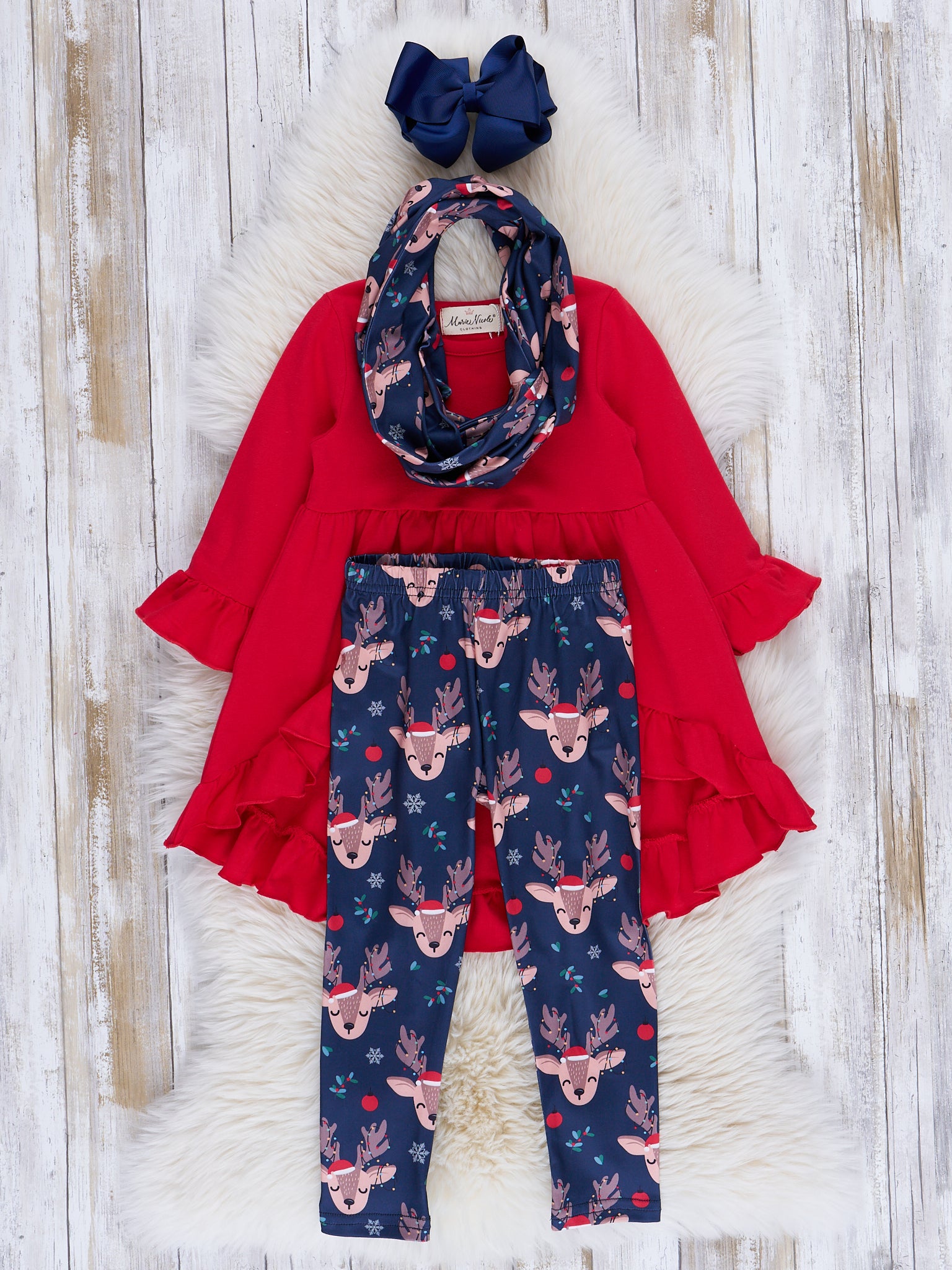 This outfit is a burst of holiday joy, featuring a radiant red hi-lo top with adorable ruffle details and navy leggings adorned with prancing reindeer. But wait, there's more! The matching scarf ties it all together in cozy cuteness. It's not just an outfit; it's a festive fashion statement that says, "I'm ready for the season!" 🌟👧❤️